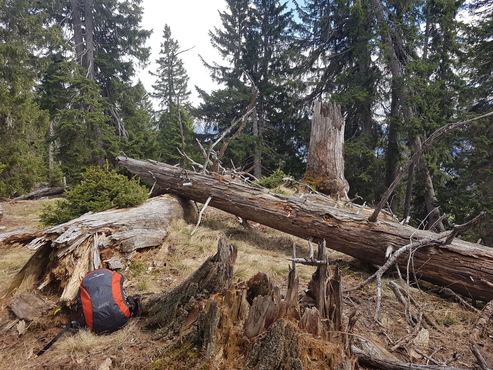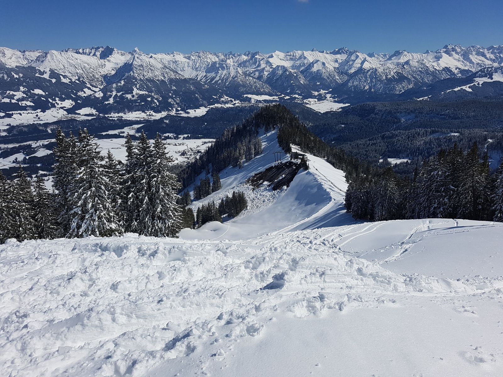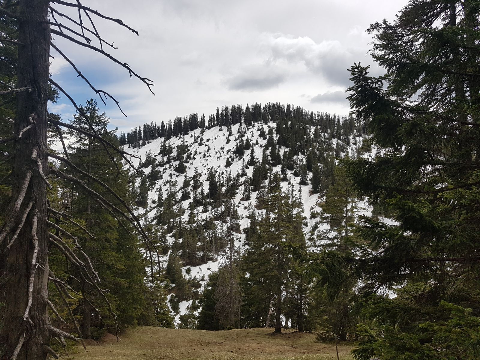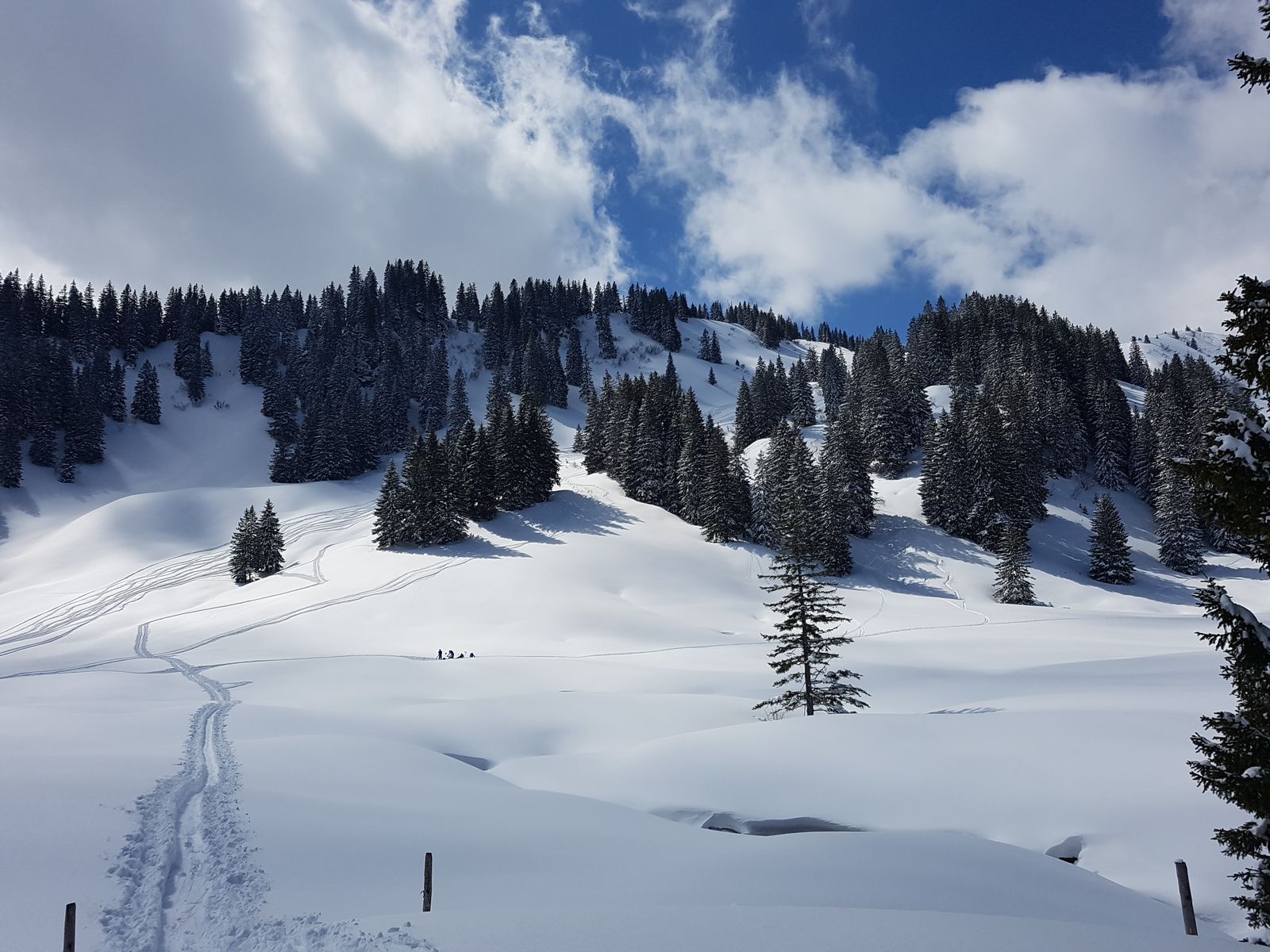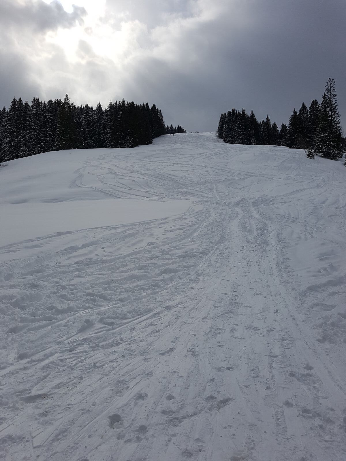 Am Abend vorher hatte es geregnet. Die Frühaufsteher sind auf recht hartem Schnee aufgestiegen, und dann im Bruchharsch abgefahren. Die, die wie ich erst gegen 8 Uhr dran waren, sind im Aufstieg eingebrochen und dann im Sulz abgefahren. Der Schartenkopf hat dabei den Vorteil, dass seine Hänge überwiegend nord/westseitig sind und deshalb nicht ganz so schnell weich werden wie die vom Sulzkogel. Hier der mittlere Teil der oben erwähnten S-Kurve, da waren die Schneebedingungen deutlich besser.