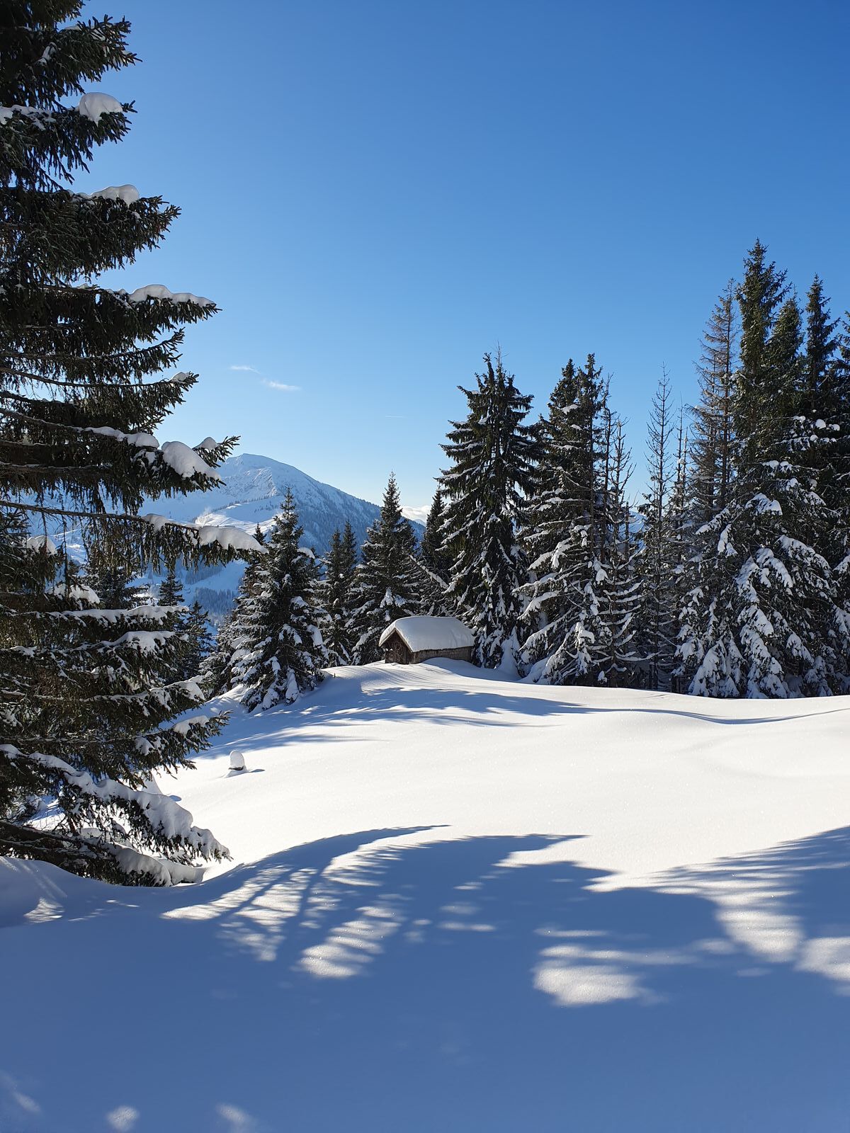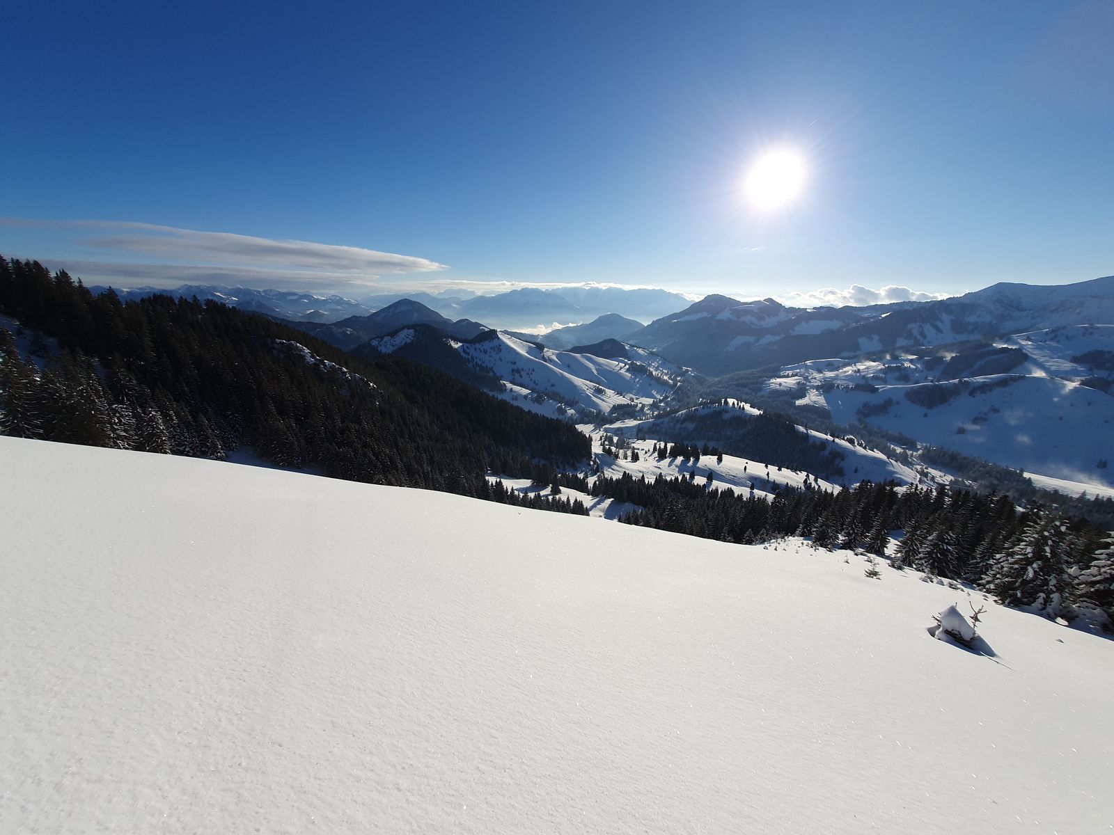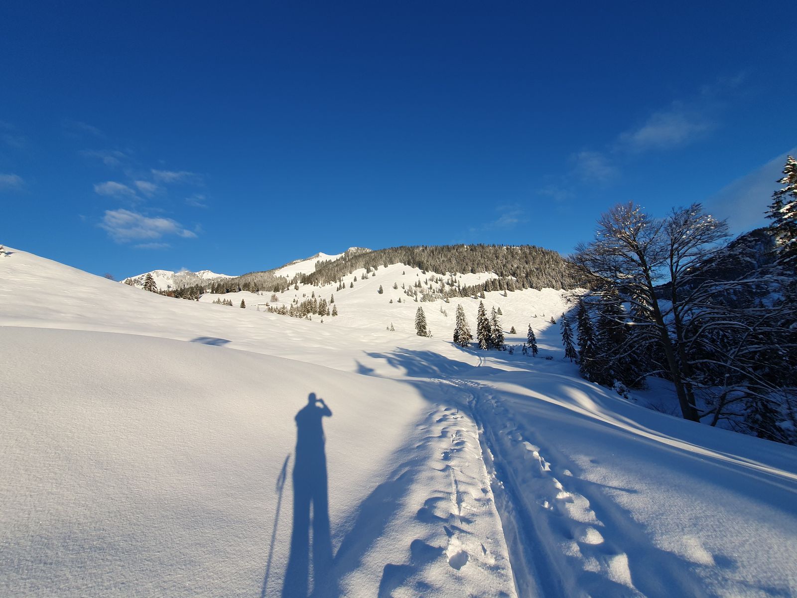Es hatte etwas geschneit, war dennoch nicht sooo viel mehr da. Rechts und links im Wald.