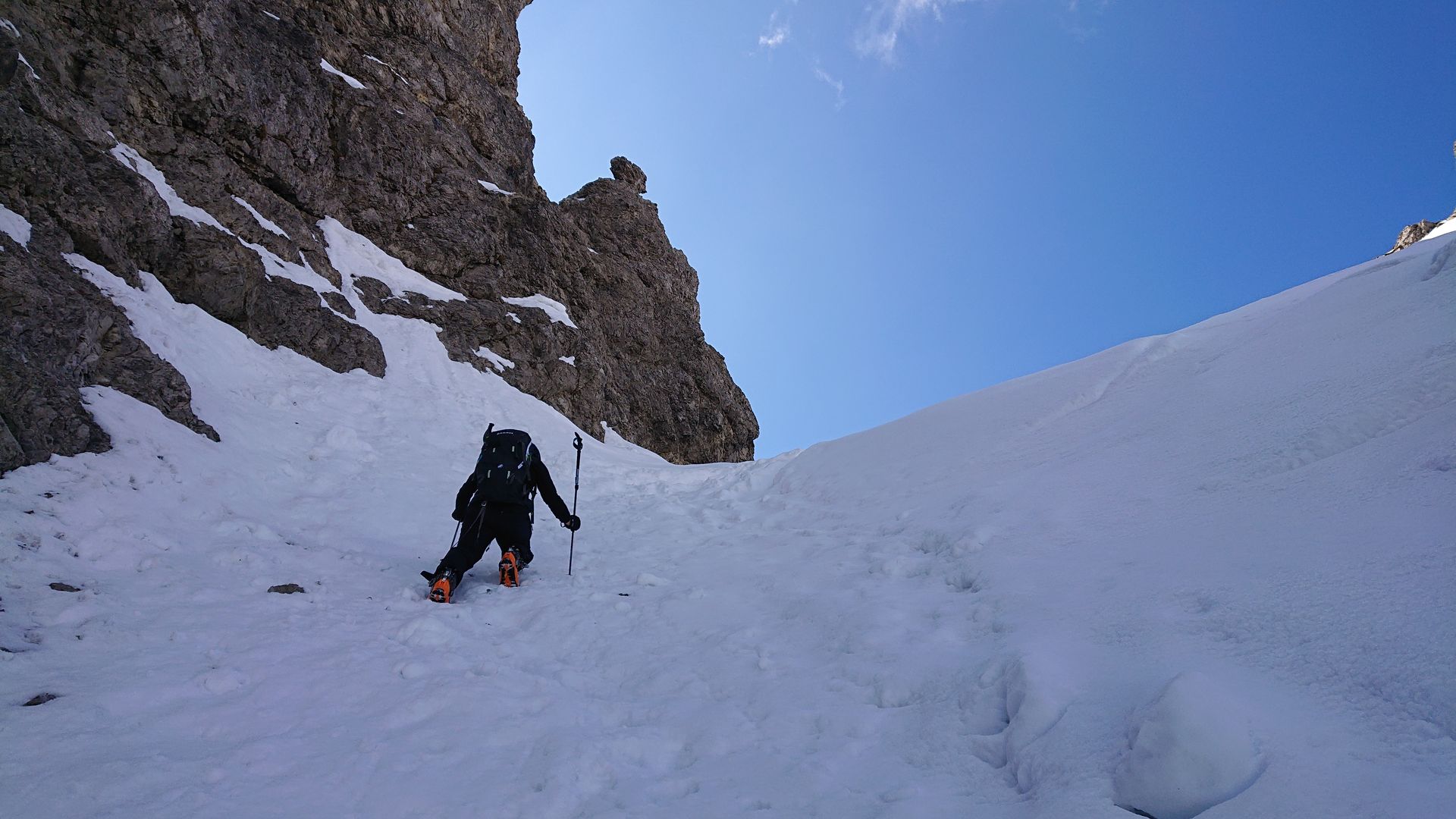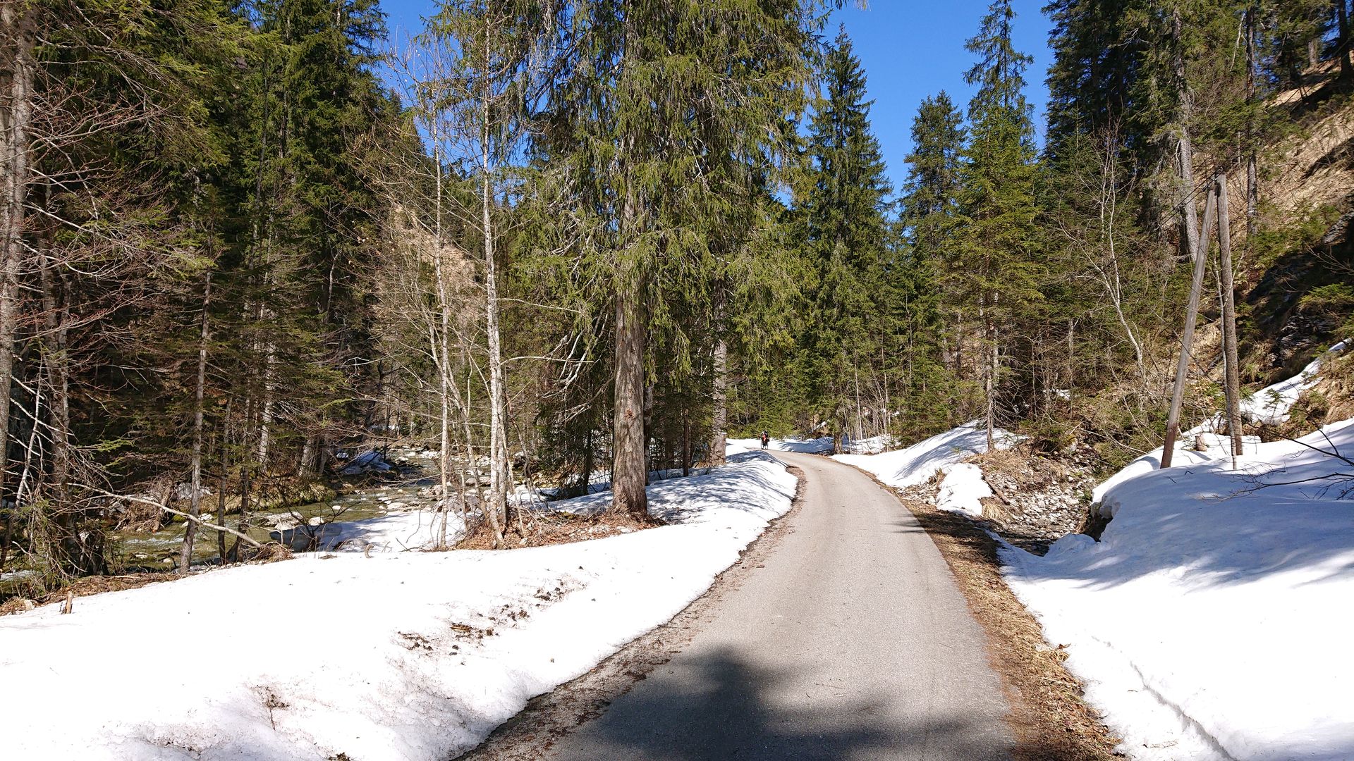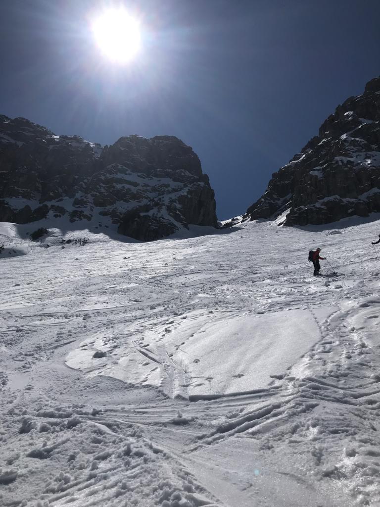 Start um 7 Uhr am Spitzingsee mit den Rädern, da die Mautstraße in die Valepp noch gesperrt ist. Straße ist aber bis zum Zusammenfluss von Roter und Weißer Valepp schneefrei, dennoch vorsichtig fahren, teilweise ist die Straße am Morgen überfroren. Insgesamt nur kurze Tragestrecken im Bereich der Schlagalm. Im Kar reichlich Schnee, der bei der Abfahrt schön aufgefirnt hat. Schindertor ist passierbar, oberhalb ziemlich hart, aber nicht eisig.