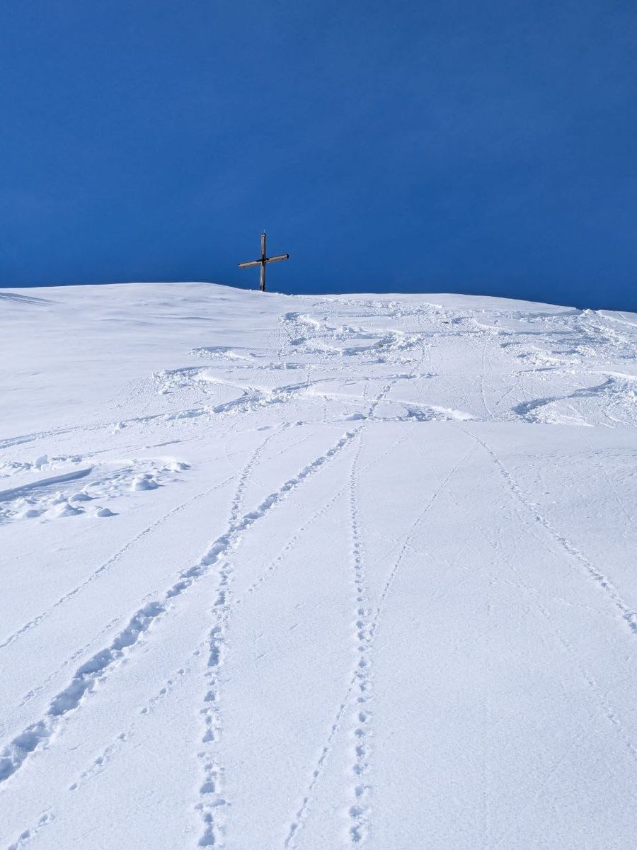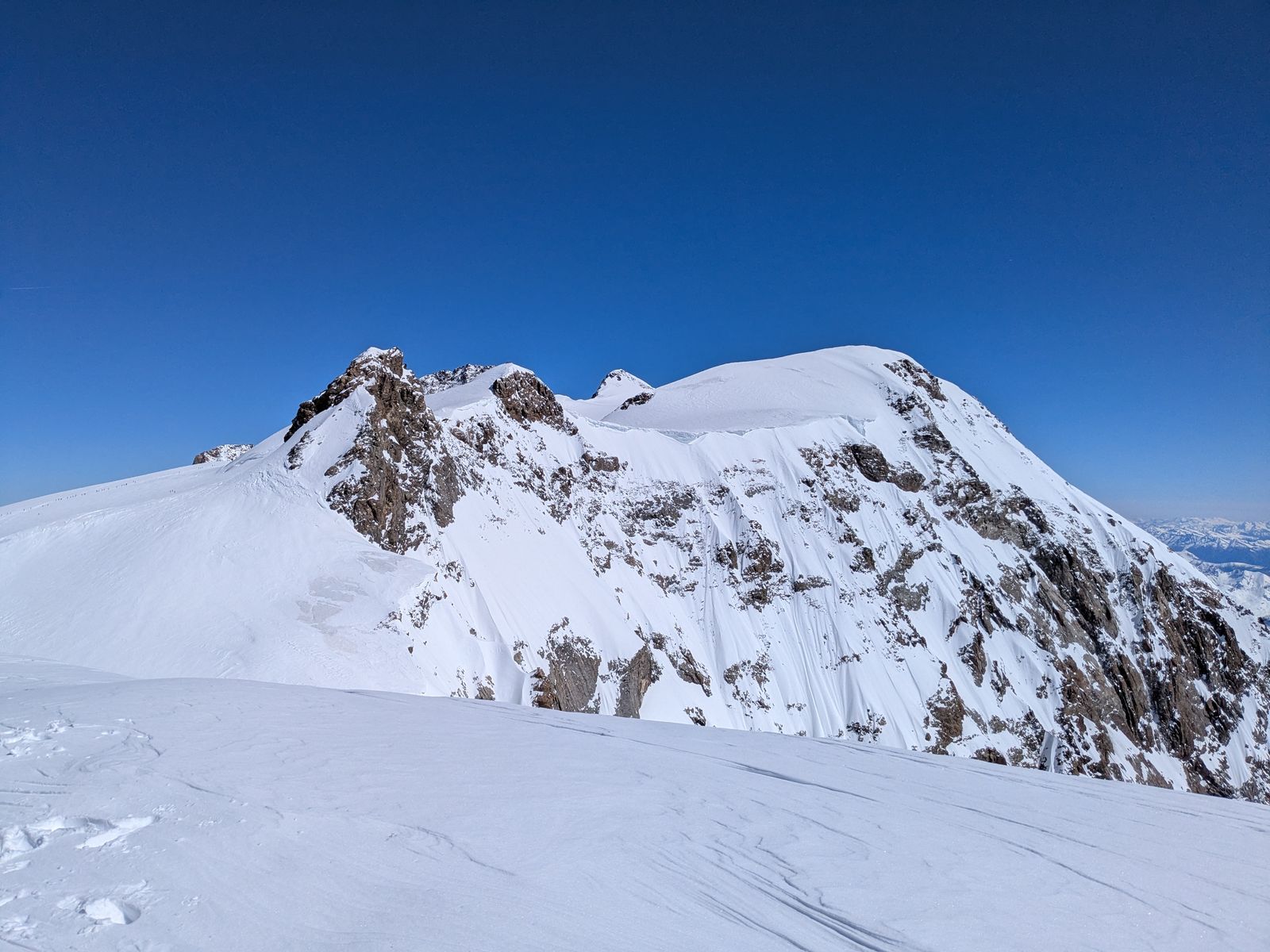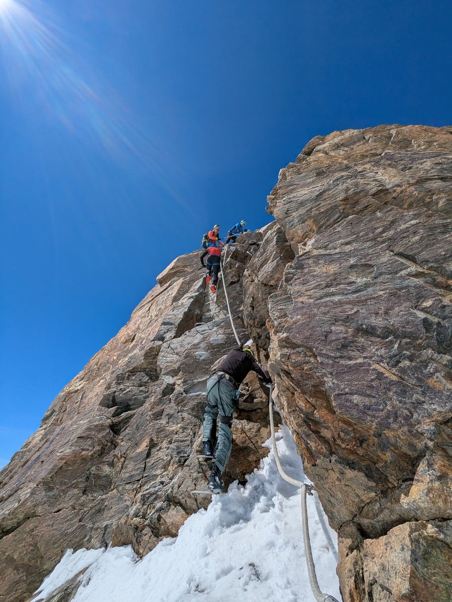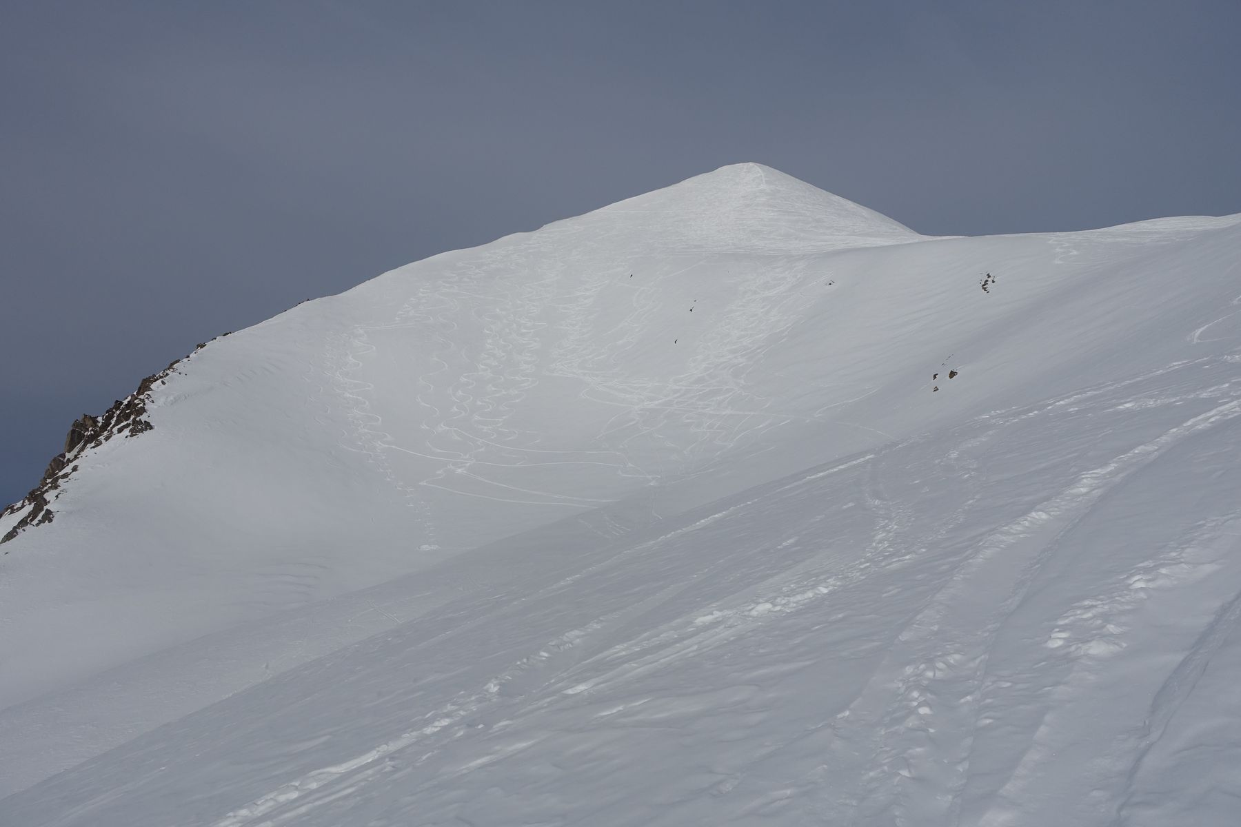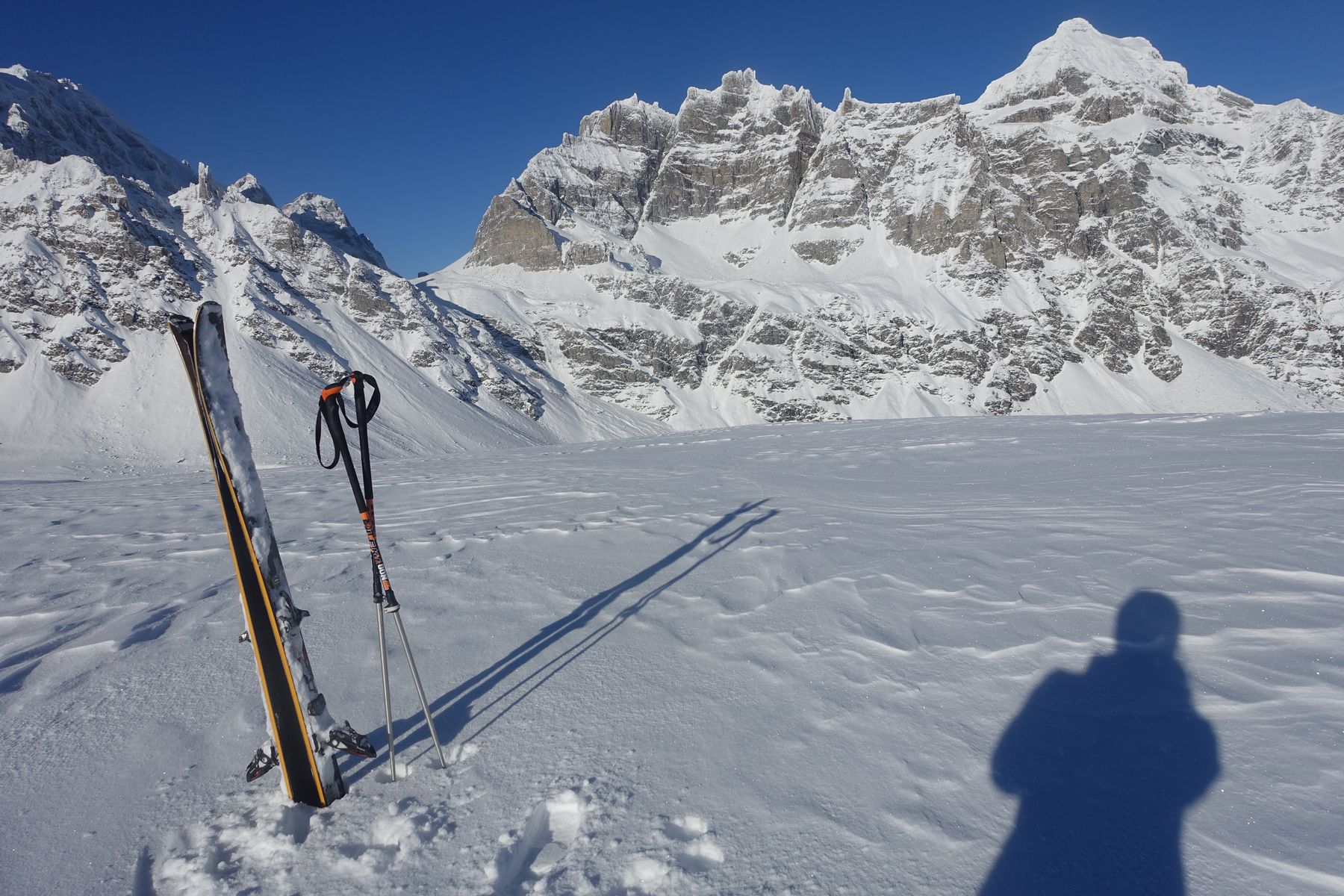 Bei knapp 1000 Hm haben wir die Pyramide problemlos erreicht. Gegenüber steht der Balmenhorn, wo man mit einem kurzen Klettersteig eine Christusstatue ("Cristo delle vette") und einen Biwakschachtel erreichen kann. Von der Pyramide waren es vielleicht 200 hm Abfahrt und 100 hm Gegenanstieg. Aus Zeitgründen haben wir auf den dritten Gipfel (Ludwigshöhe) verzichtet und sind auf nicht optimalen windgepressten Schnee zurückgefahren.
