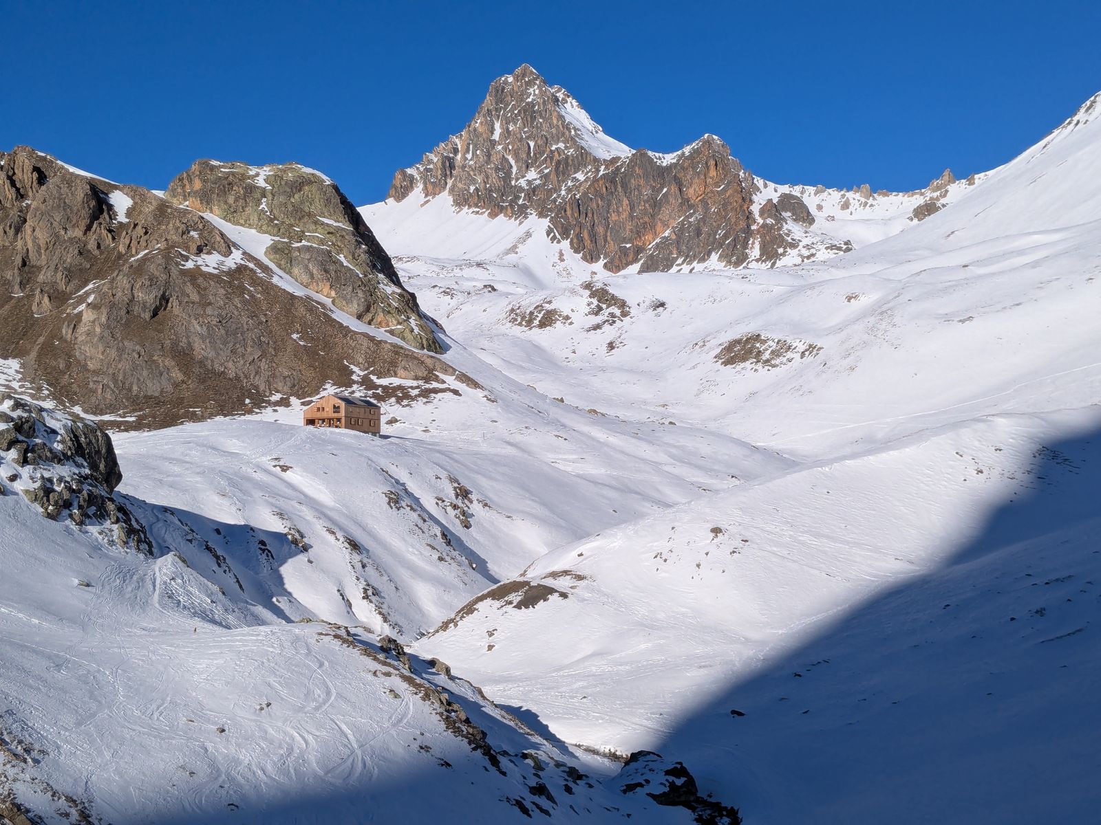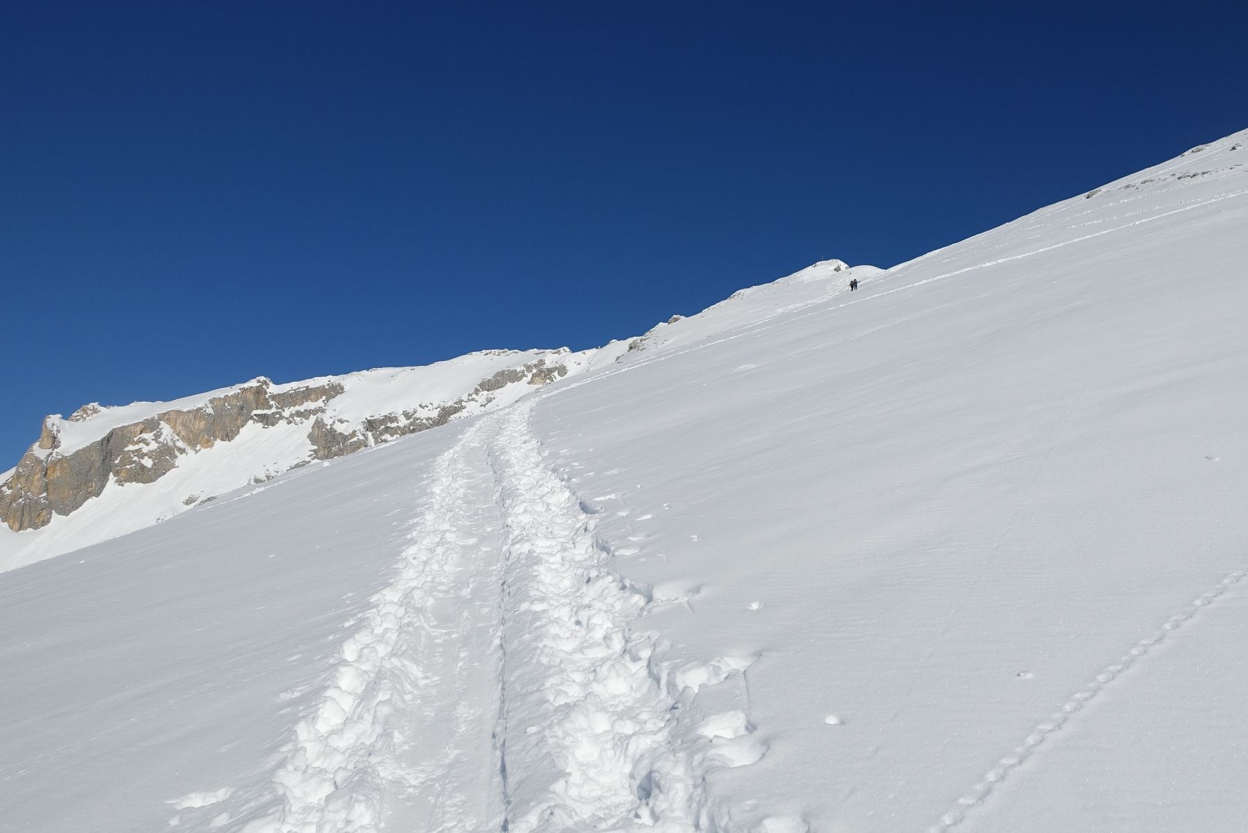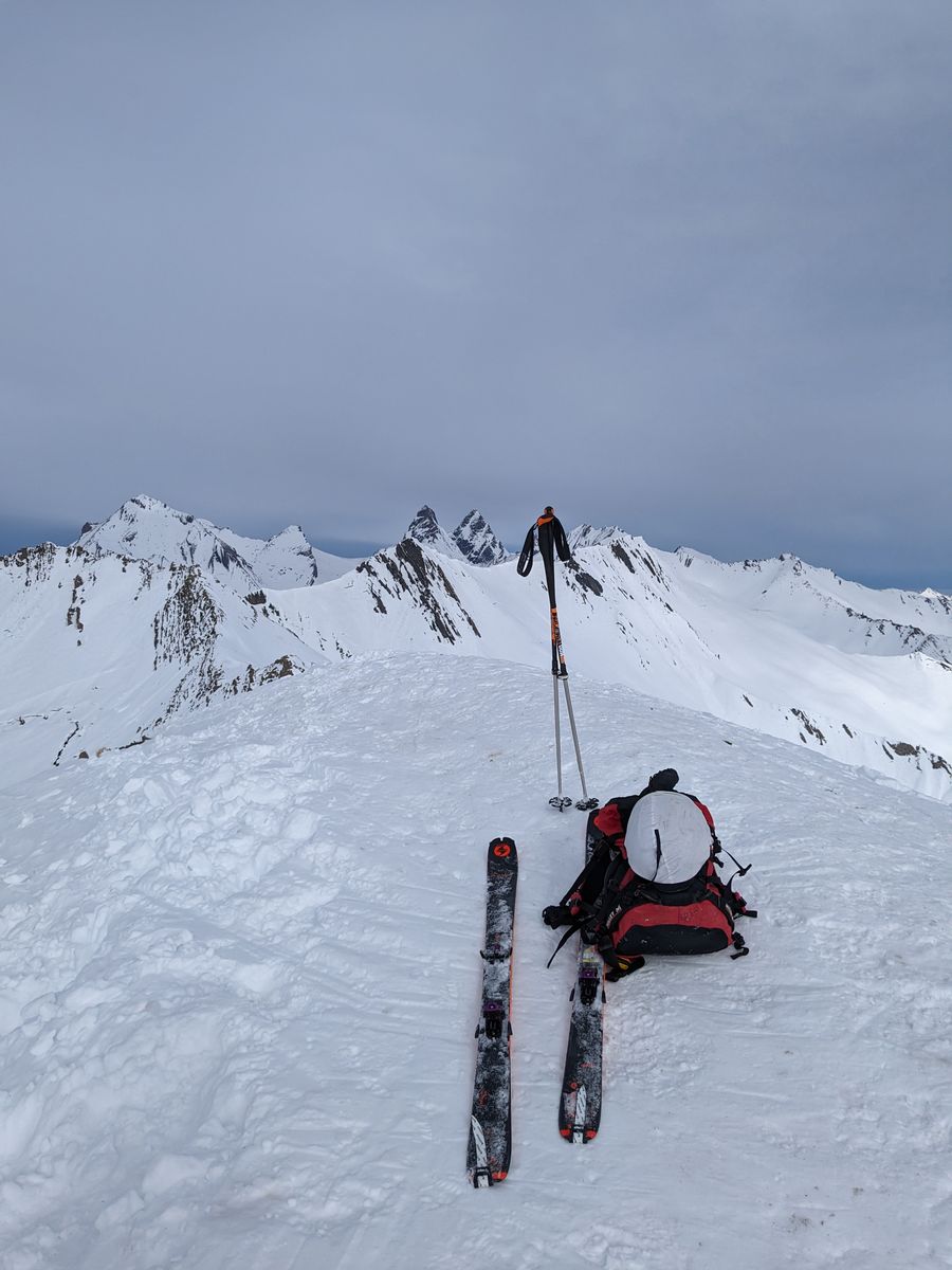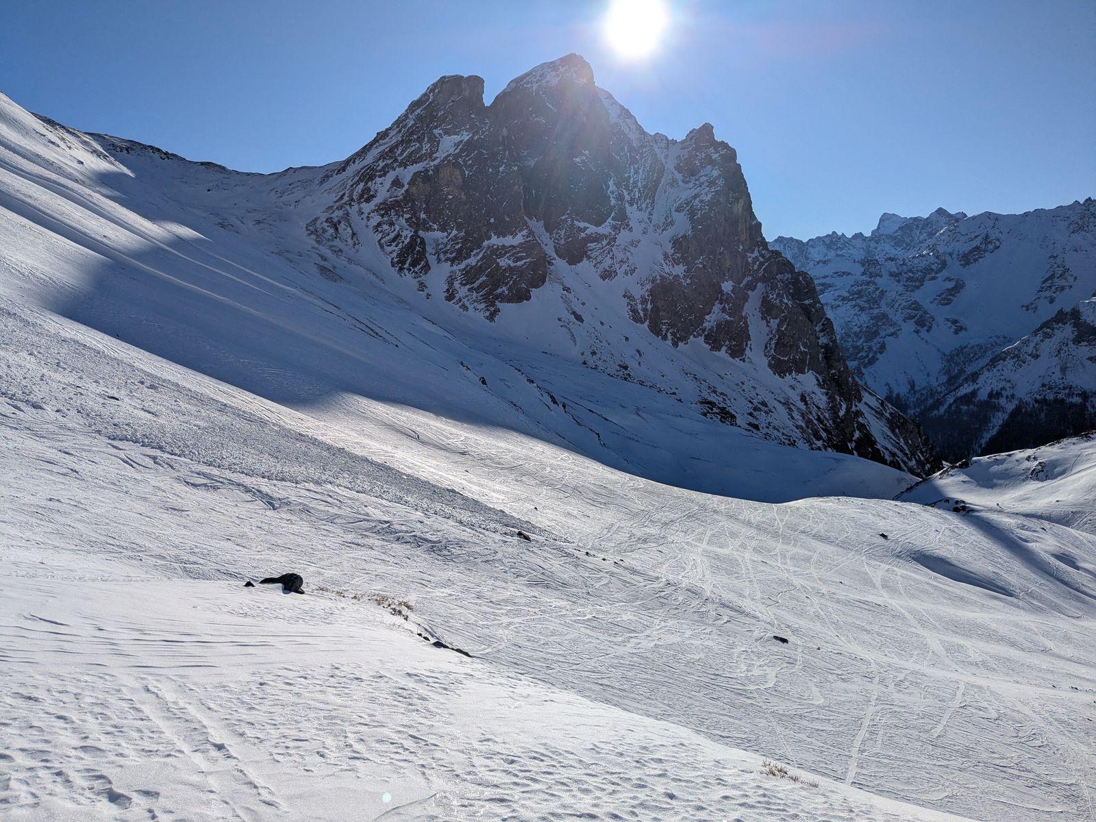 Bei knapp 1000 Hm haben wir die Pyramide problemlos erreicht. Gegenüber steht der Balmenhorn, wo man mit einem kurzen Klettersteig eine Christusstatue ("Cristo delle vette") und einen Biwakschachtel erreichen kann. Von der Pyramide waren es vielleicht 200 hm Abfahrt und 100 hm Gegenanstieg. Aus Zeitgründen haben wir auf den dritten Gipfel (Ludwigshöhe) verzichtet und sind auf nicht optimalen windgepressten Schnee zurückgefahren.