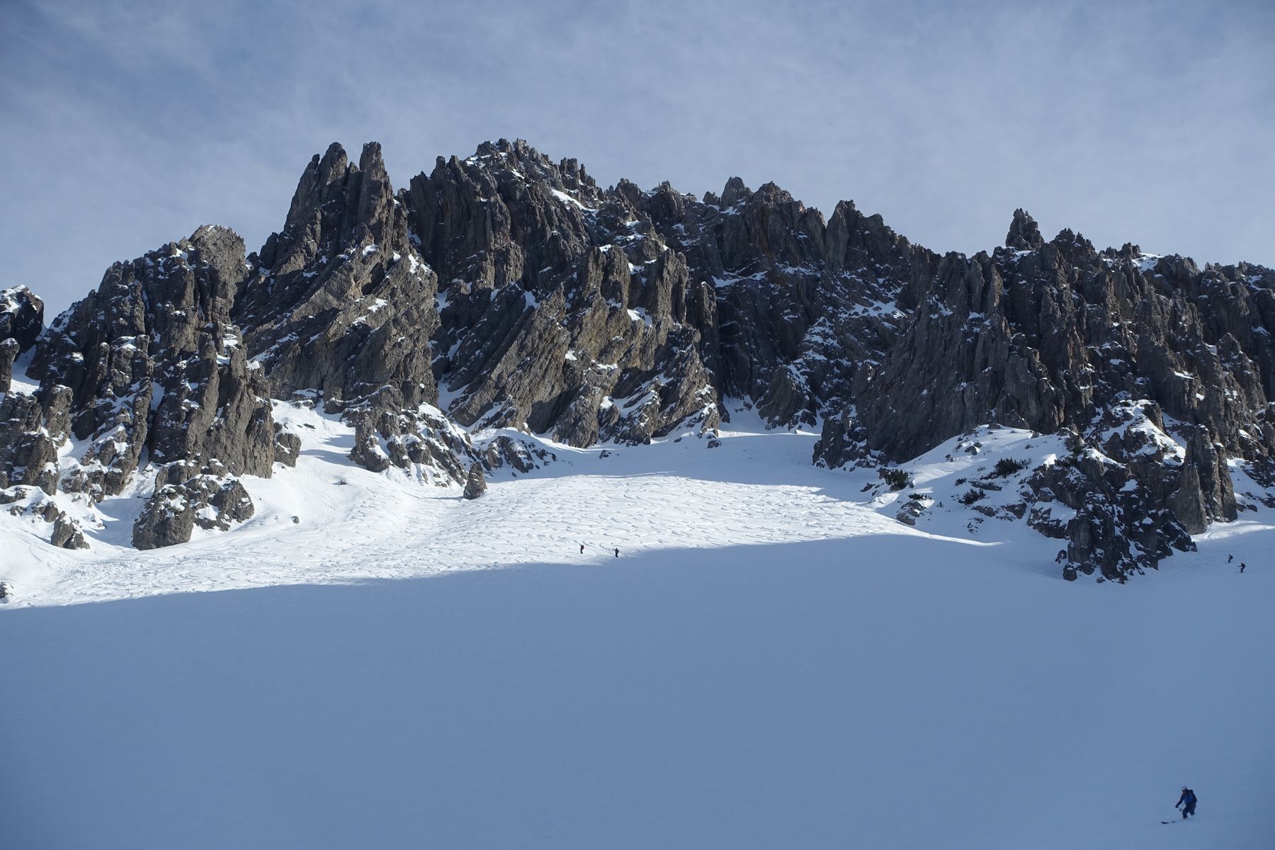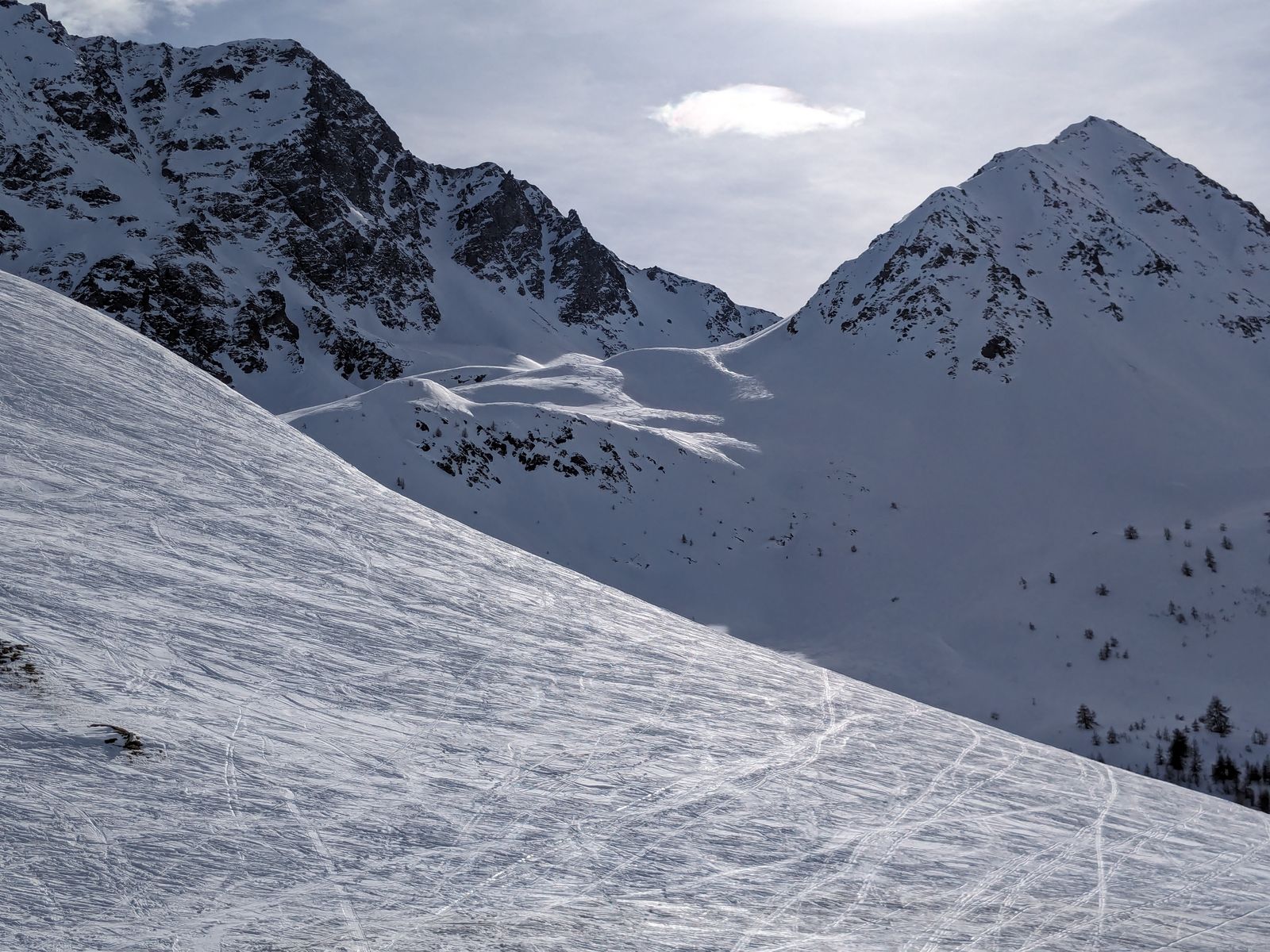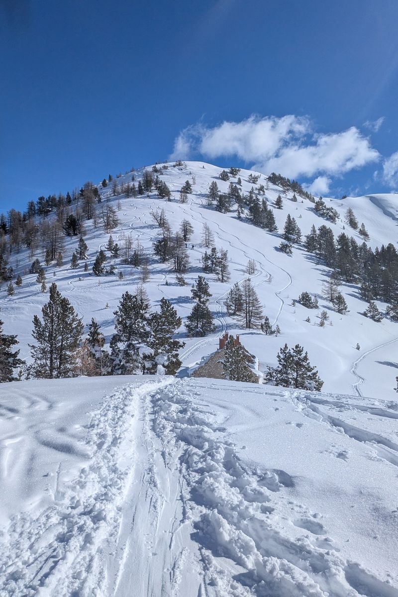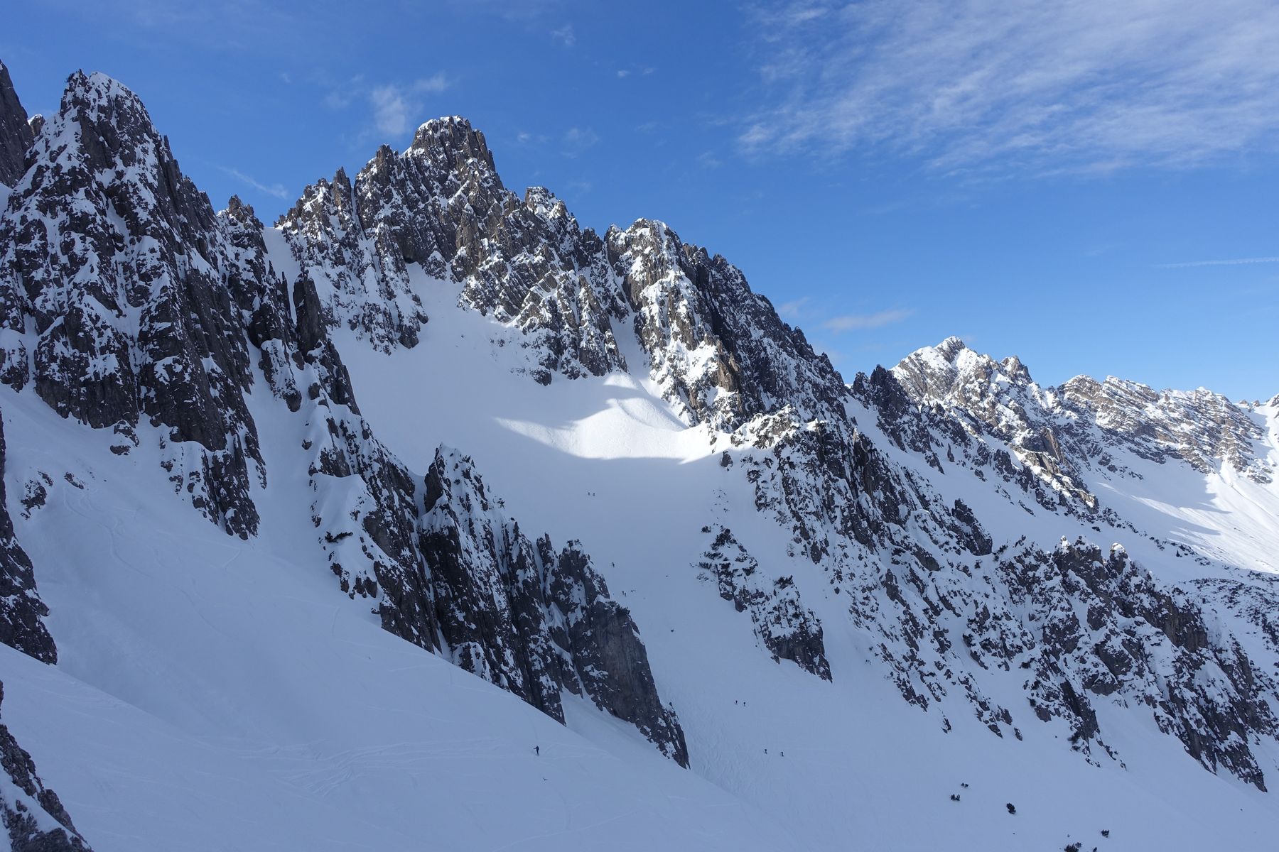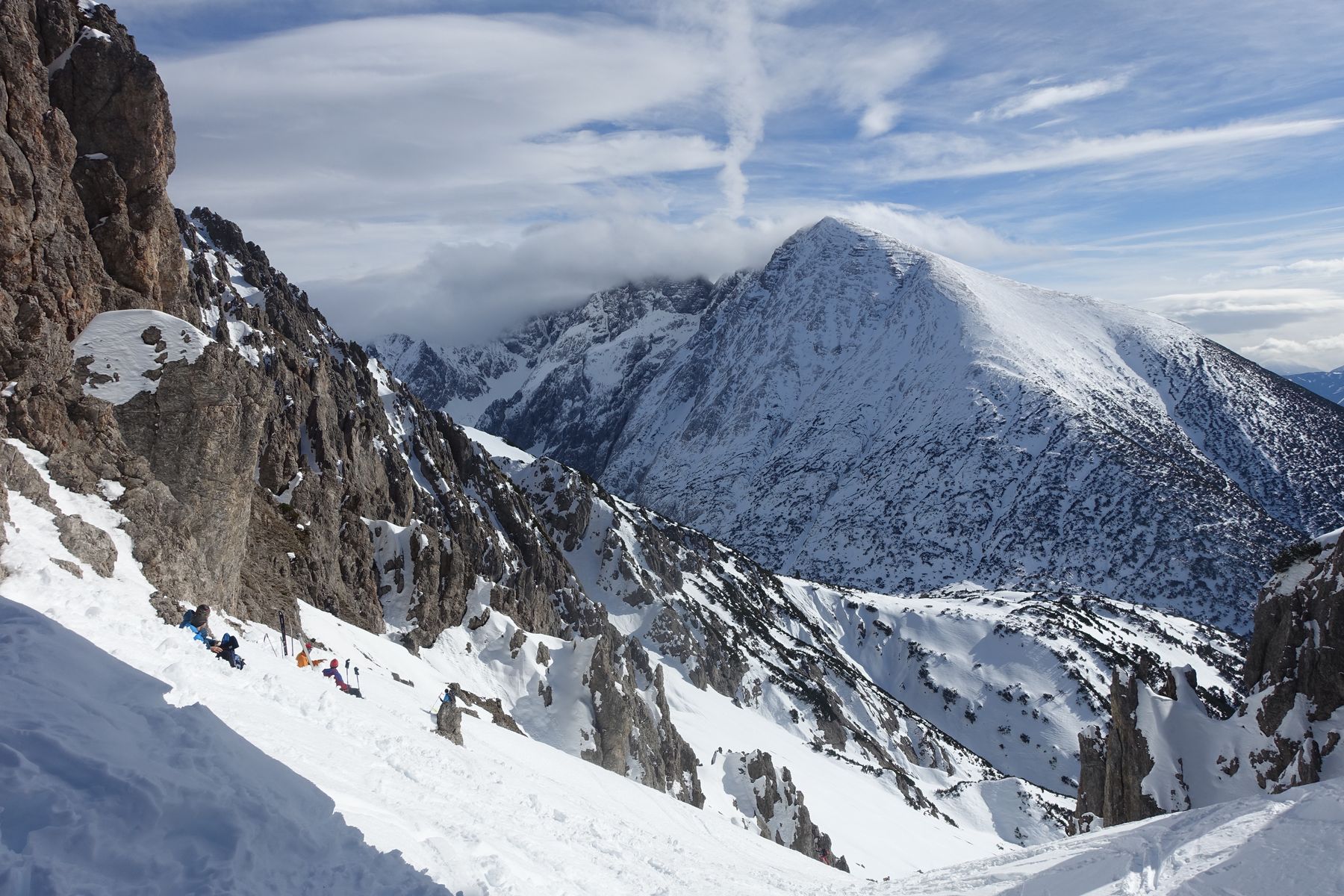 Bei knapp 1000 Hm haben wir die Pyramide problemlos erreicht. Gegenüber steht der Balmenhorn, wo man mit einem kurzen Klettersteig eine Christusstatue ("Cristo delle vette") und einen Biwakschachtel erreichen kann. Von der Pyramide waren es vielleicht 200 hm Abfahrt und 100 hm Gegenanstieg. Aus Zeitgründen haben wir auf den dritten Gipfel (Ludwigshöhe) verzichtet und sind auf nicht optimalen windgepressten Schnee zurückgefahren.