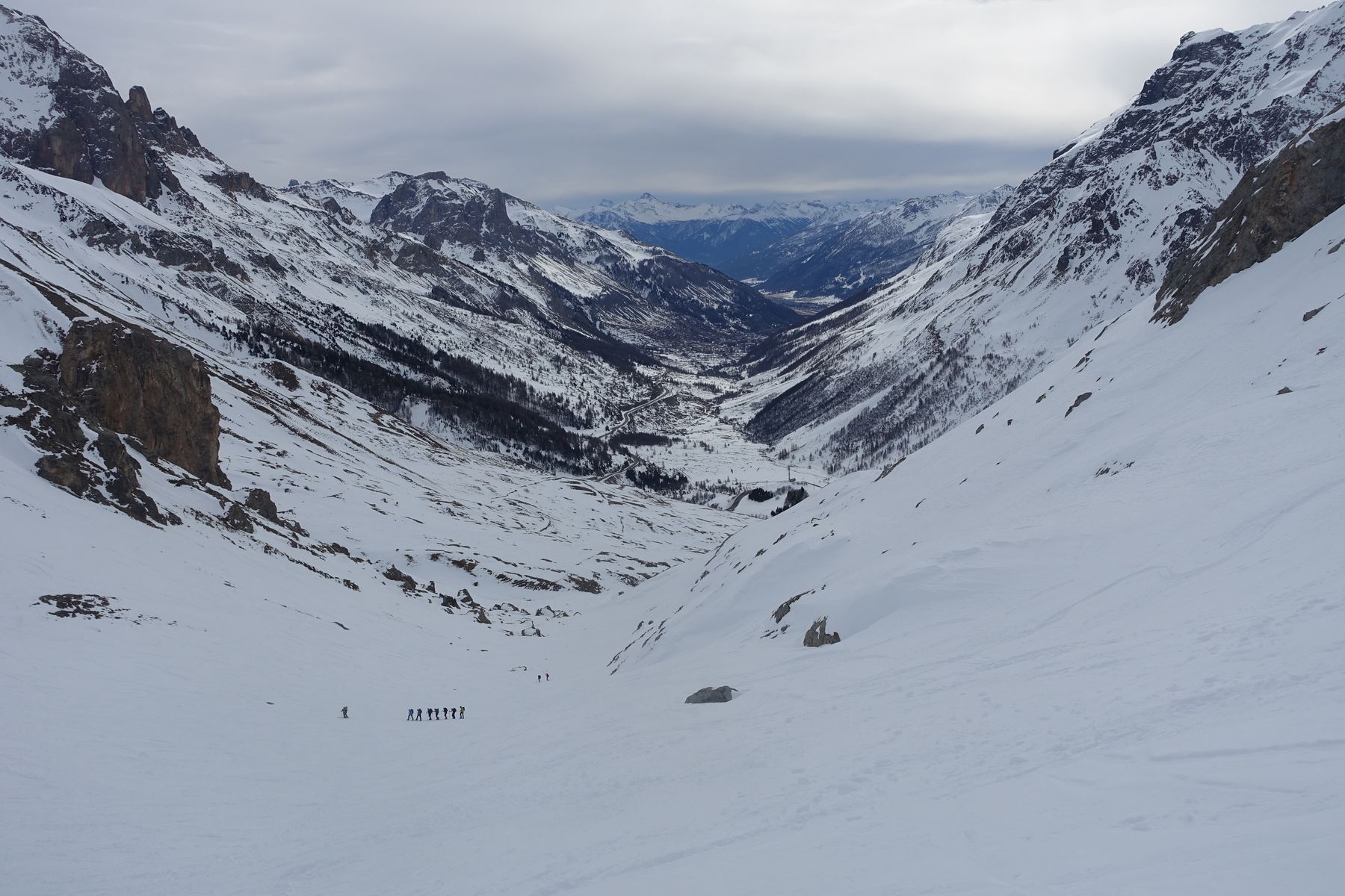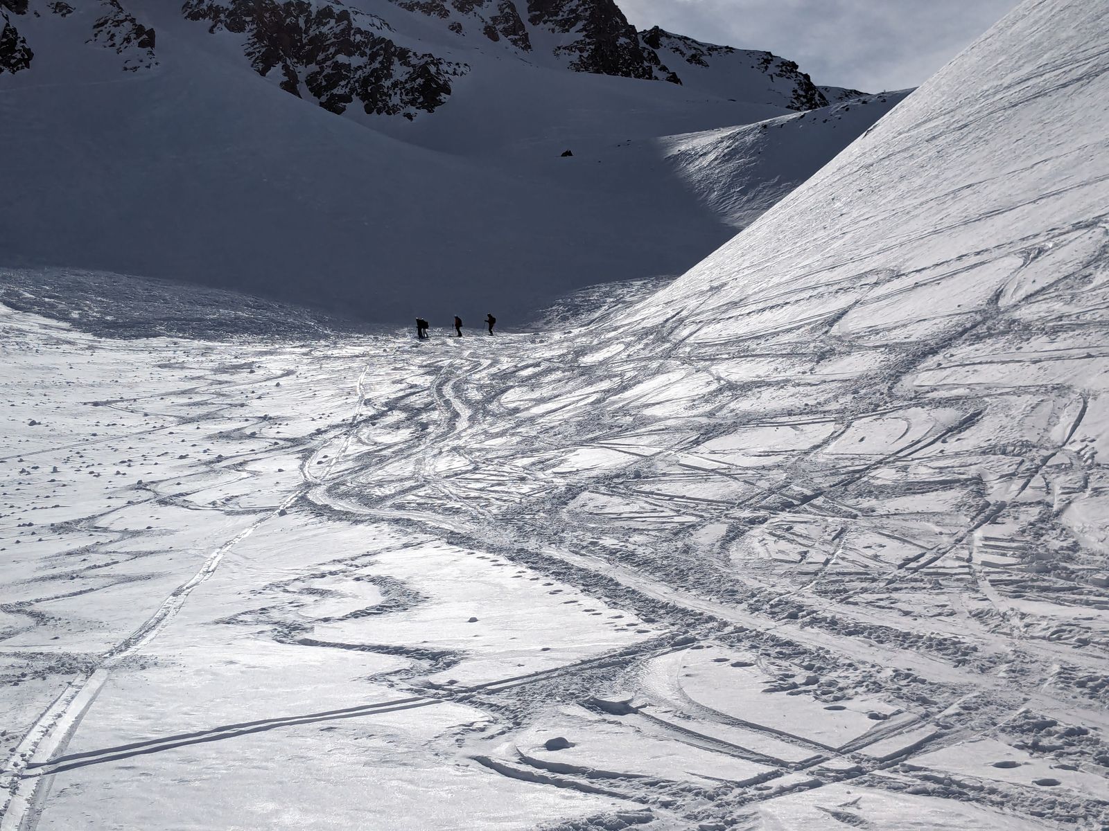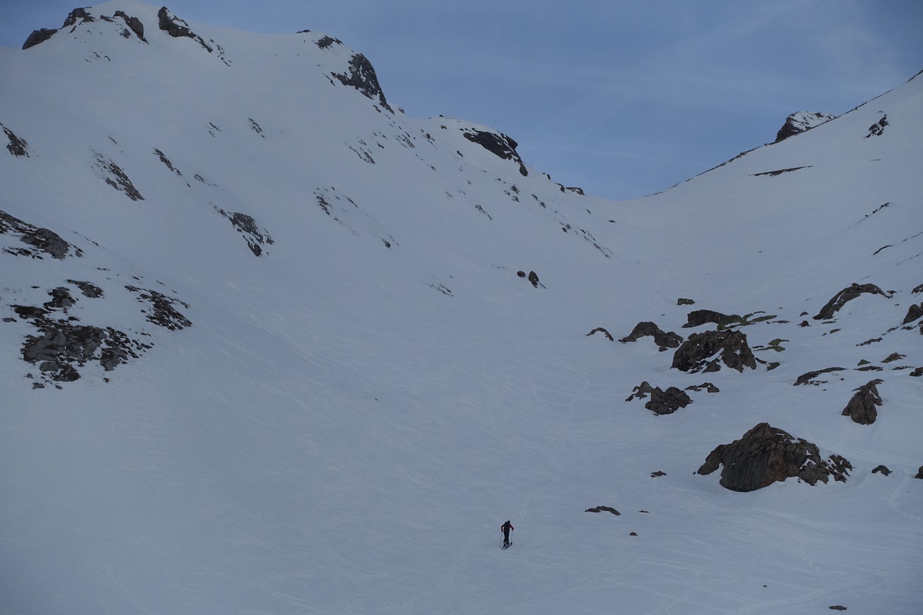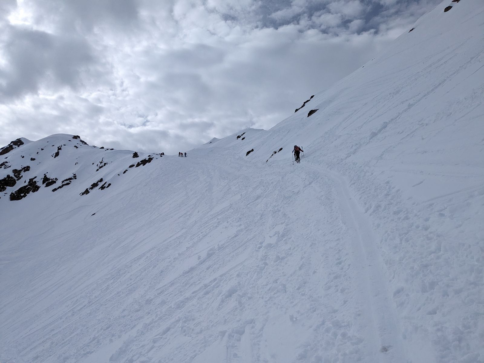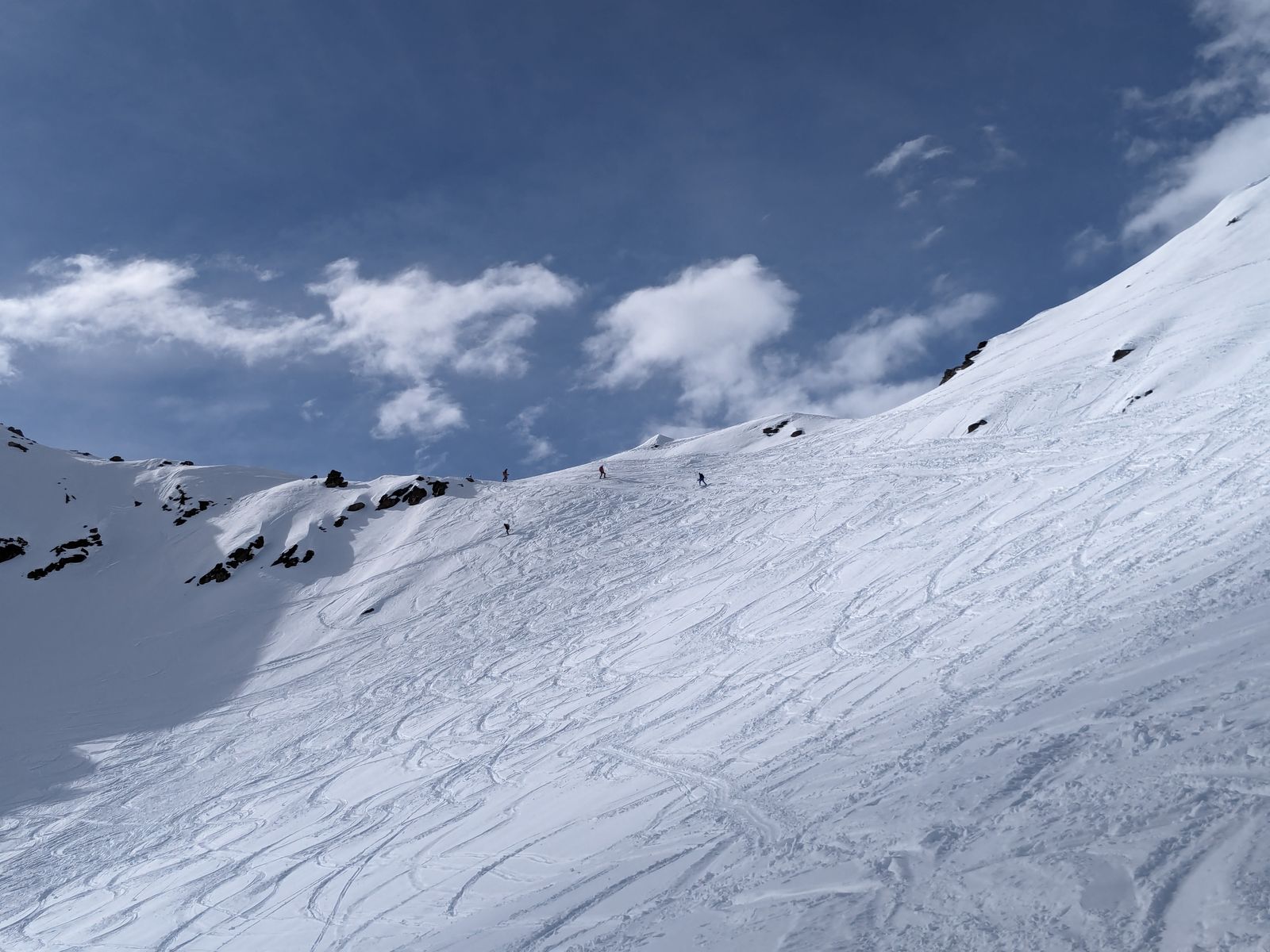 Um den Gegenanstieg auf die Bergstation zu vermeiden, sind wir auf dem Rückweg durch die "Casati" Rinne abgefahren. Dort war der Schnee glücklicherweise schon weich, weil bei der Steilheit ein Sturz zu einem unkontrollierten Rutsch ins Tal und auf Felsen werden kann. Auf sehr schönen Firn haben wir endlich die Bergstation erreicht, und sind mit der Seilbahn nach Alagna zurückgekommen. Wäre man stattdessen von Gressoney gestartet, hätte man mit zusätzlichen 1500 Hm Abfahrt über die Pisten zum Parkplatz auf Ski gelangen können (absolut empfohlen).