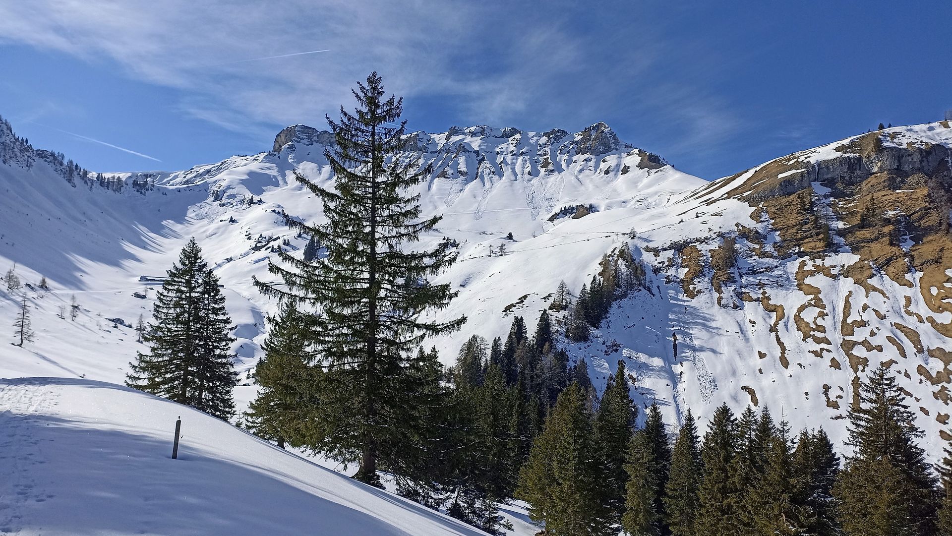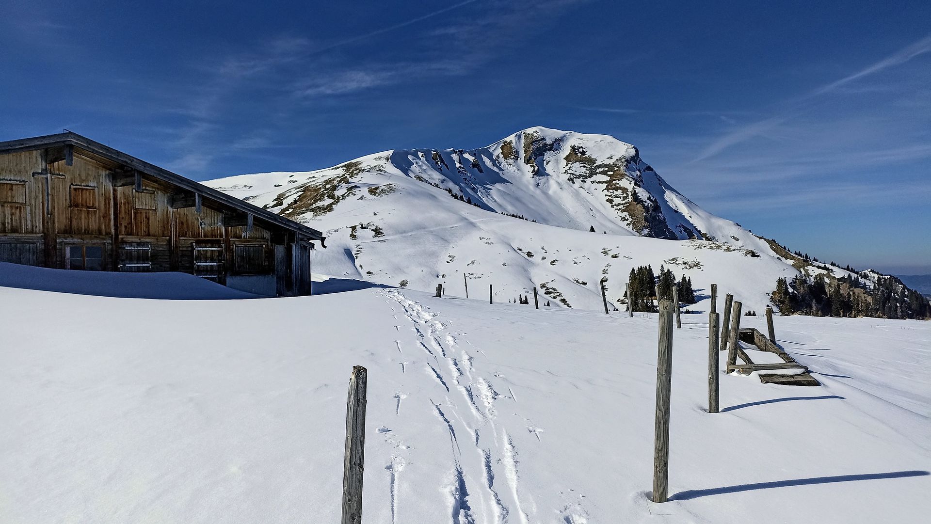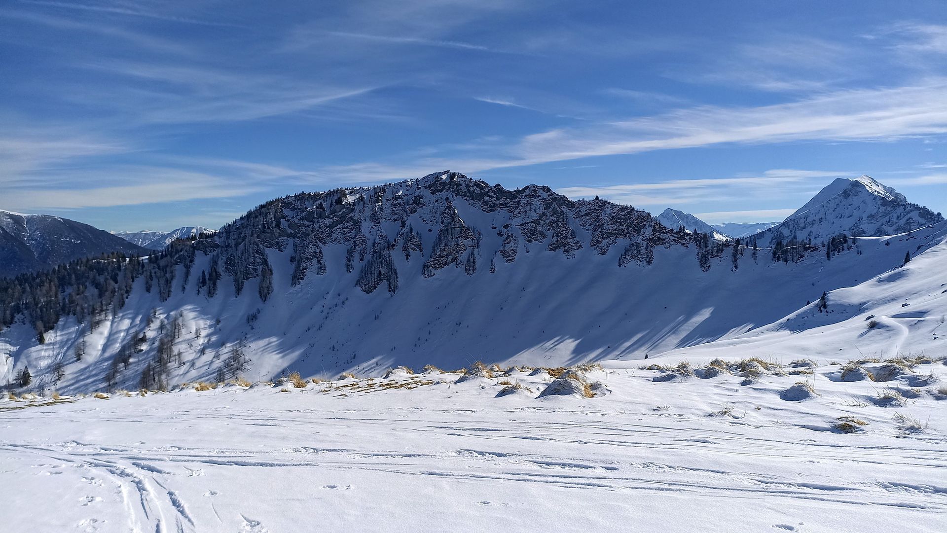 Heute Vormittag los gegangen. Vom Parkplatz bis zum Wiesen Falkenmoosalm Tragen. Oben Schneedecke harschig, es geht aber gut ohne Eisen. Nordflanken noch zur Teil mit Pulver, südseitig zur Teil aper. Fast alleine unterwegs.