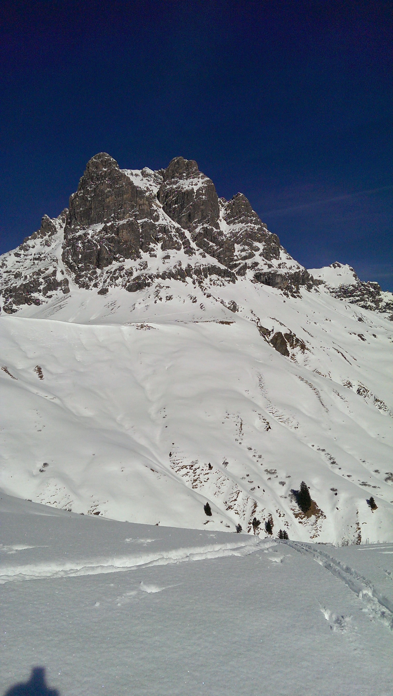 Südflanke heute ein Glutofen: Schnee aber gar nicht so schlecht. Auf der Route sicher. Locker fahrbar. Mit etwas Geländeausnutzung noch pulvrig. Haupteil südseitig natürlich schon rechter "Sonnen-Pulver".