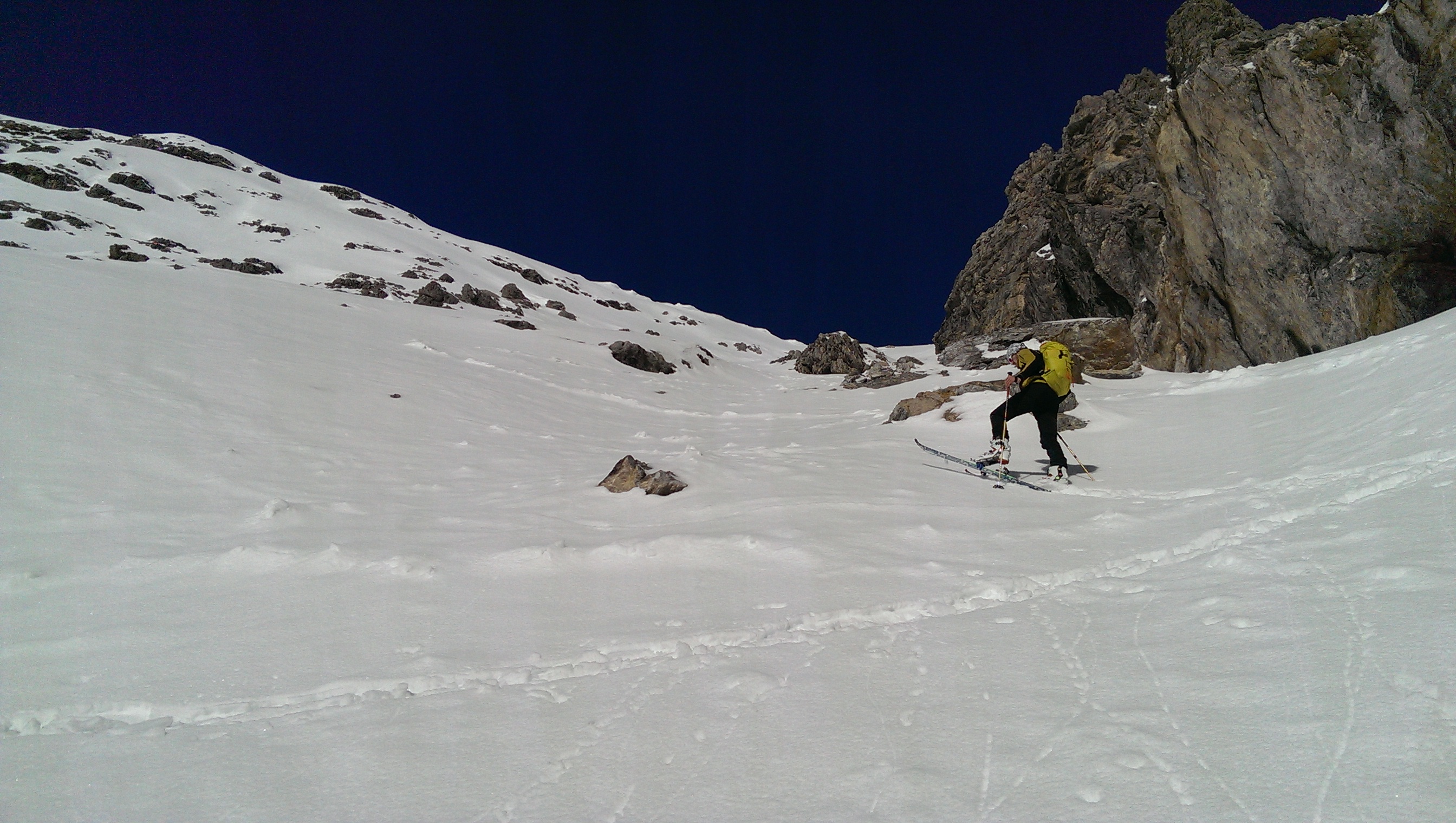 Von der Hütte flach in den Talschluss und auf perfekter Spur zum HEK. In friedlicher Koexistenz und Solidarität erlaubte ich es mir, die Skispur für die nachfolgende SS-Geherin etwas zu verbreitern...