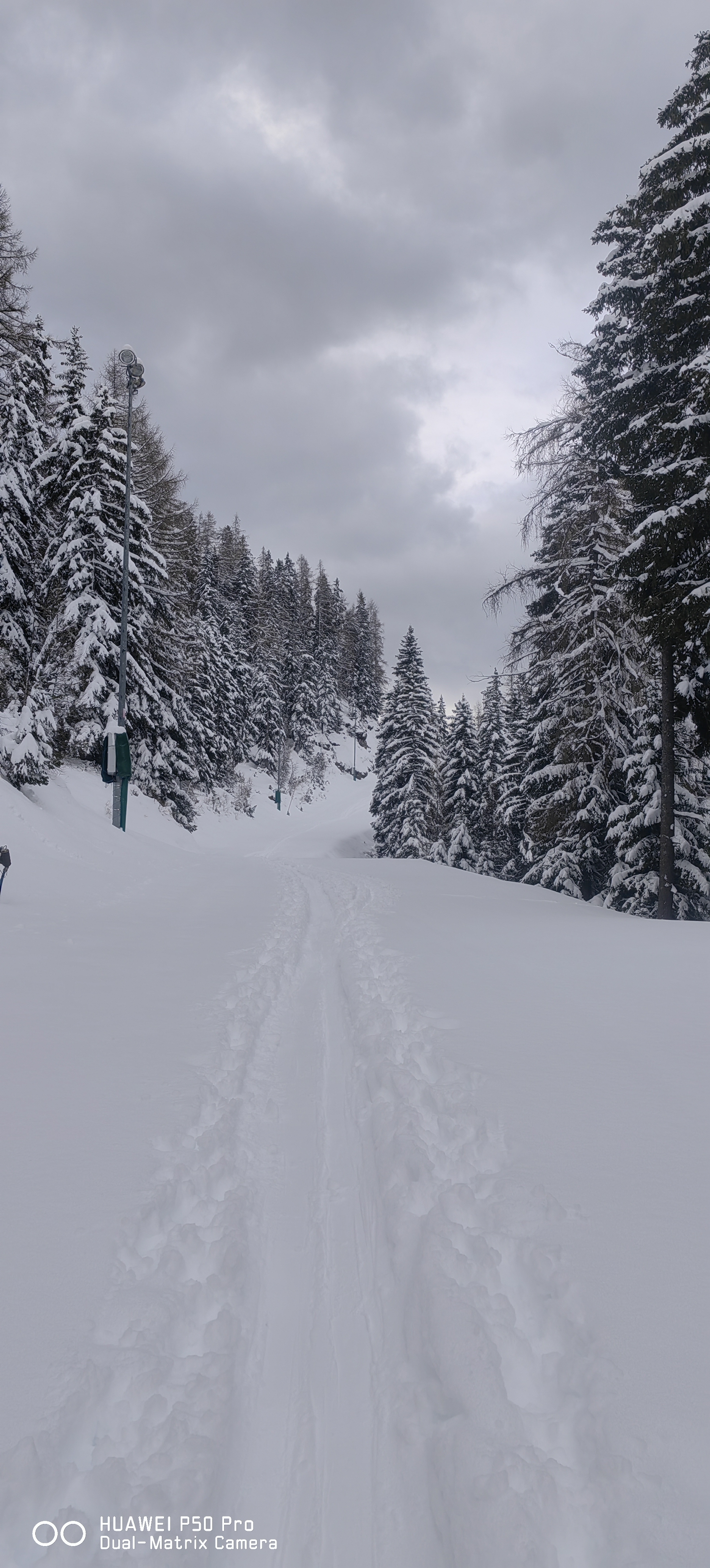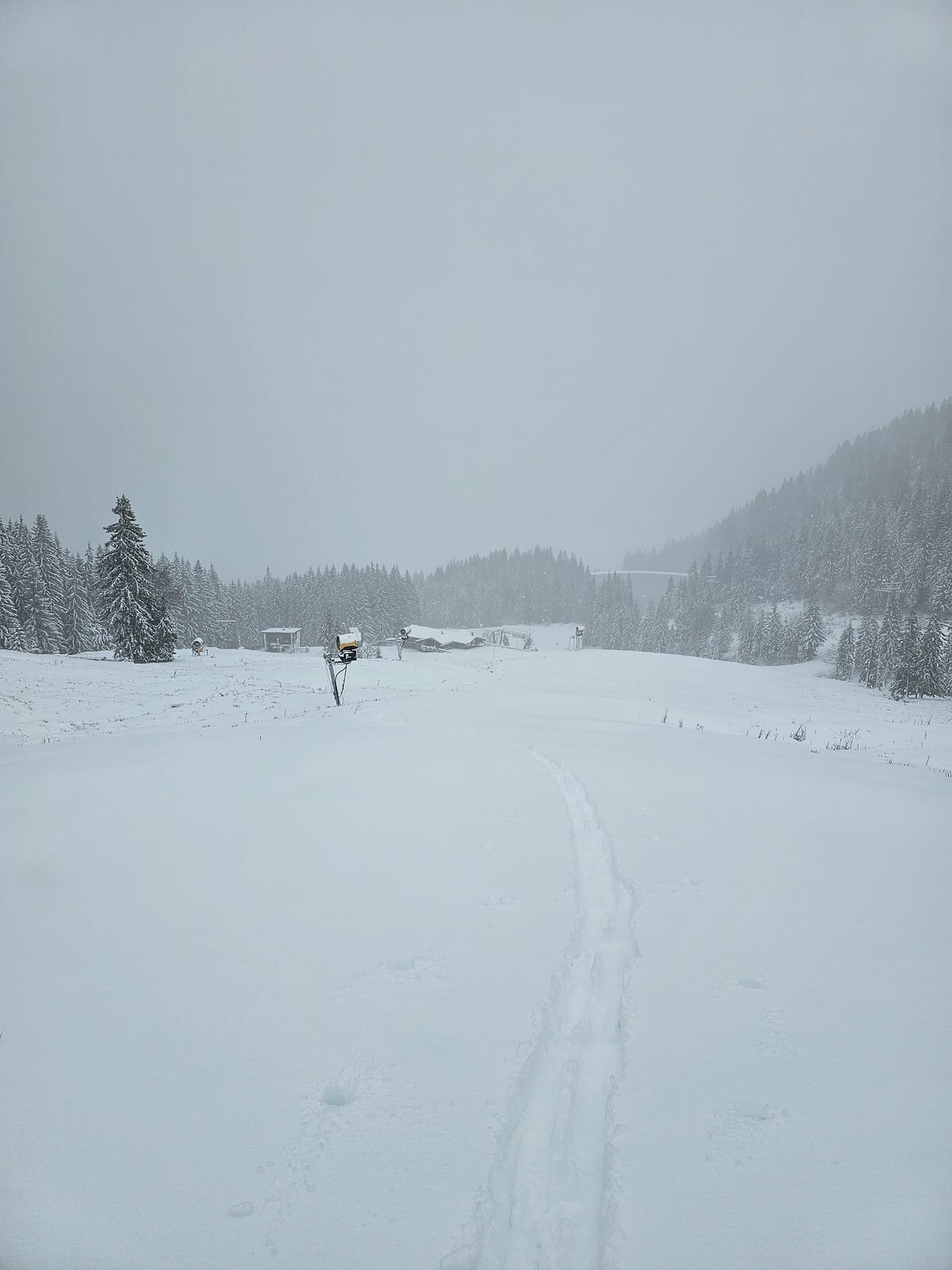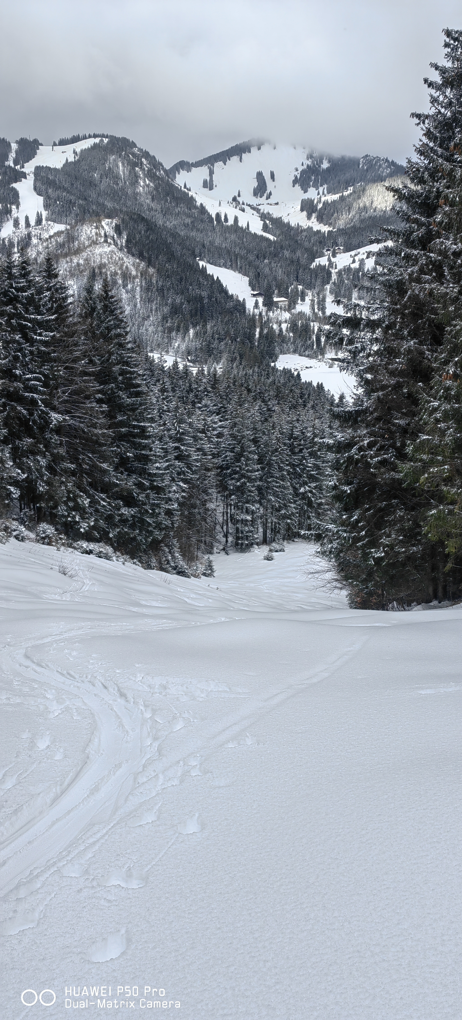 Die Forststrasse hatte eine dünne Neuschneeauflage ( um 10 cm ) gerade ausreichend um ohne größere Schäden am Belag wieder abfahren zu können. Überraschenderweise musste ich heute komplett durchspuren und das bei Start 8.30 Uhr.....?