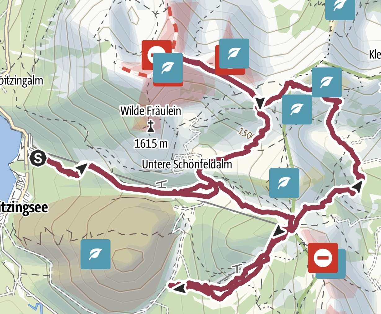 heute ging es zunächst mit dem klassischen Radl Richtung Rotmoosalm, immer der gut fahrbaren Forststrasse entlang, bis zum Abzweig "Südwandsteig / Predigtstein". Hier Radldepot und über den Steig bis zum ersten Plateau ( hier geht es links zum Predigtstein ), nun erst rechts, dann in einem weiten Linksbogen auf das nächste Plateau. Hier geht's nun relativ unscheinbar direkt rechts auf einem Kamm hoch ins Schrofen - und Schottergelände, die Wegführung ist immer wieder mit kleinen "Stoamandln" markiert und ziemlich gut erkennbar. Am Gipfel herrschte wie im gesamten Aufstieg grausiges Wetter mit Regen und starkem Wind. Das vom DAV Bergwetter angekündigte "passable Berwetter " gab es erst ab Mittag. Im Bereich der Almwiesen war der Steig ziemlich batzig und rutschig ( vor allem im Abstieg ist Aufmerksamkeit geboten ). Abstieg bzw . Abfahrt wie Aufstieg, nur mit kurzen Abstechern zum Predigtstein und zur schönen Rotmoosalm.