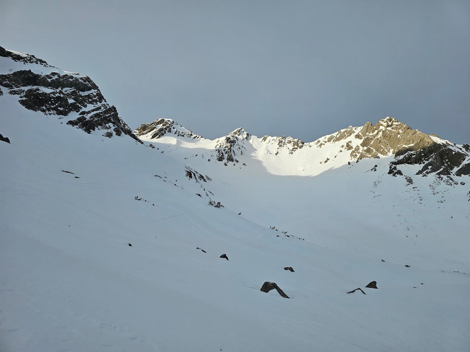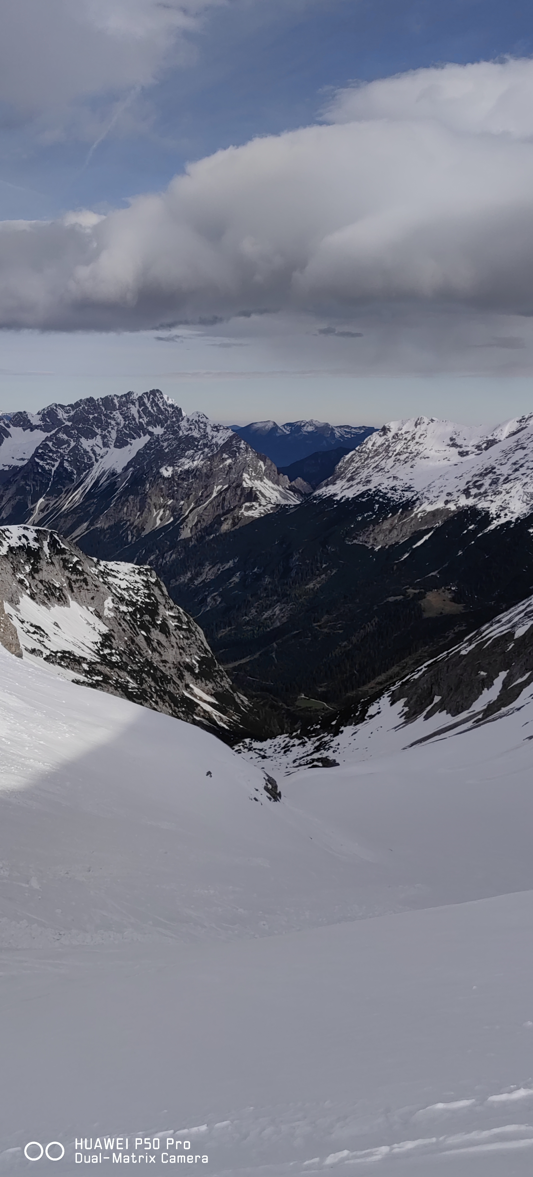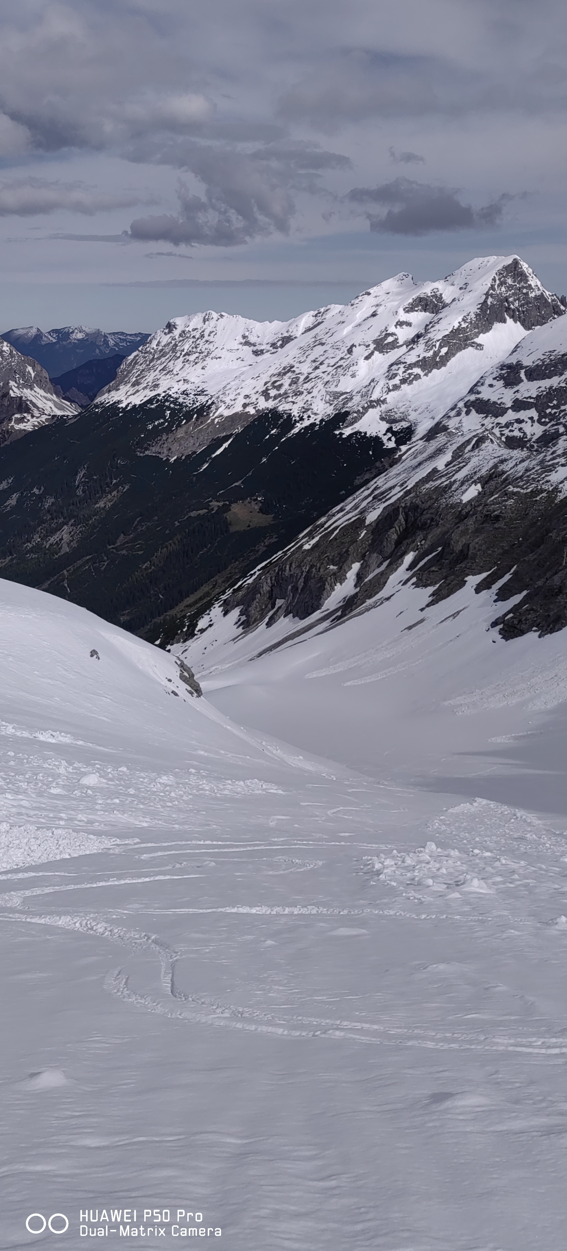 Hier musste ich meinen Plan Birkkarspitze begraben. Hohe Temperaturen und entsprechende Schneequalität ließen mich zu der Überzeugung kommen die steile Querung in der Schlauchkarsattel nicht zu wagen. Stattdessen linksdrehend in ein kleines Joch zwischen Birkkarspitze und Schlauchkarkopf auf ca.2500 m. Hier war heute Schluss. Die Abfahrt ging relativ gut. Unten besser ( schöner Sommerschnee ) als oben, wo der sumpfige Neuschnee einen leichten Deckel hatte. Zur Lawinengefahr sei gesagt, dass gestern tagsüber scheinbar schon sehr viel abgegangen ist, heute war die gesamte Zeit nichts zu hören und zu sehen. Trotzdem war es irgendwie ungut warm und ich war den ganzen Morgen völlig alleine unterwegs, somit wohl die richtige Entscheidung auf den Gipfel zu verzichten. Sollte gestern jemand einen Handschuh im oberen Schlauchkar verloren haben und vermissen, kann er sich gerne bei mir melden.