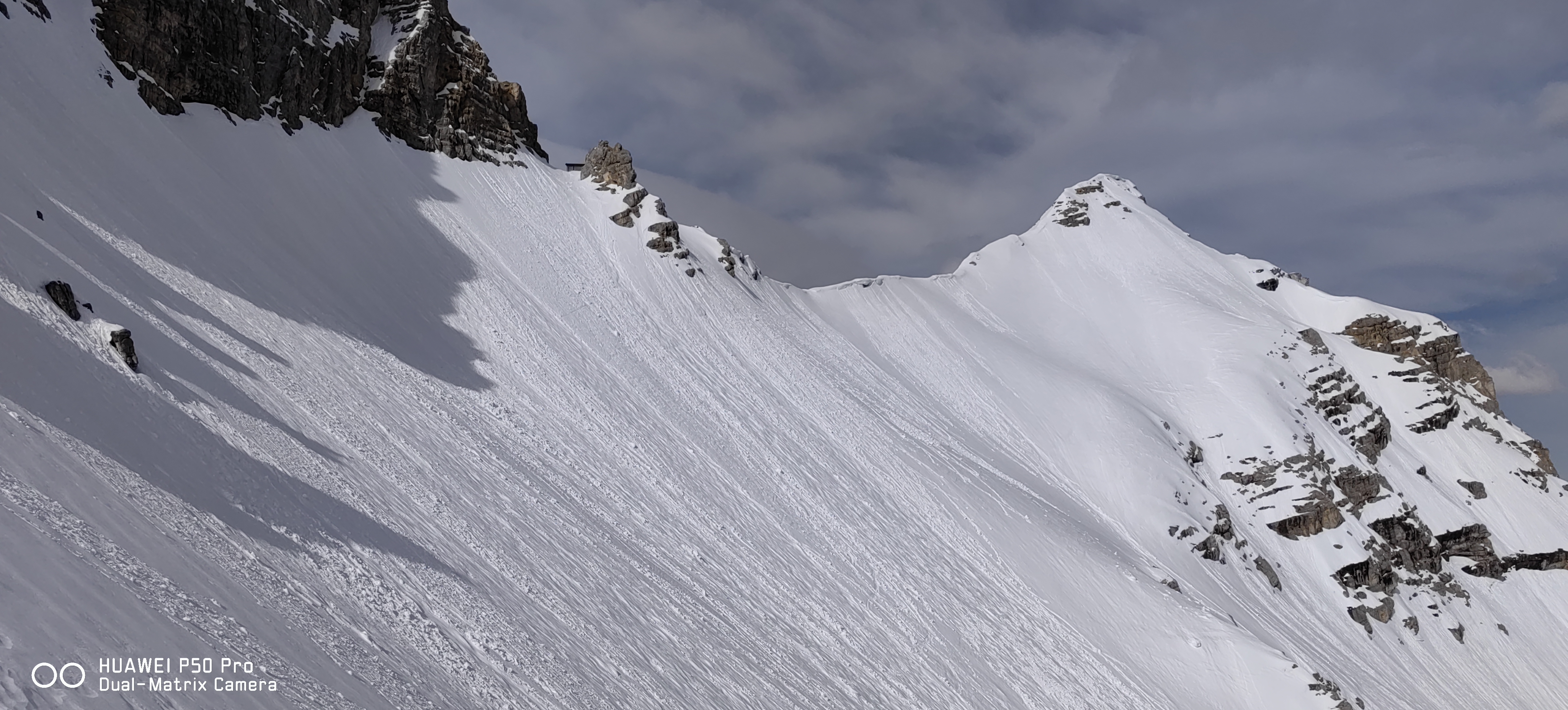 aus dem nun einsehbaren Felsentor war relativ frisch eine ziemlich große Nassschneelawine abgegangen. Beim weiteren Aufstieg war gut erkennbar dass die 10 - 15 cm Neuschnee überhaupt keine Verbindung zur Altschneedecke hatte. Als ich ca. 150 Hm unterhalb vom Felsentor angekommen war donnerten aus den ostseitigen Felswänden weitere Lawinen in die Rinne herunter und liefen ca. 30 Meter neben mir den kompletten Hang hinunter. Jetzt war Schluss! Abbruch und Abfahrt.