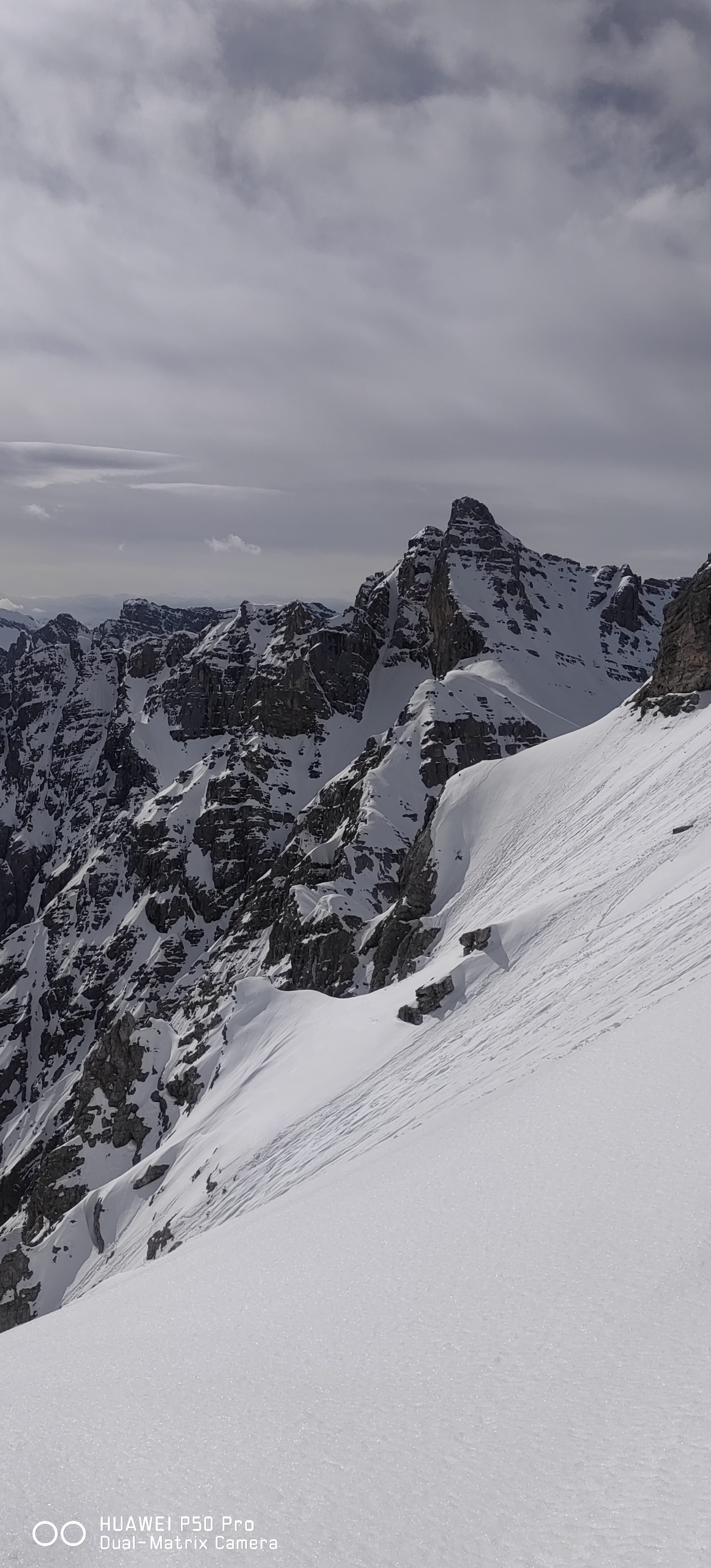 Skipiste am Morgen hart aber gut zu gehen, mittags in der Abfahrt extrem sulzig ......wird bald vorbei sein. Das Wetter und die Schneeverhältnisse wechselten heute in kurzen Abständen, da war so ziemlich alles dabei, unten weich und nass, oben windgepresst und leichter Bruchharsch. Lawinengefahr auf der Normalroute heute eher gering. Sicher keine Traumbedingungen aber die Abfahrt ging besser als gedacht und so war es doch etwas verwunderlich dass sich heute wirklich niemand ( bis auf die zwei Neugierigen ) ins Brendlkar verirrt hat.