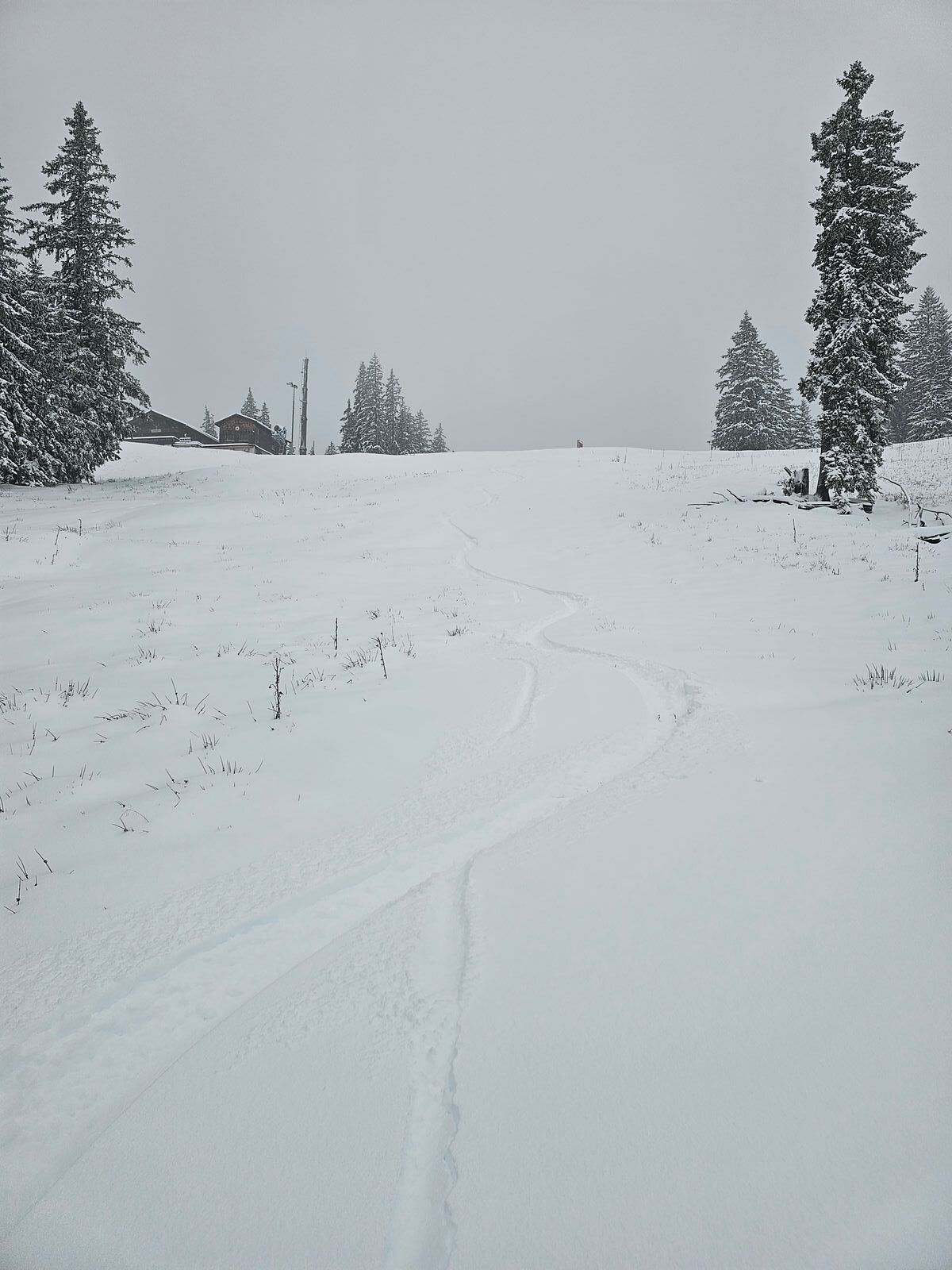 Am Nachmittag konnte man direkt am Parkplatz mit Ski starten. Unten hat es 10 - 20 cm "schweren" Pulver ohne Unterlagen, mit Robustheit aber besser mit Steinski geht das ganz gut. Ab 1200 m sind es dann schon 30 - 50 cm schöner Pulverschnee auf solider Unterlage.