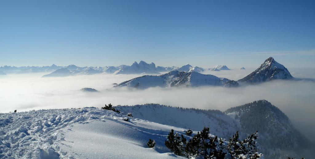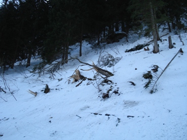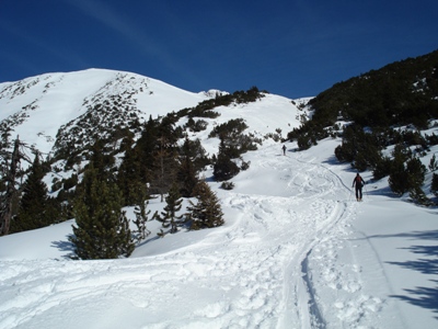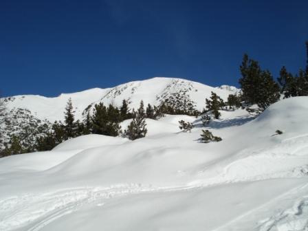 Tourenverhältnisse: Oben bei den Latschen zum Gipfelhang fast zu wenig Schnee. Die Abfahrt dort war sehr mühsam bzw. zur Zeit nur geübten Skifahrern zu empfehlen. Spitzkehren in der Abfahrt waren mehrmals notwendig. In den freien Südhängen durch Sonneneinstrahlung bereits verharscht. Im Wald teilweise pulvrig.