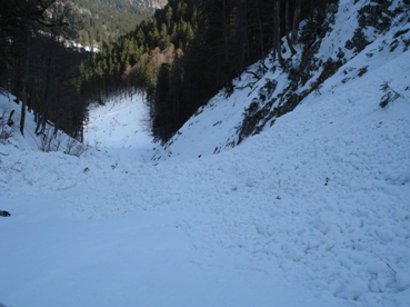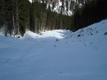 Wir sind durch den Lösertalgraben abgefahren. In den letzten Tagen kam vom Hasentalkopf eine riesige Lawine, die den Graben dort und das untere Ende des Lösertalgrabens bis hin zum Sägertal völlig zuschüttete. Da müssen riesige Mengen runtergekommen sein. Viele auch große Bäume sind teilweise auf ca. 1 m Höhe abgerissen. Dazu kamen später noch diverse größere Naßschneelawinen.