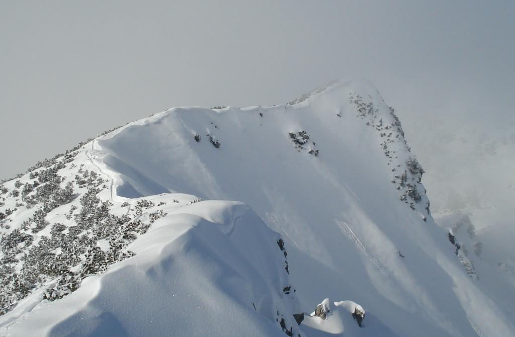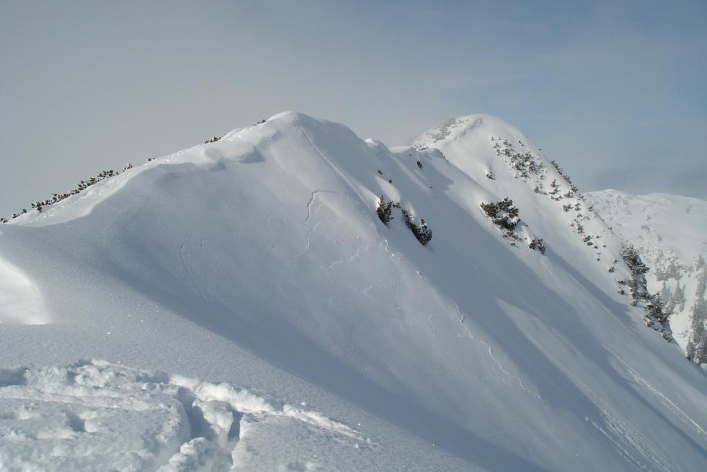 Tourenverhältnisse: viel mehr Schnee als erwartet, im unteren Teil ist der Schnee noch kaum vom Wind beeinflußt, oben jedoch deutlich windumgewandelt