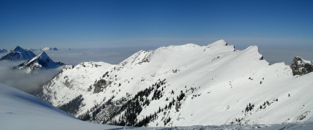 Tourenverhältnisse: Beim Aufstieg fluffiger Pulverschnee, der aber aufgrund der Exposition bald "einen Stich" bekommen hat und später auch pappig wurde. Weiter oben lag der Neuschnee auf einer harten tragenden Altschneedecke, weiter unten war diese auch oberflächlich aufgeweicht. Aufgrund der hohen Schneelage sind die Latschen am Gipfelhang super eingeschneit und im Wald läßt sich alles trotz des eng gesteckten "Naturslaloms" gut fahren.