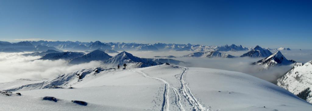 Tourenverhältnisse: Angenehmer Aufstieg auf dem Schützensteig und weiter auf die Hochblasse, Abfahrt in den steilen Nordwesthang, der schon verspurt war. Dort griffiger tragender Harschdeckel mit ca 25 cm lockerem Pulver, Aufstieg auf den Ochsenkopf, Abfahrt in den steilen bereits großflächig verspurten Nordosthang und weiter nach Ammerwald.