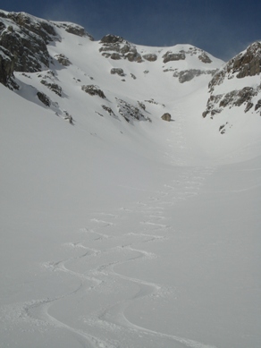 Ausstiegsrinne im linken Drittel, Achtung die Hänge sehen hier viel flacher aus, als sie in Wirklichkeit sind, im oberen Drittel des Bildes am kleinen Felsen im Hang ca. 38-über 40 ° steil