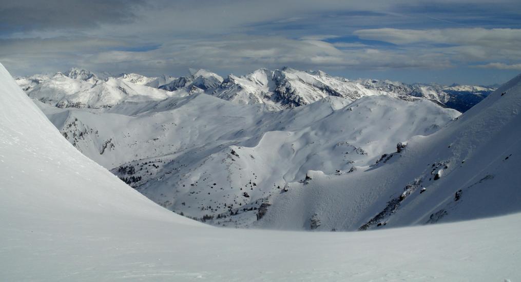 Alle Westhänge des Gebiets (auch Richtung Roßkopf, Pfundsjoch, kleiner Gilfert) waren stark abgeblasen. Auf den gesamten Flanken kann man grasige Stellen erkennen. Der Schnee muss hier also komplett in den Osthängen liegen.