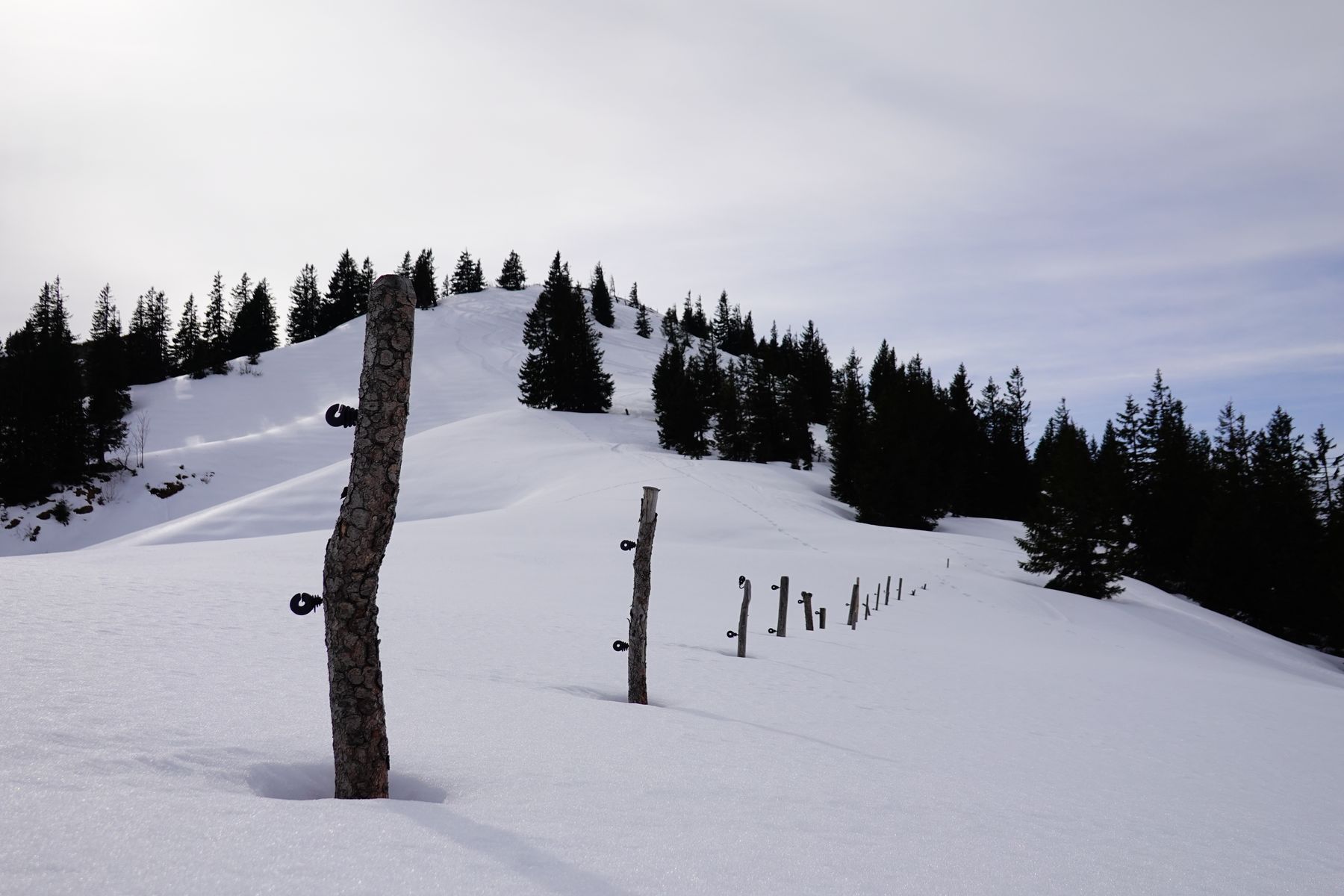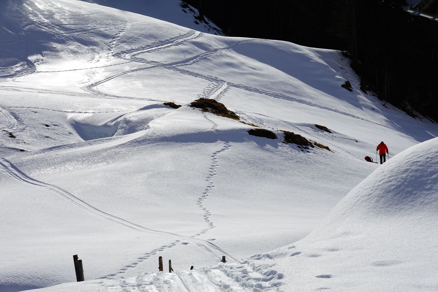 2 Tages Tour im Allgäu war geplant - Startpunkt gegen 9:30h in Balderschwang am Samstag (in Immenstadt stand das Auto, dann per Zug nach Fischen und per Bus No 46 nach Balderschwang - das geht sehr gut - wäre auch ganz mit Öfis gut gegangen). Die Loipen und die Skigebiete sind in Betrieb - mit dem Schnee sieht es aber vor allem auf der Südseite mager aus -- der Aufstieg auf den Heidenkopf 1685m ging mit 2x abschnallen noch ganz gut - die letzten Meter zu Fuß am Drahtseil zum Gipfel. Das Wetter war nicht ganz so sonnig wie erwartet - aber trotzdem gute Sicht. Alles sehr warm - die Abfahrt im schweren Tiefschnee zur Alpe Scheidwang noch ganz ok- man muss den Weg durch den Fichtenwald finden und auch den richtigen Abstieg vom Heidenkopf --- wir haben einen kleinen Umweg Richtung Siplinger Alpe genommen, das sind dann nochmal 50m Gegenanstieg. Unterwegs außer uns waren nur ein paar Wanderer. Von der Alm geht es über zum Hochgrat --- die letzten Schneefelder genutzt - nur kurz vor dem Gipfel abschnallen. Der Ausblick über die Nagelfuhkette sah weniger vielversprechend aus --- wohl am nächsten Tag auf Schneefeldsuche und viel tragen (die ostseitigen Rinnen haben schon noch Schnee - aber die Gegenanstiege sofern südexponiert sind fast schneefrei). Übernachtung auf dem Staufener Haus -- gut besucht -- vor allem von Rodlern und Schneeschugängern. Am ersten TAg sind das ca 1200hm bergauf - durch abwechslungsreiche Landschaft. Am Sonntag war das Wetter dann sehr bescheiden - das heißt Hochnebel und wenig Sicht. Daher haben wir umdisponiert und uns für den gleichen Weg zurück entschieden - im Nebel über die Nagelfuhkette mit vielem Tragen nach Immenstadt hätte eher nicht geklappt. Bleibt fürs nächste Mal.