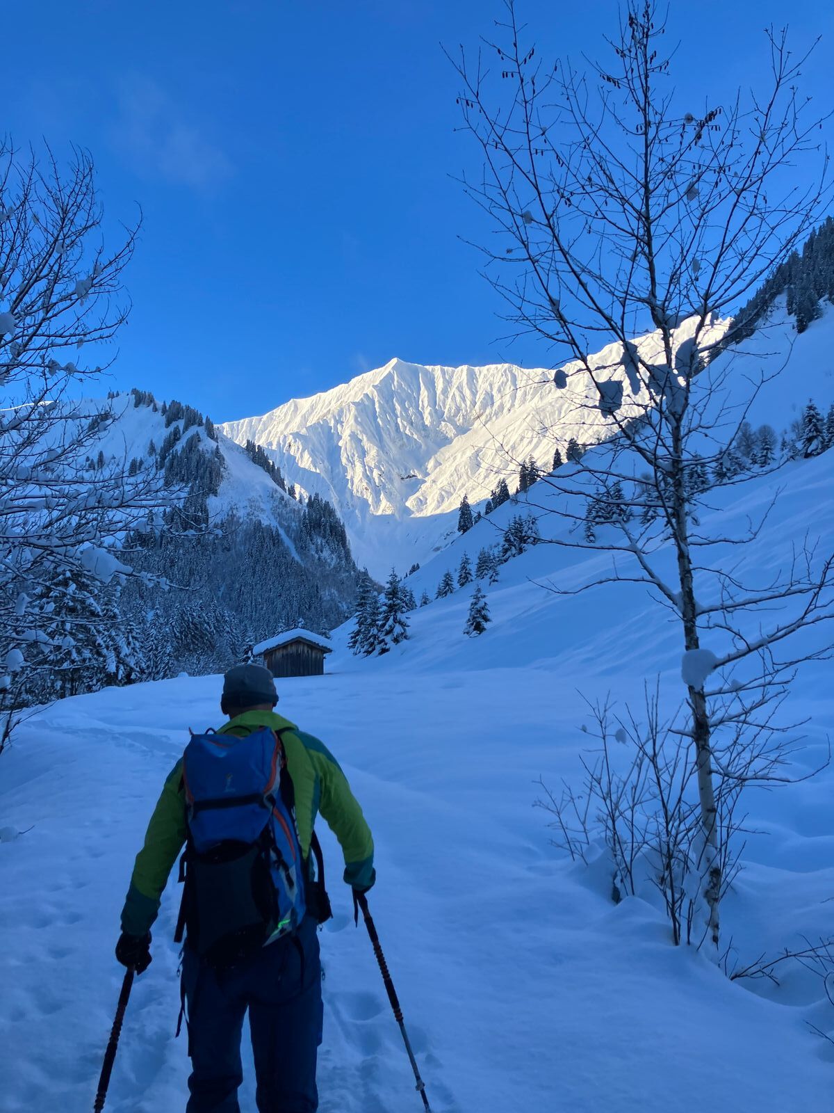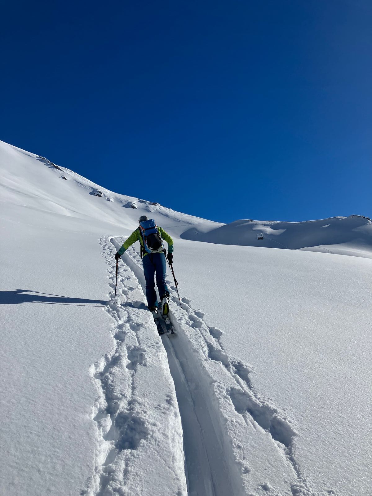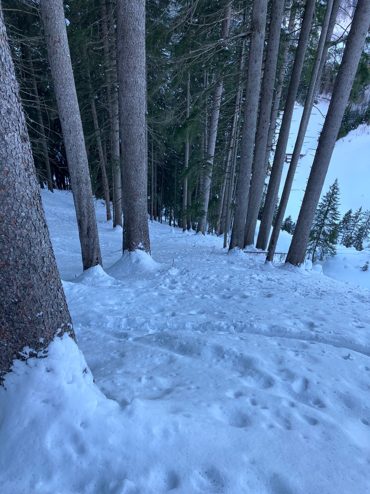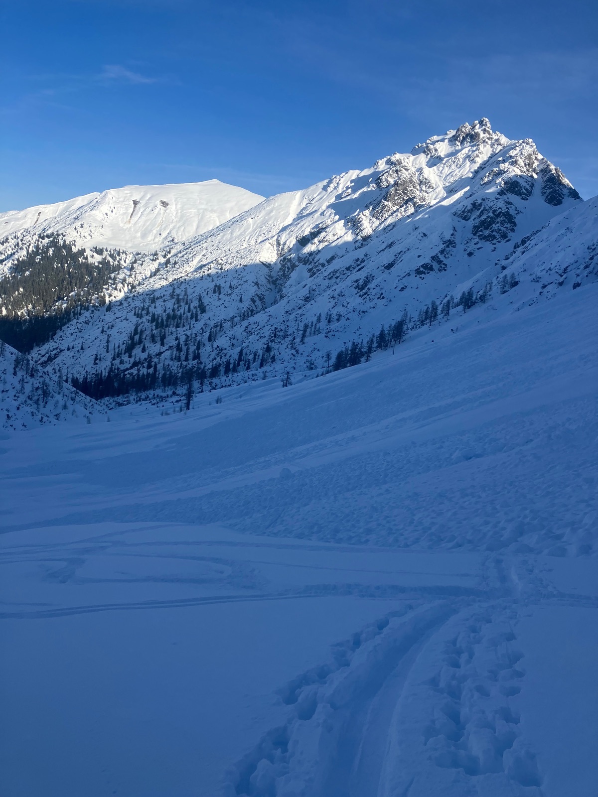 Die Forststraße ist grundsätzlich fahrbar – durchgehend allerdings nur für Menschen mit guter Skibelags-Toleranz. Der Rest schnallt gefühlt alle paar Minuten an und wieder ab. Die letzten rund 350 Hm sind dann endgültig wieder Tragepassage.