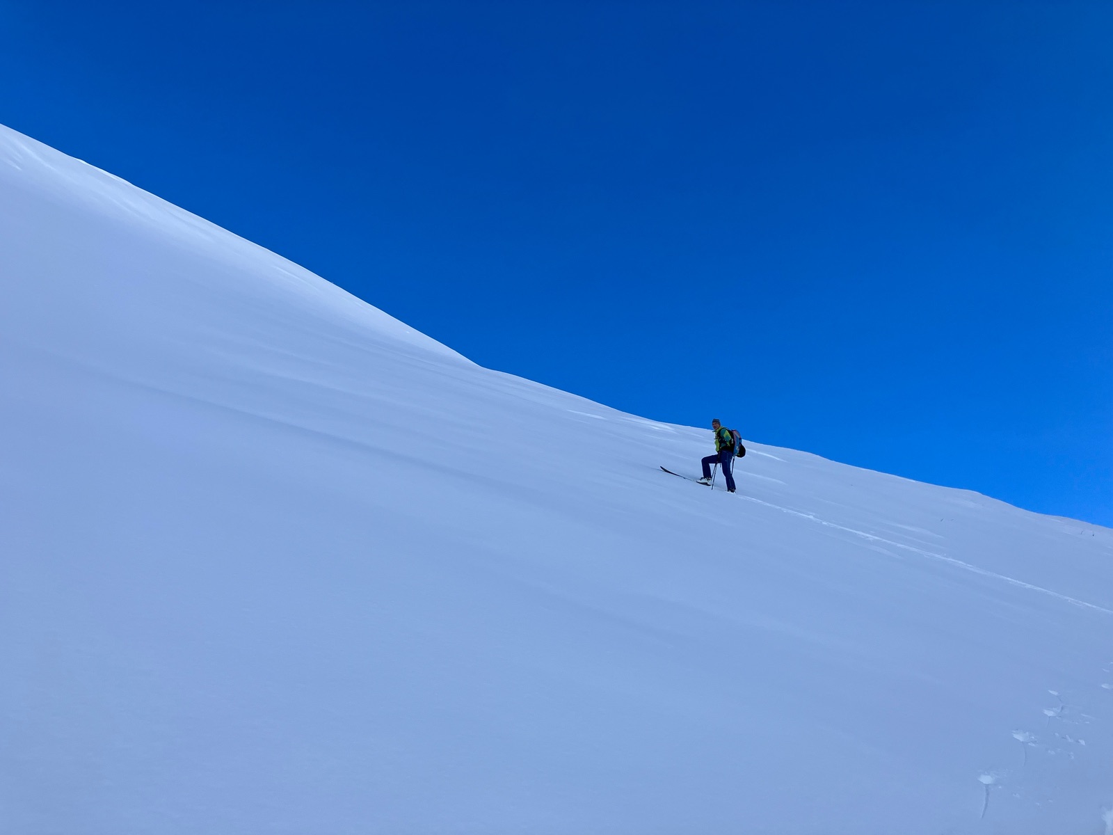 Hat man diesen Abschnitt hinter sich, wird man belohnt: Der Gipfelhang ist tatsächlich ein Traum. Am späten Vormittag war er auch ohne Harscheisen sehr gut zu gehen – perfekter Firnaufbau.