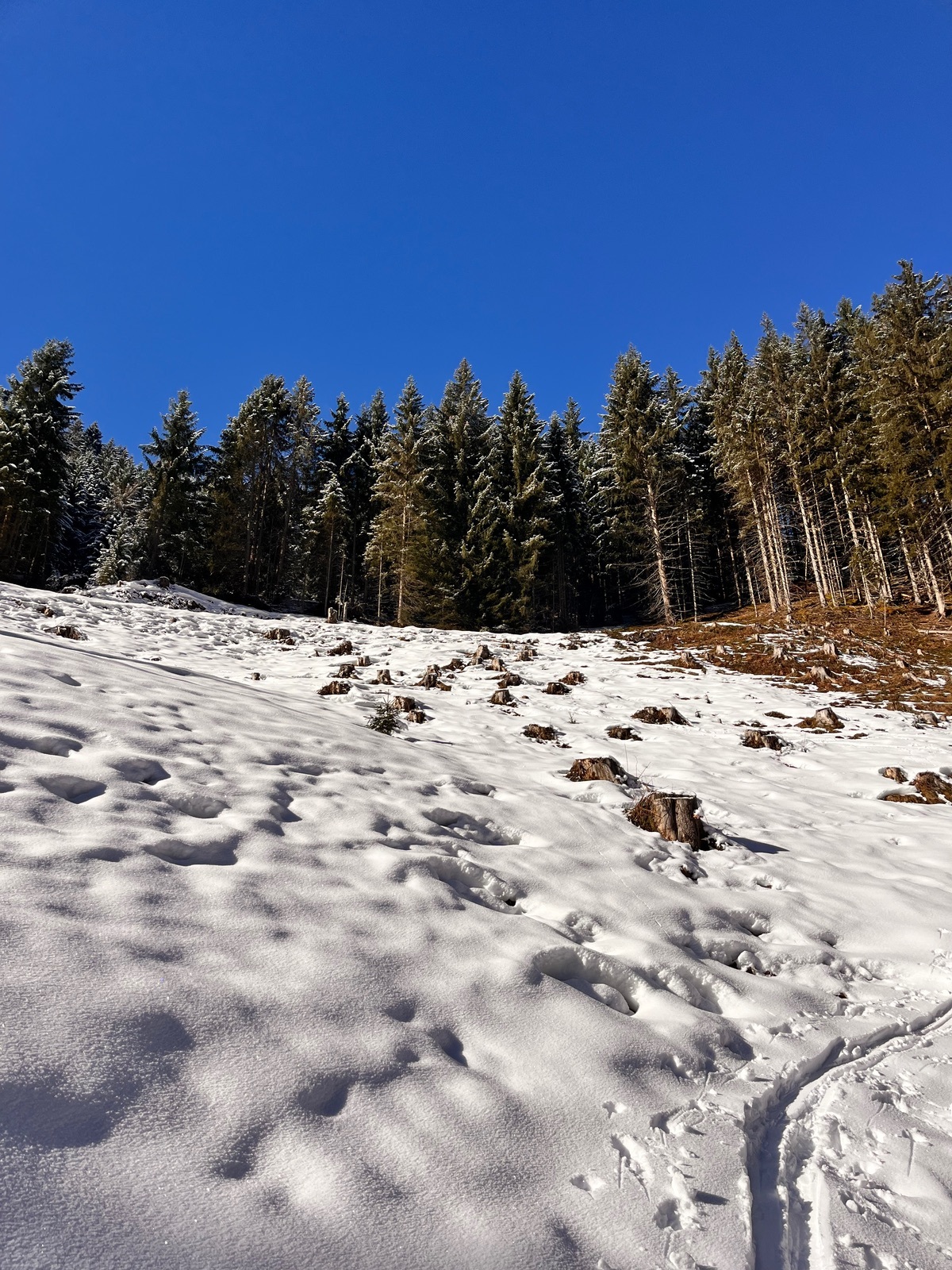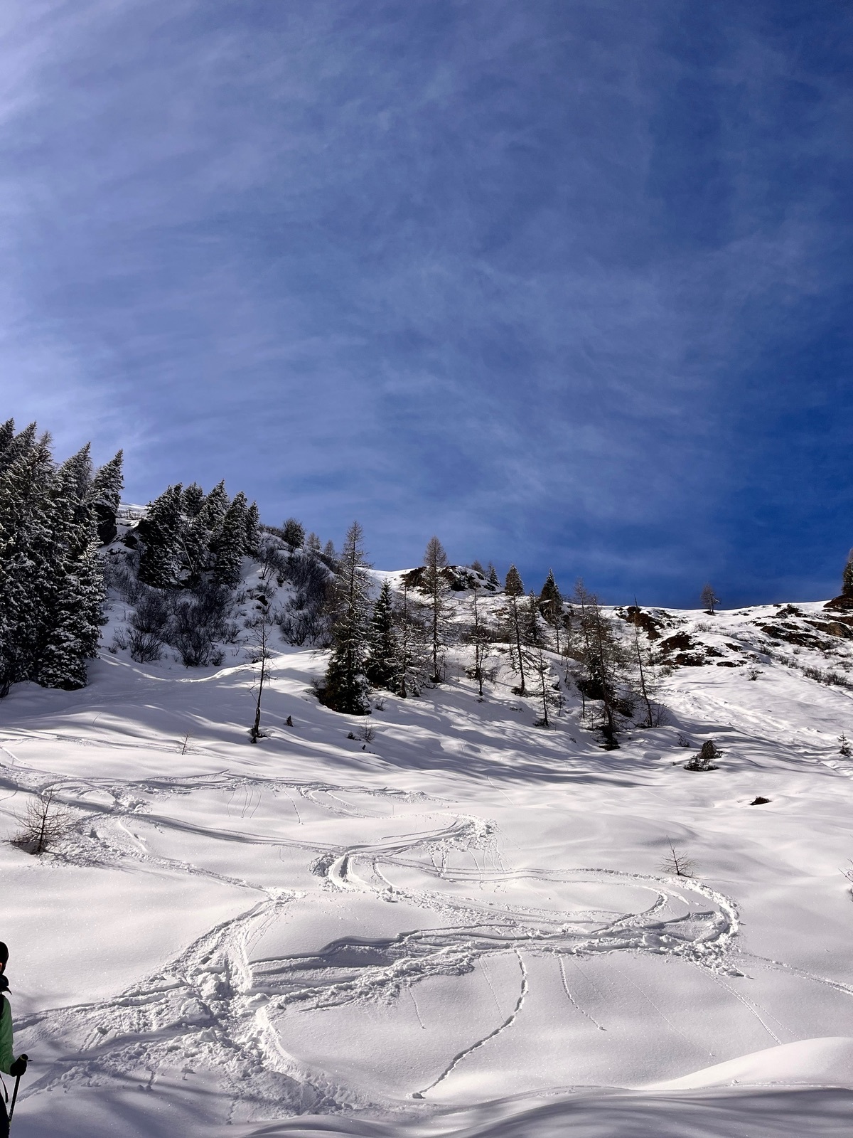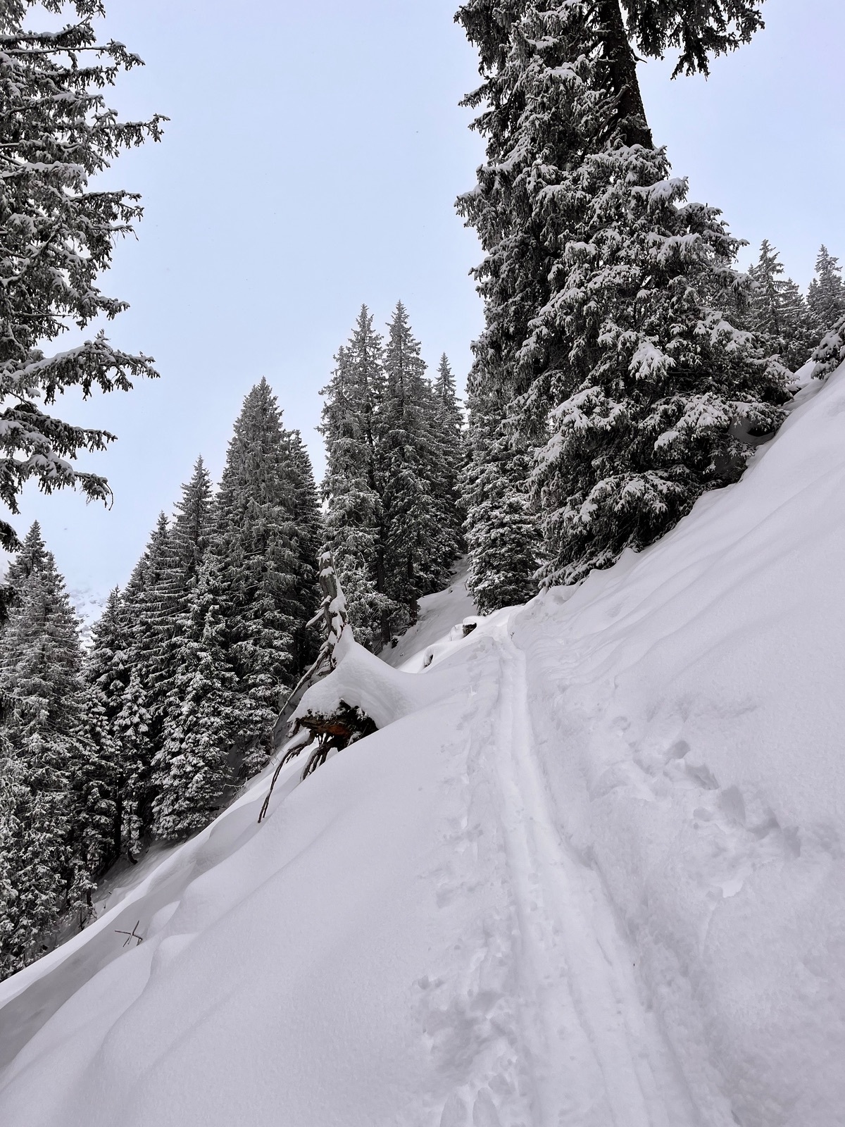 Aufstieg erst durch den Wald und dann zur Staffalm. Haben die Hänge vom Kornbichl gequert, die waren gar nicht einladend, abgeblasen und mit Deckel. Die Hänge die eher Richtung Sonnen zeigen könnten besser sein.