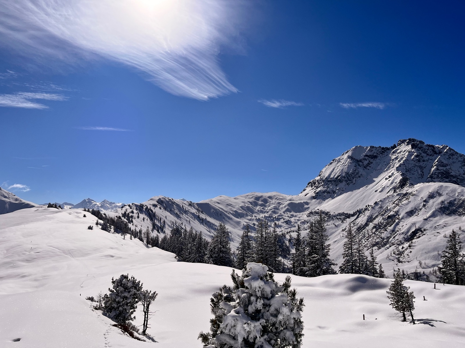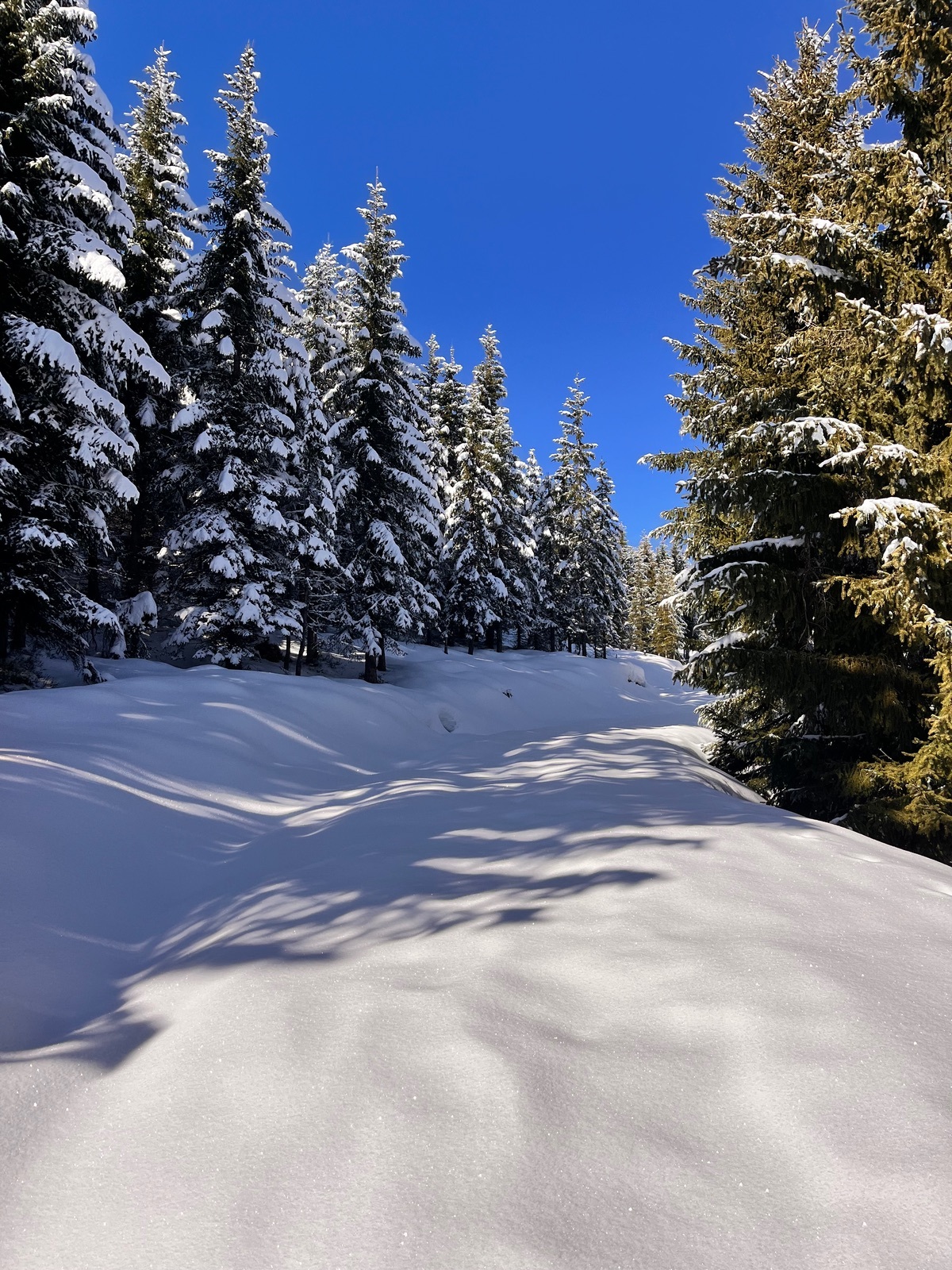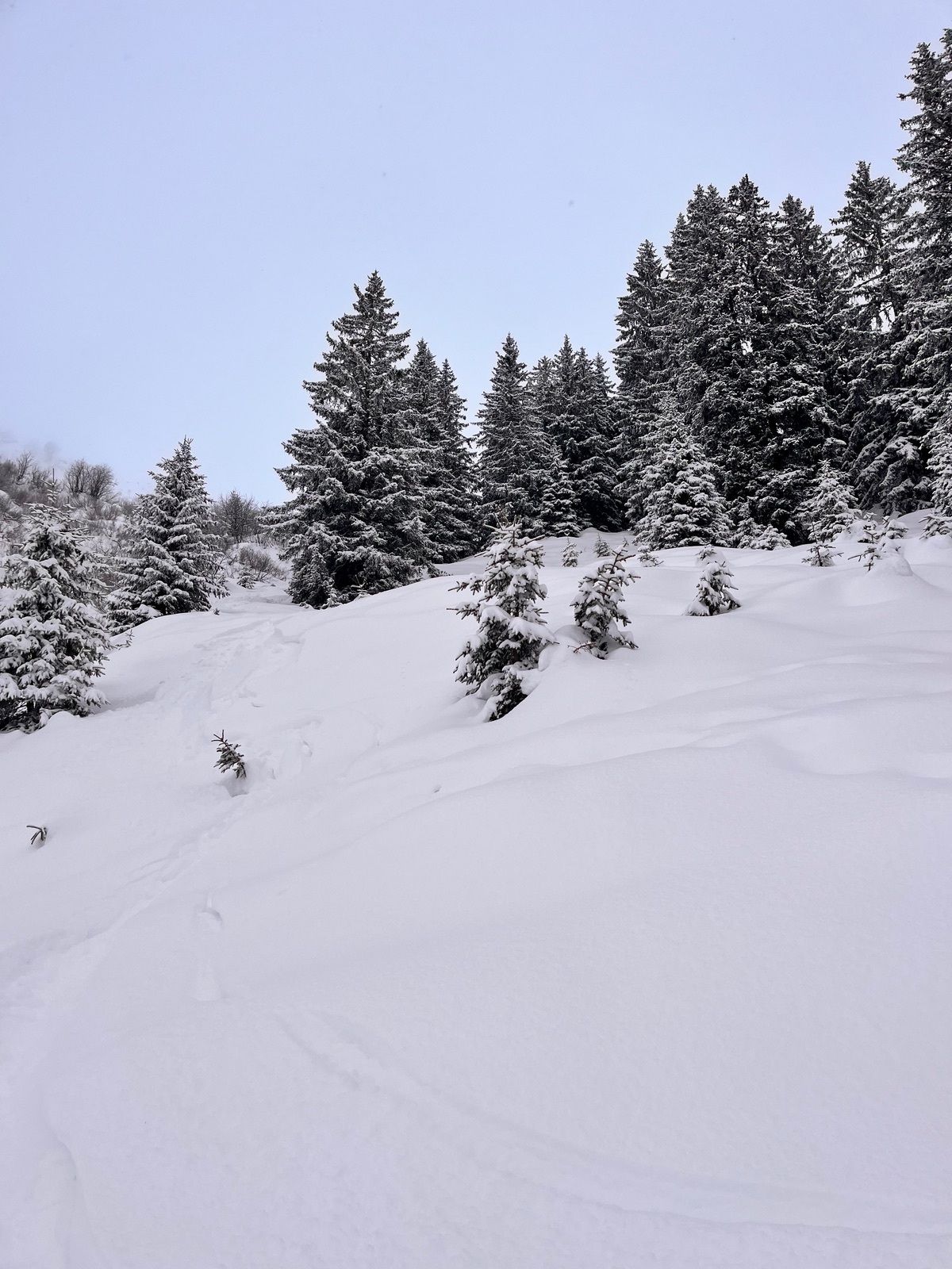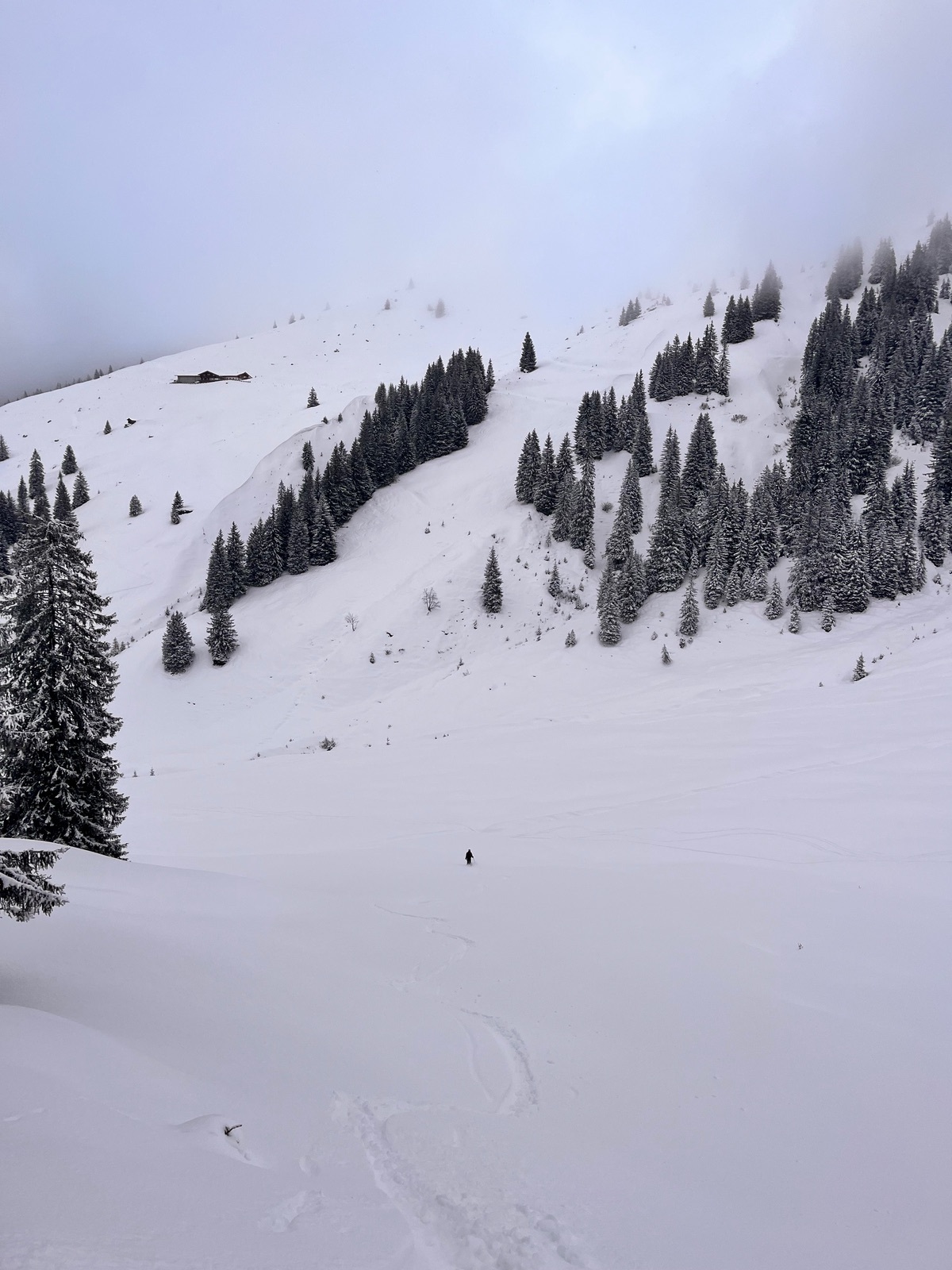 Aufstieg erst durch den Wald und dann zur Staffalm. Haben die Hänge vom Kornbichl gequert, die waren gar nicht einladend, abgeblasen und mit Deckel. Die Hänge die eher Richtung Sonnen zeigen könnten besser sein.