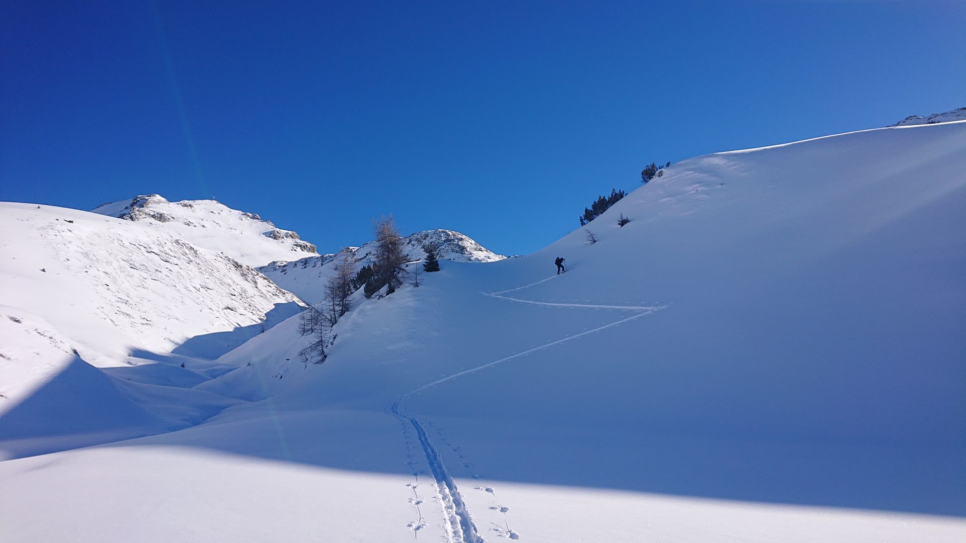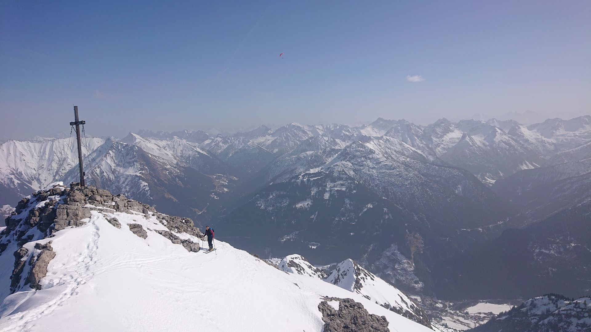 DA ich mich gestern früh nach einer anstrengenden Arbeitswoche nicht motivieren konnte zeitig aufzustehen, bin ich heute ausgerückt. Zur Auswahl stand eigentlich was im Lechtal (bspw. Schlenker Umfahrung) oder nach Sichtung der gestrigen Berichte zum Kaltenberg ganz und gar was im Arlbergd. Lech Warth Zuers sind schon wieder aus dem Lechtal zu erreichen. Geworden ist es dann was ganz anderes, nämlich der Entschenkopf im Retterschwanger Tal unweit des Nebelhorns. Ein Tour sozusagen seit neuestem quasi direkt ab der Haustüre. Mit dem Radl gings vom Wiesengrund in Bad Hindelang bei frischen 3-4 Grad heute morgen um 06.30 rein ins Retterschwanger Tal (ging grad noch so ohne Handschuhe). Bis zu den Ställen auf 1130m war das auch noch ganz gut machbar mit dem Biobike. Danach die Rampe zur Entschalpe (1450m) hatte es aber in sich. Hier hab ich mal ein Stückchen im steilsten Stück geschoben (15%?!). Kurz nach der letzten Kehre im Bereich 1400m hab ich dann das Radl ins Gemüse geworfen und die Ski angeschnallt. Es waren noch 2 größere Gruppen zu meiner Überraschung unterwegs. Rauf gings den weiteren Weg in einem Großen Bogen unterm Nebelhorn entlang. In der Sonne ab 8 war der Schnee gleich deutlich weicher als im Schatten. Bis zum Skidepot direkt unterm Entschengrat auf knapp unter 2000m war das Gelände eig. vollkommen entspannt zu begehen. Bin dann in ein paar Minuten noch die paar hm rauf zum Gipfel und gleich wieder abgefahren gegen 09:15. Es war nahezu perfekt aufgefirnt. Bin direkt die Ostseite runter bis ca. 1700m. Dann Felle wieder drauf und nochmals rauf bis zum Skidepot. Zweite Abfahrt 10:15 auch noch gut aber diesmal noch ca. 120m weiter runter entlang eines Baches. War aber nicht der Hit, weil doch viel mehr apere Stellen dort kamen. Letzter Aufstieg dann um 10:30 nochmals. Leider ist dann dabei dort am Skidepot einer der Ski abgehauen, was nochmals 80 hm extra waren. Abfahrt dann um 12:15 im schon zu weichen Schnee entlang des ersten Aufstiegs. In den flachen Bereichen hats schon ordentlich gebremst, weshalb ich Ri Nebelhorn Nordwand gequert bin. Dort flutschte der Schnee wieder besser, da dieser Bereich vmtl erst 1-1,5h in der Sonne gewesen ist. Unter 1600m war der Schnee schon sehr noppig und war dementsprechend nicht mehr so toll zu fahren. Abfahrt mit dem MTB dann die 11km zurück nach Hindelang - eine wahre Wohltat