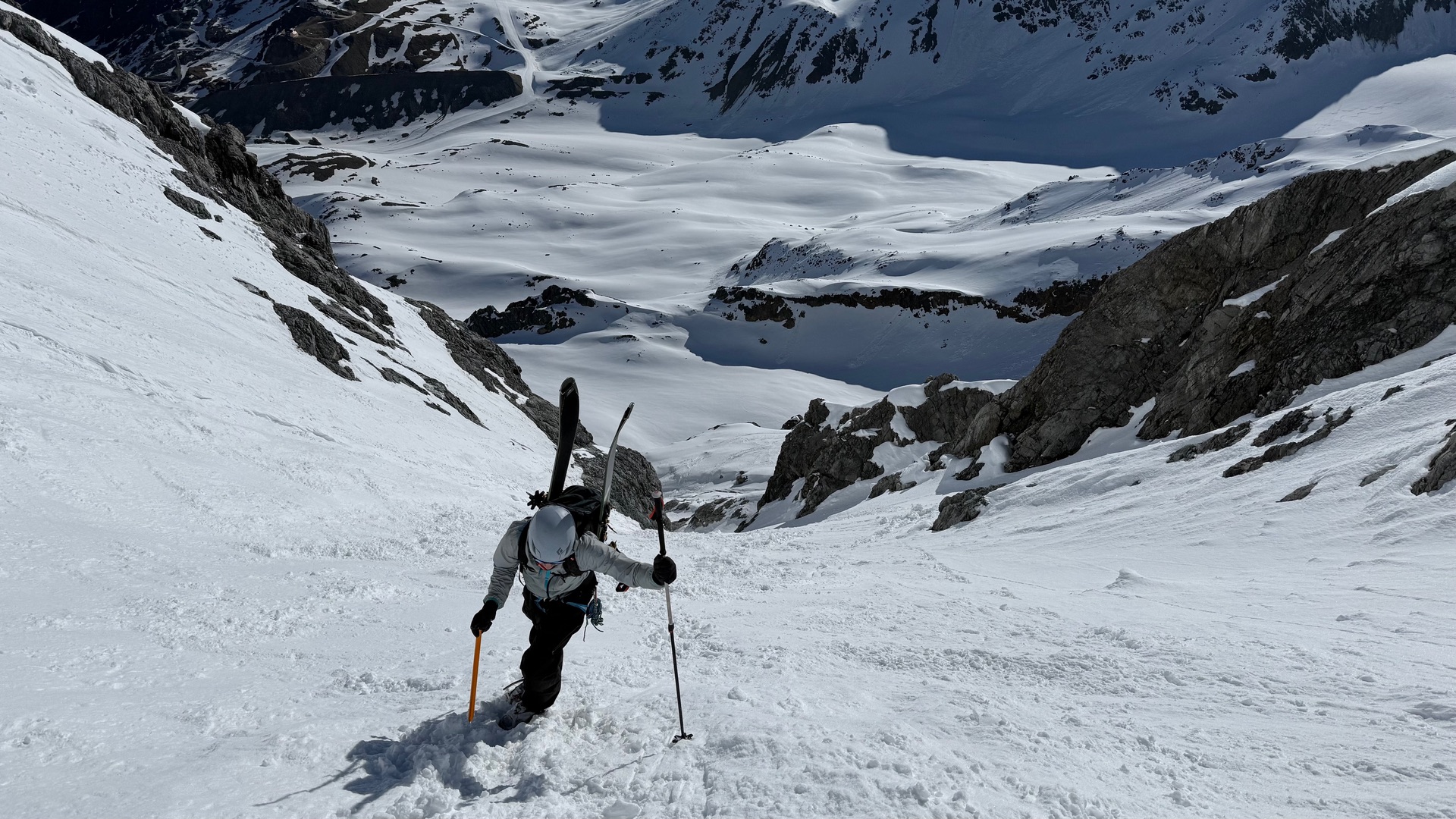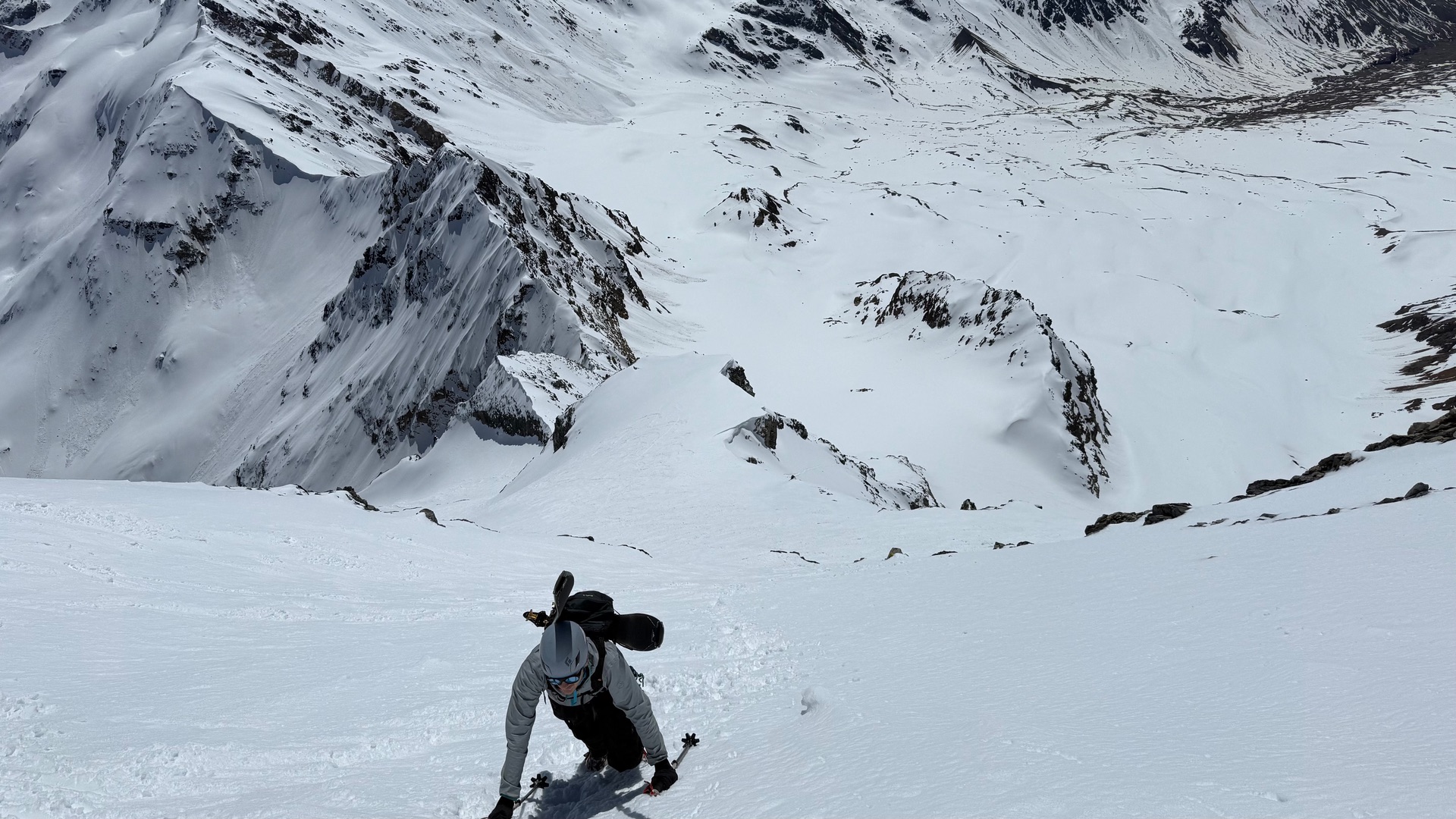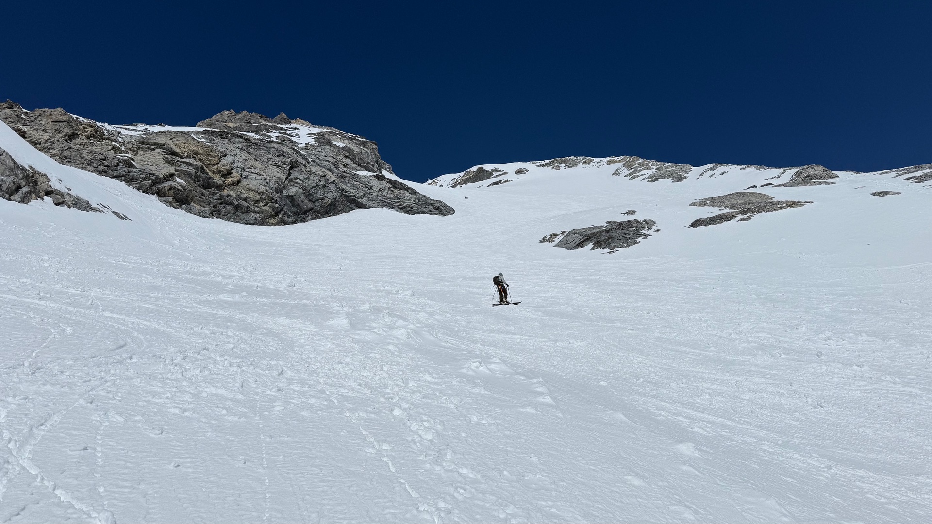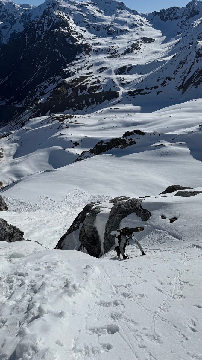 In der Abfahrt erwies sich der Gipfelhang dann als etwas heikel: Um 12:30 war er schon etwas weich, und man musste gut wegen Steinen aufpassen. Dort oben möchte man nicht ins Stürzen kommen! Die weitere Abfahrt bis zum Einstieg in die Ostrinne im 35Grad Gelände war dann eine brauchbare Mischung aus angesulztem Triebschnee und Firn. An der Rinne angelangt haben wir uns dann aufgrund eines Tourenberichts vom 1.5.25 auf gipfelbuch.ch für die südliche Variante entschieden. Wir waren die ersten, die diese Variante gewählt haben und haben etwas fauligen Triebschnee in der Rinne vorgefunden, den wir aber vor uns abräumen konnte. Die Abfahrt über die nördliche Aufstiegsrinne wäre sicherer gewesen, aber auch deutlich zerfahrener und von Lawinenrutschern zerfurchter. In der Rinne ist noch ausreichend Schnee, sodass man wegen einem Verhakeln an Steinen eigentlich keine Angst haben muss (gute Teile der Rinne müssen ja abgerutscht werden).