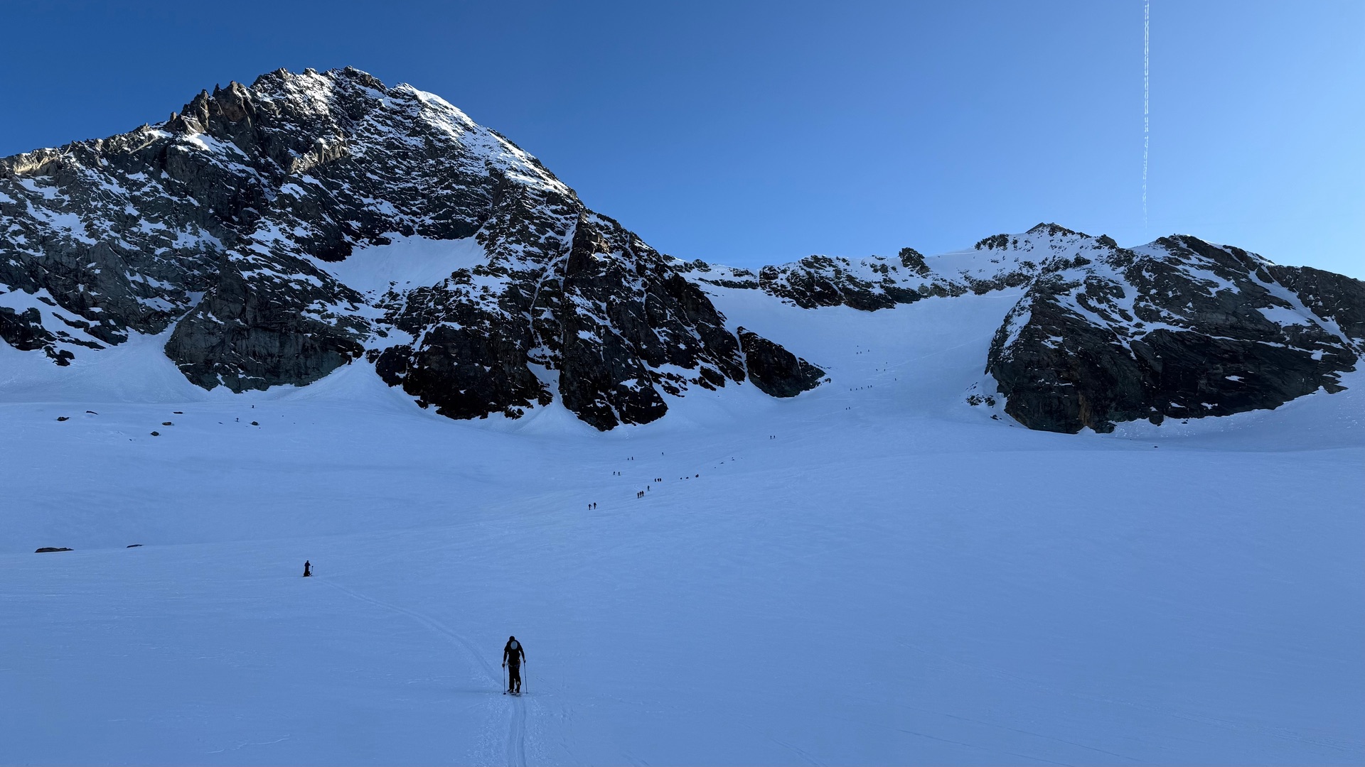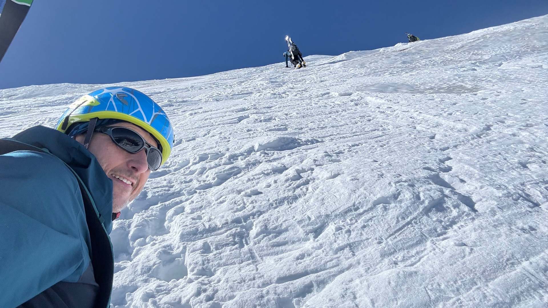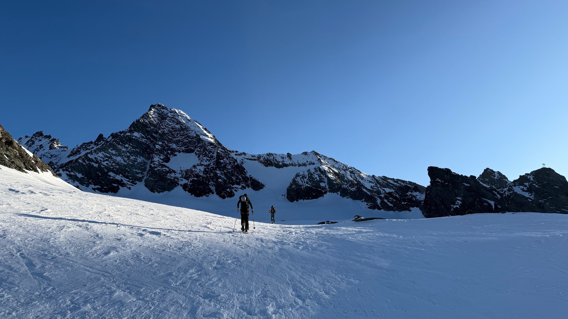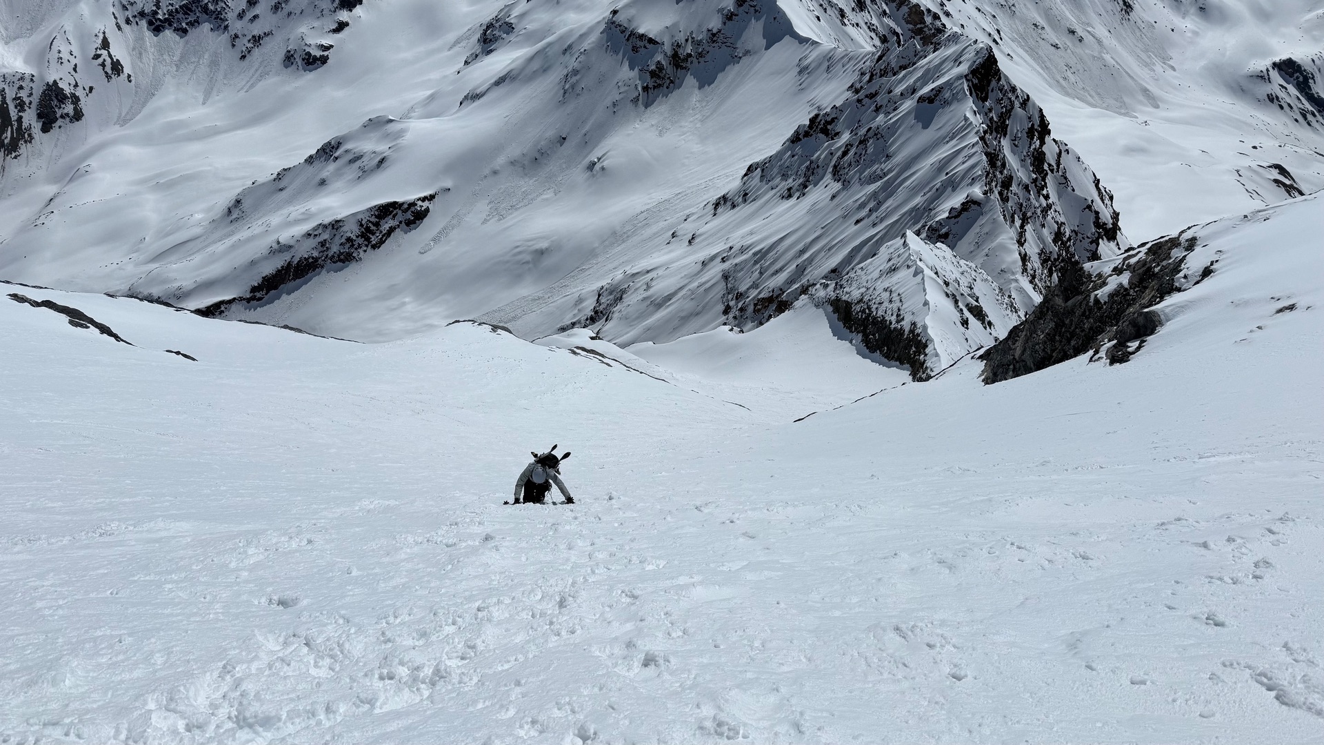 In der Abfahrt erwies sich der Gipfelhang dann als etwas heikel: Um 12:30 war er schon etwas weich, und man musste gut wegen Steinen aufpassen. Dort oben möchte man nicht ins Stürzen kommen! Die weitere Abfahrt bis zum Einstieg in die Ostrinne im 35Grad Gelände war dann eine brauchbare Mischung aus angesulztem Triebschnee und Firn. An der Rinne angelangt haben wir uns dann aufgrund eines Tourenberichts vom 1.5.25 auf gipfelbuch.ch für die südliche Variante entschieden. Wir waren die ersten, die diese Variante gewählt haben und haben etwas fauligen Triebschnee in der Rinne vorgefunden, den wir aber vor uns abräumen konnte. Die Abfahrt über die nördliche Aufstiegsrinne wäre sicherer gewesen, aber auch deutlich zerfahrener und von Lawinenrutschern zerfurchter. In der Rinne ist noch ausreichend Schnee, sodass man wegen einem Verhakeln an Steinen eigentlich keine Angst haben muss (gute Teile der Rinne müssen ja abgerutscht werden).