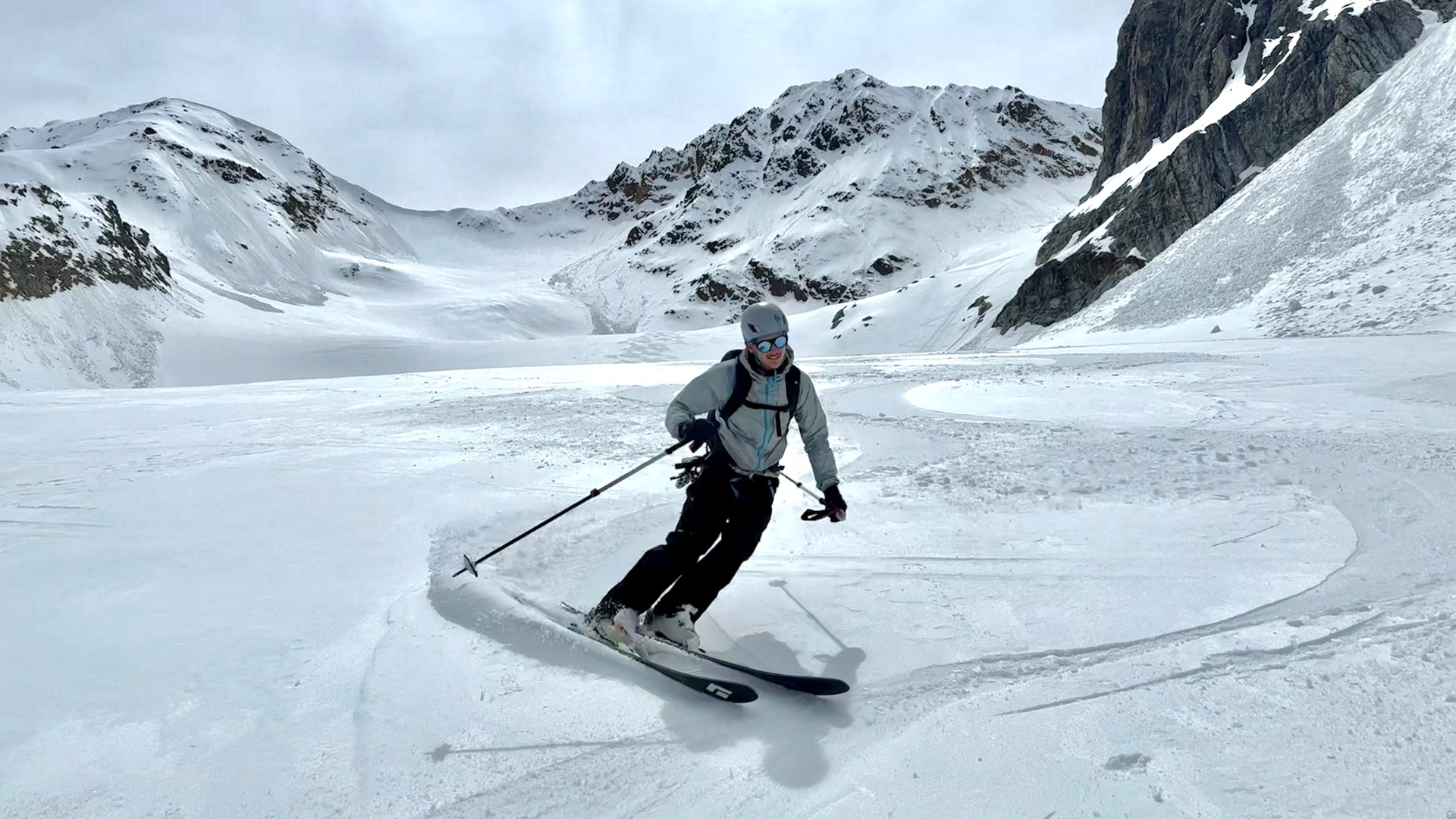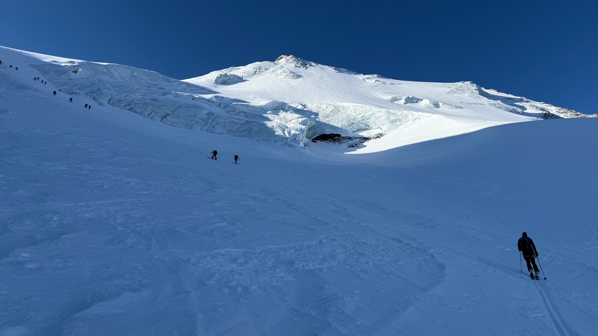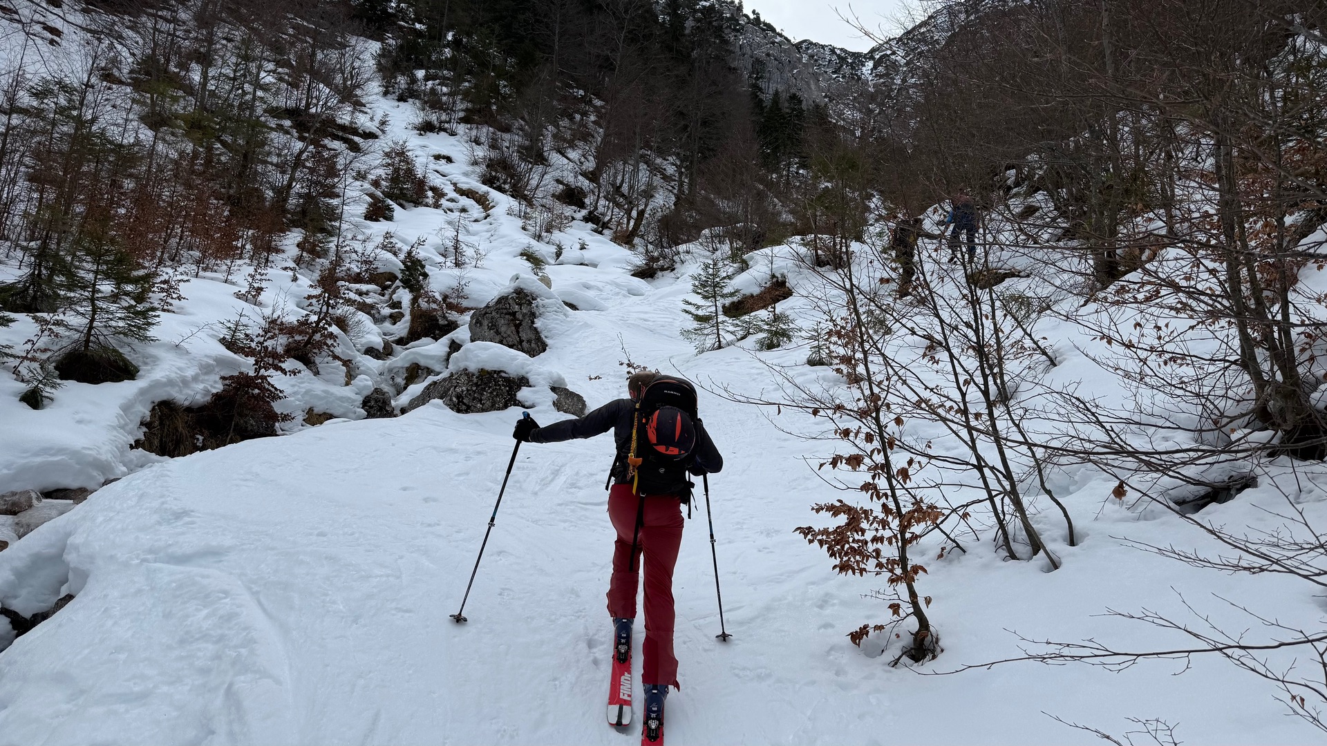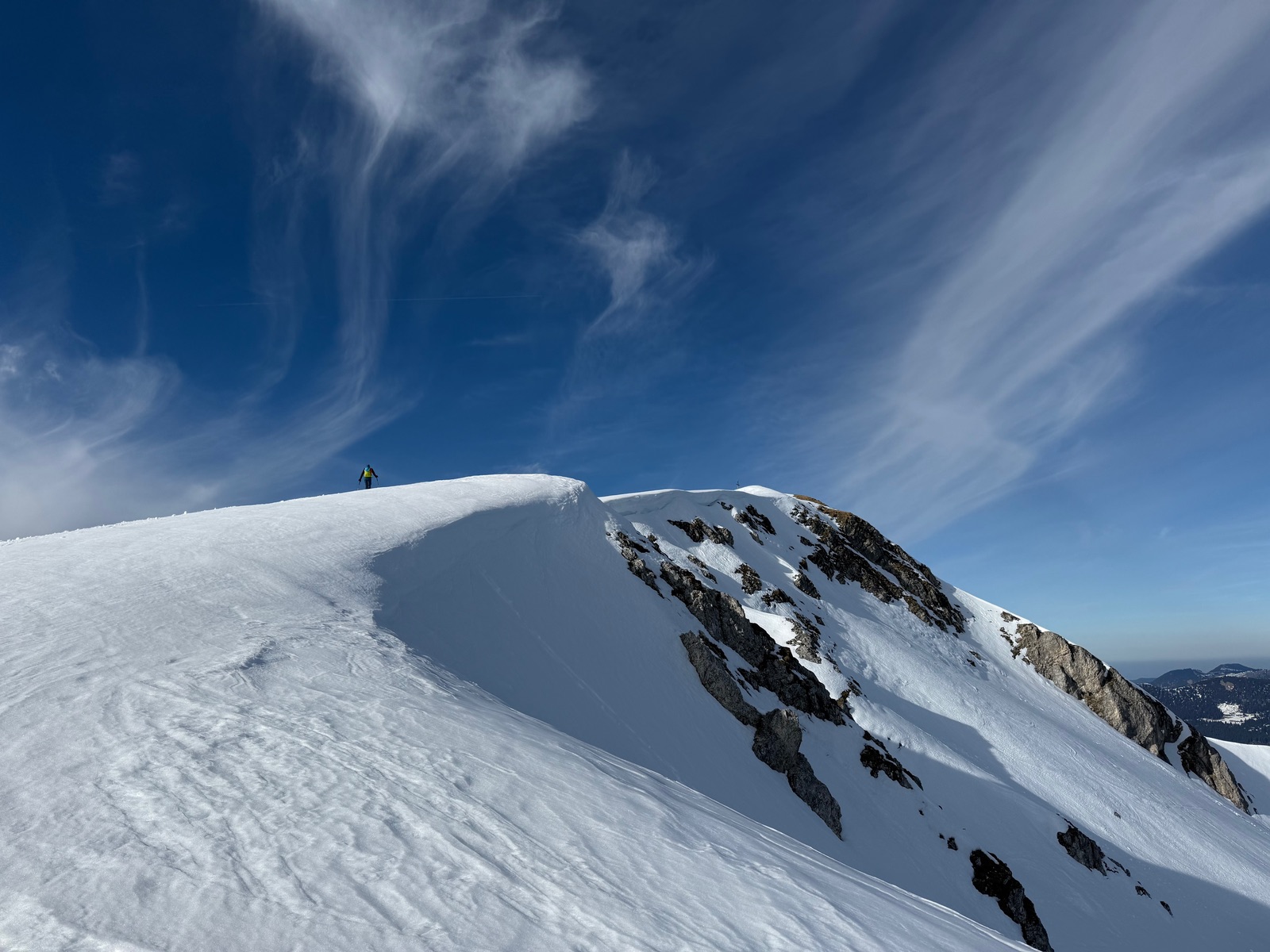 In der Abfahrt erwies sich der Gipfelhang dann als etwas heikel: Um 12:30 war er schon etwas weich, und man musste gut wegen Steinen aufpassen. Dort oben möchte man nicht ins Stürzen kommen! Die weitere Abfahrt bis zum Einstieg in die Ostrinne im 35Grad Gelände war dann eine brauchbare Mischung aus angesulztem Triebschnee und Firn. An der Rinne angelangt haben wir uns dann aufgrund eines Tourenberichts vom 1.5.25 auf gipfelbuch.ch für die südliche Variante entschieden. Wir waren die ersten, die diese Variante gewählt haben und haben etwas fauligen Triebschnee in der Rinne vorgefunden, den wir aber vor uns abräumen konnte. Die Abfahrt über die nördliche Aufstiegsrinne wäre sicherer gewesen, aber auch deutlich zerfahrener und von Lawinenrutschern zerfurchter. In der Rinne ist noch ausreichend Schnee, sodass man wegen einem Verhakeln an Steinen eigentlich keine Angst haben muss (gute Teile der Rinne müssen ja abgerutscht werden).