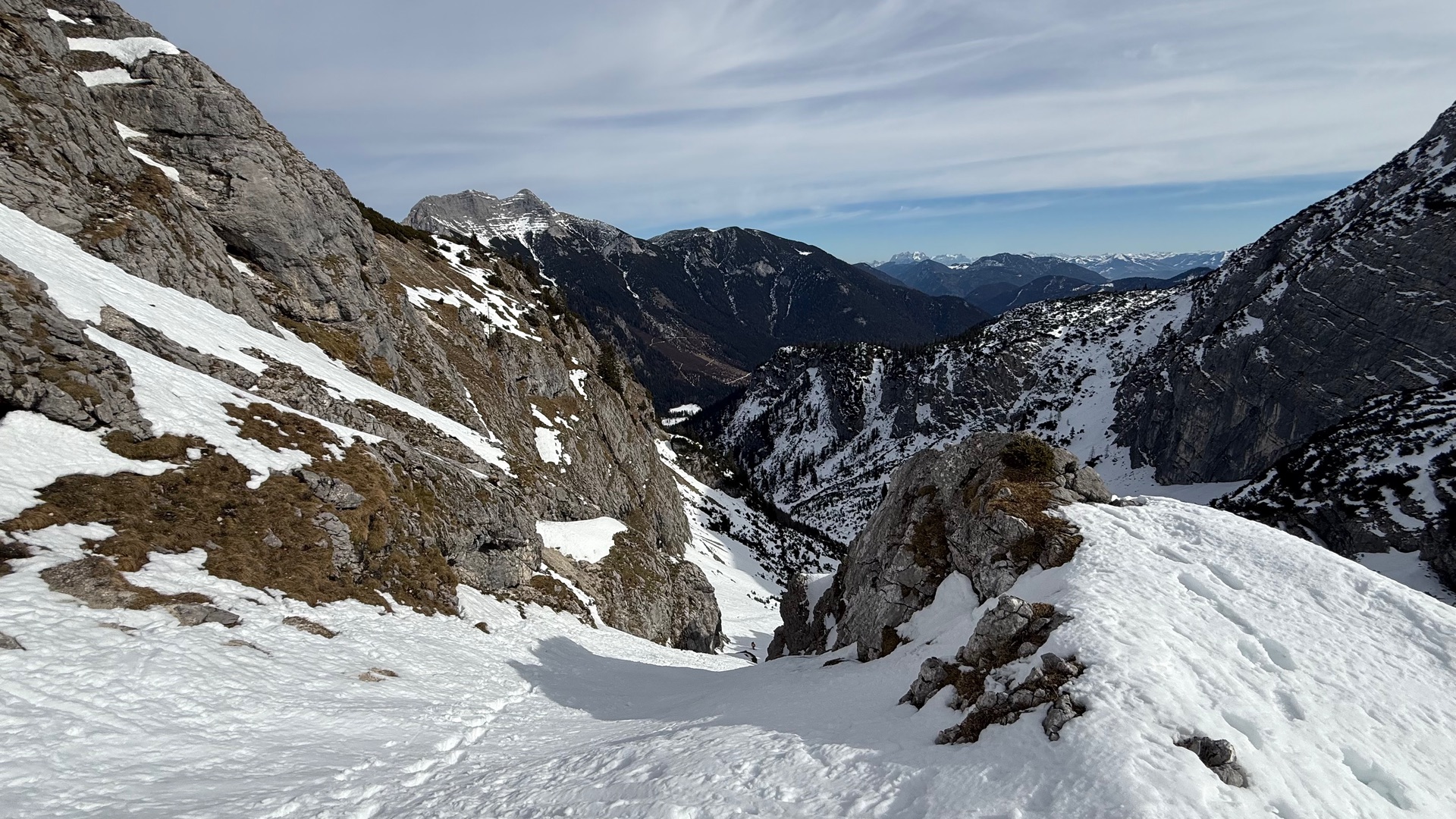 Der Blick zurück. Die Ostrinne ist entlang der linken Bergflanke recht gut zu sehen