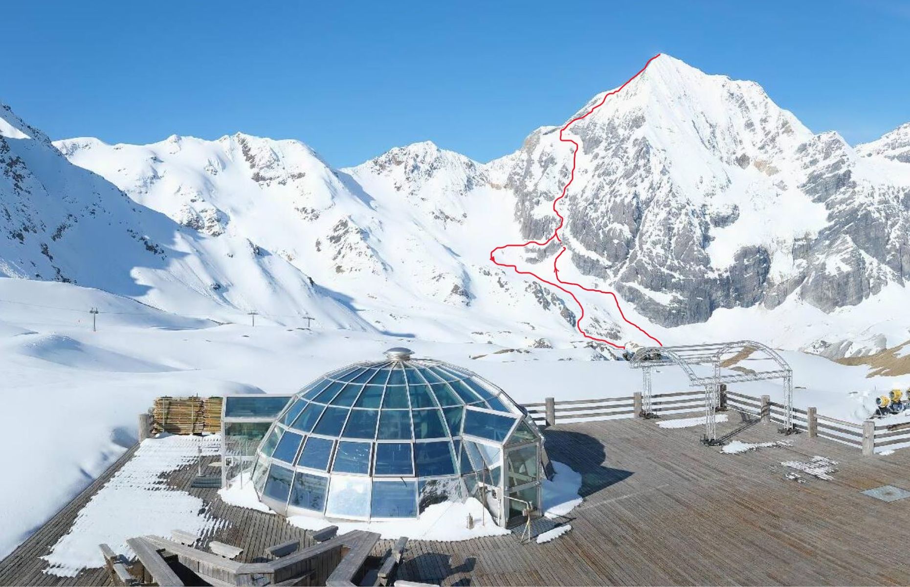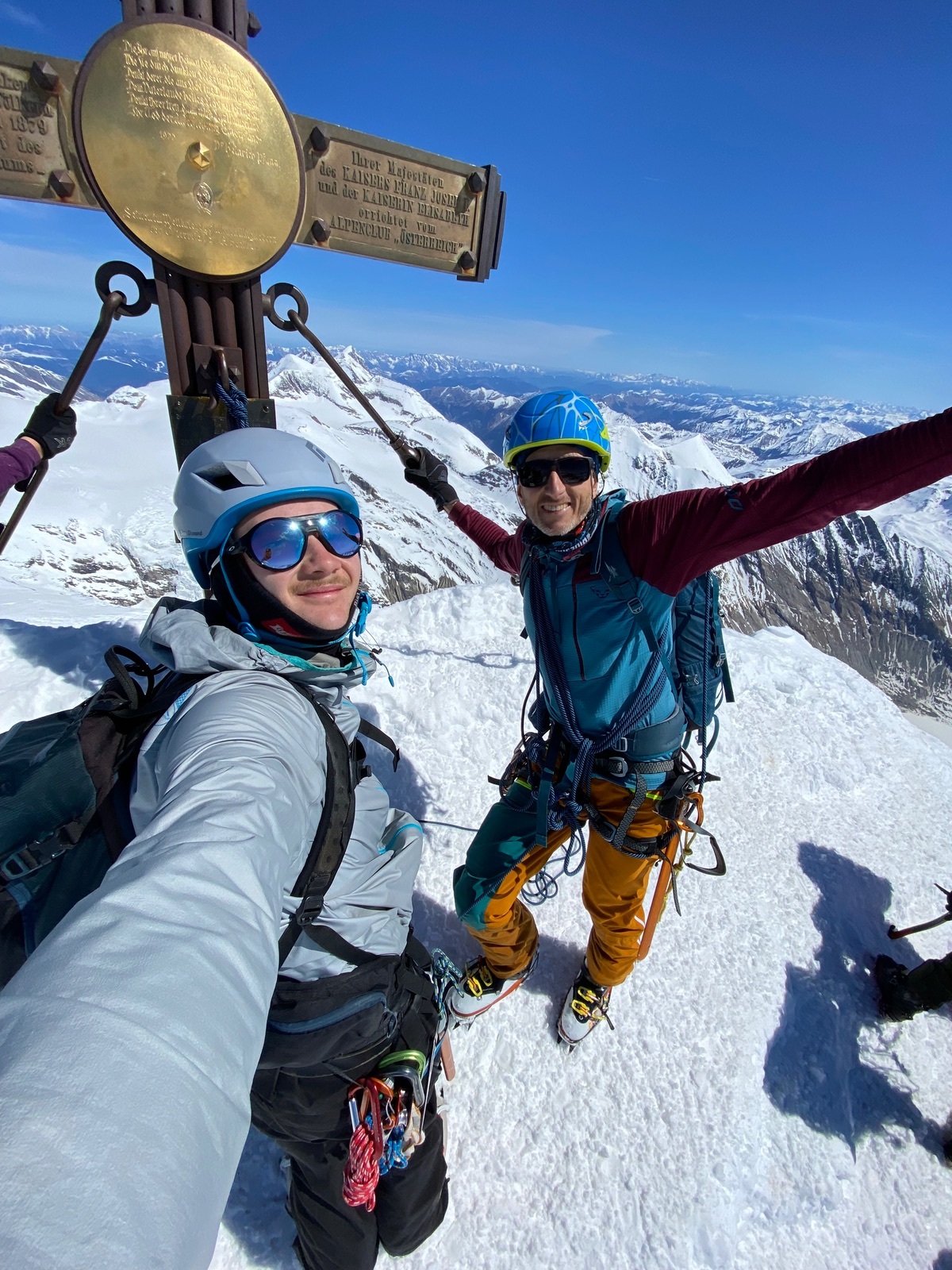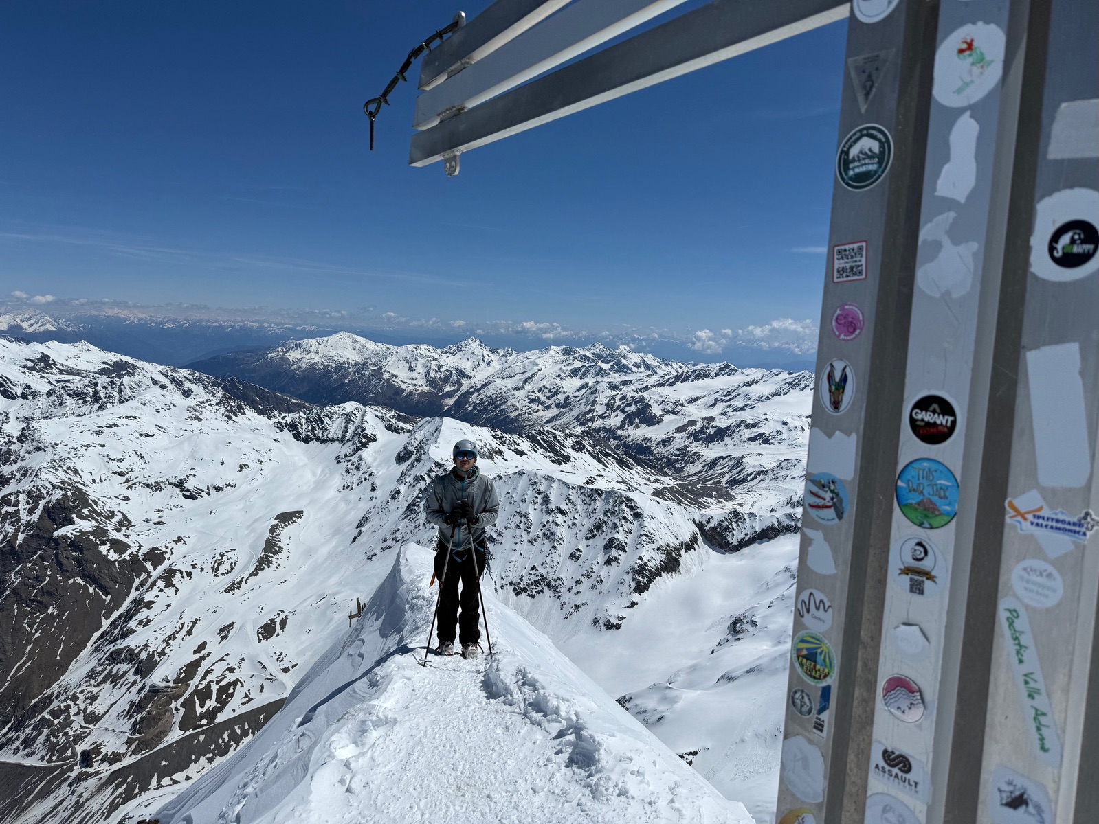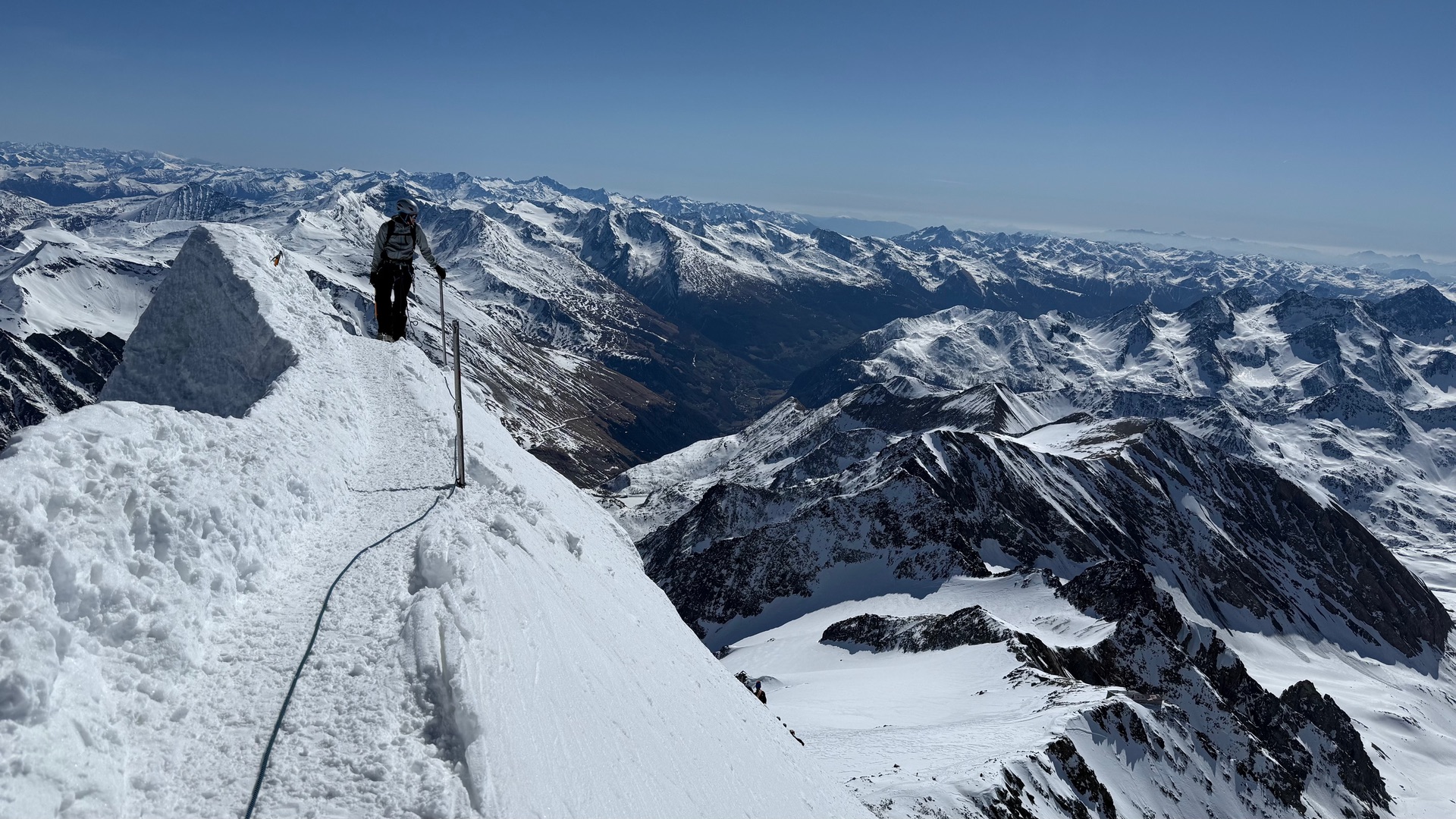 Wir sind dann am Montag um 4:45 gestartet, was fast ein wenig spät war. Die ersten 4km mussten wir die Ski bis weit hinter die Mittelstation der Madritschgondelbahn tragen (bis ca. 2400hm). Dann ging's endlich in die Ski und für 500hm auf festem Harsch bis zum Einstieg in die Ostrinne. Wir sind direkt entlang des alten Lawinenkegels durch das kurze Felsenband eingestiegen (ca. 20hm leicht vereiste Stelle). Erst in der Abfahrt haben wir gesehen, dass man das links herum umgehen hätte können (siehe Übersichtsbild). Der Durchstieg der Ostrinne selbst verlief in sehr gutem Stapfschnee. Die sporadischen Schneefälle der Tage davor hatten glücklicherweise keine zu tiefe Weichschneeschicht hinterlassen. Nach 500hm erreicht man den Ausstieg der Rinne und kann wieder für etwa 300hm die Ski benutzen. Auch hier haben wir recht griffigen Schnee vorgefunden. Dann steilt der Hang aber wieder gut über 35Grad auf und wir sind wieder auf die Steigeisen umgestiegen. Die letzten 100hm zum Gipfelgrat muss man ohnehin mit Steigeisen machen. Wir haben den direkten Südaufschwung gewählt, weil auch hier guter Stapfschnee zu finden war. Vom Grat geht es dann noch kurz ausgesetzt, aber in guter Spur zum Gipfelkreuz.