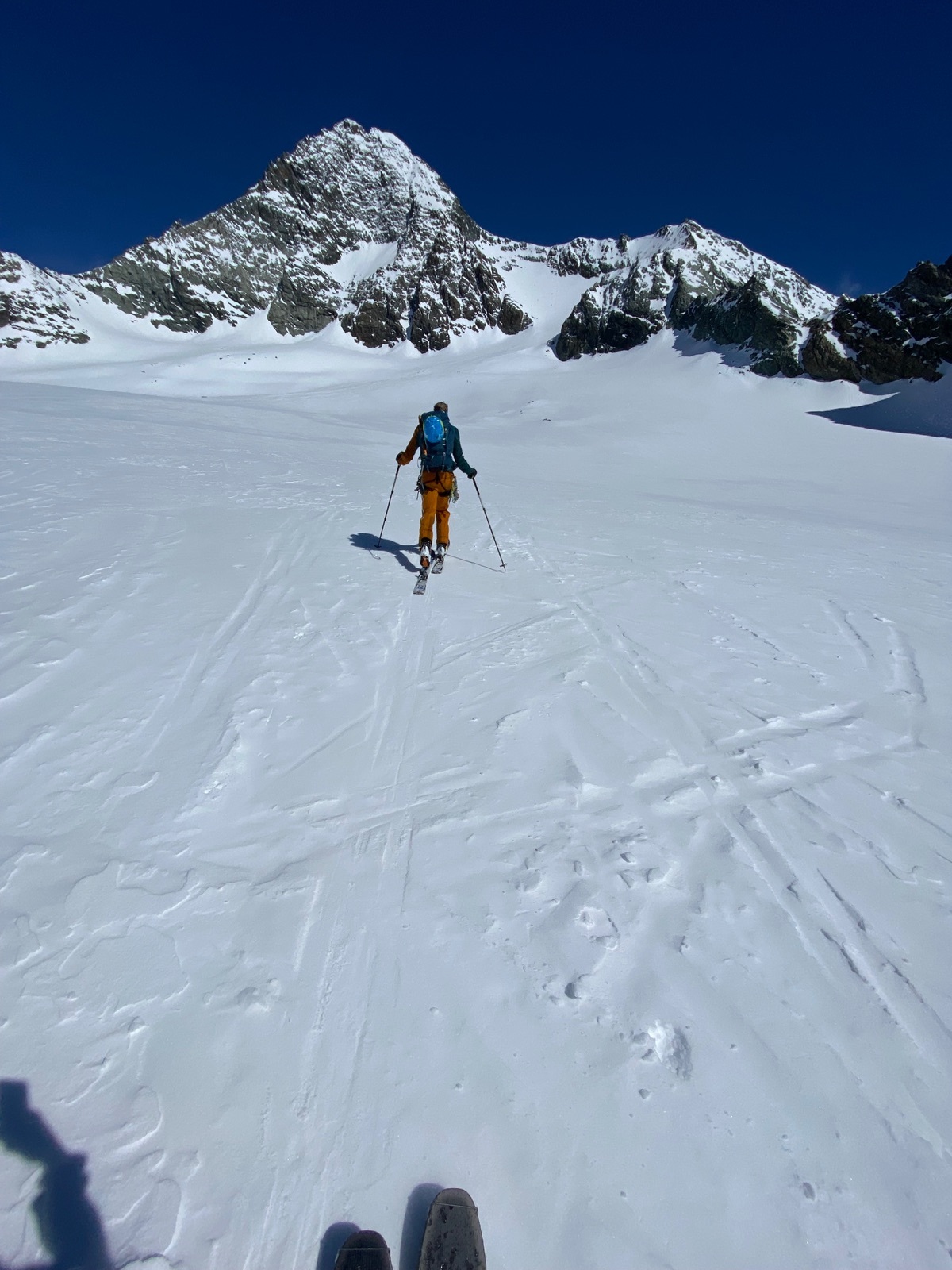 Nach der Ausfahrt aus der Rinne wurden wir dann zur Belohnung für die ganzen Mühen noch über 500hm mit feinstem Firn belohnt. Leider war der Genuss nur von kurzer Dauer, denn im Anschluss haben uns wieder die 450hm Abstieg mit Ski am Rücken erwartet.