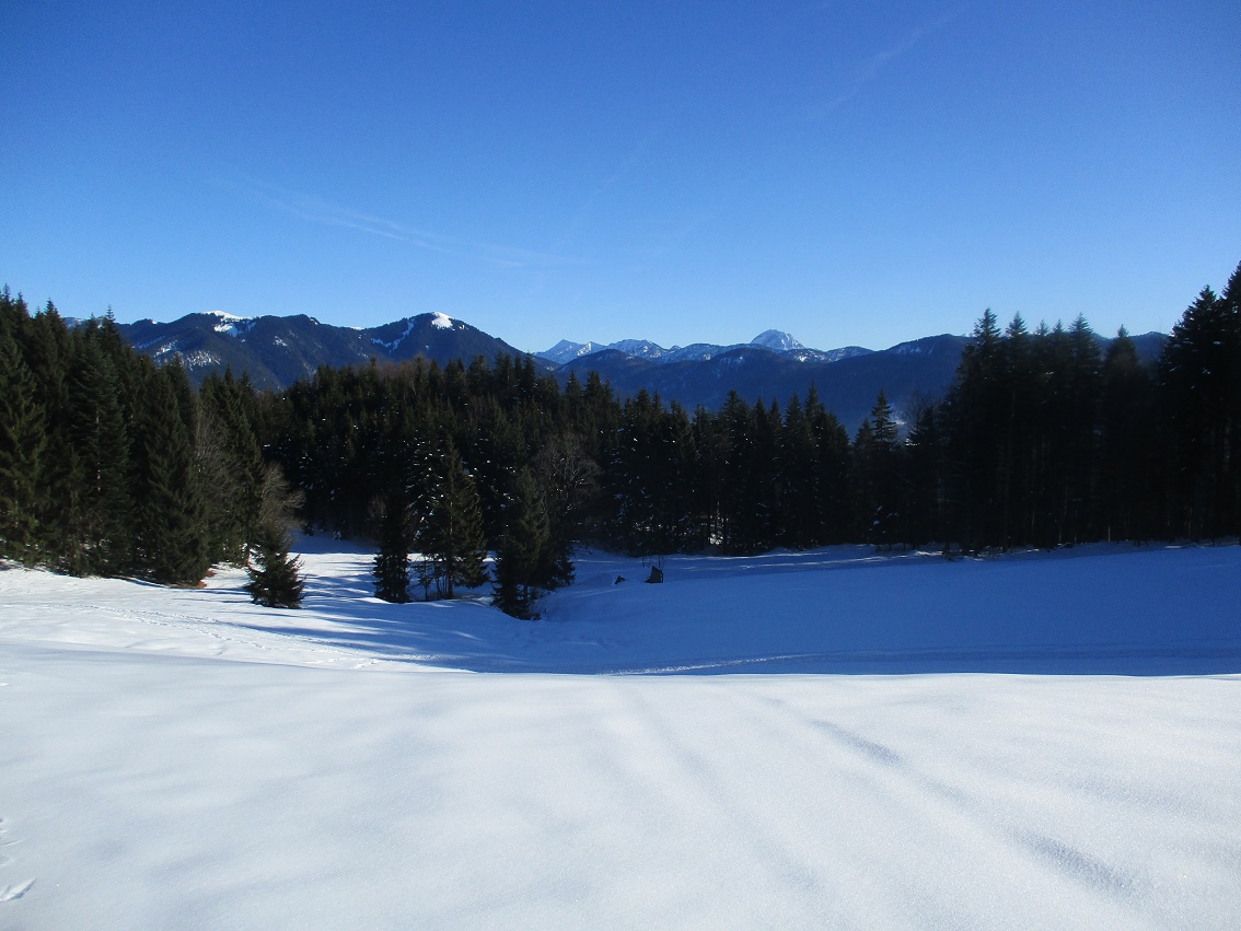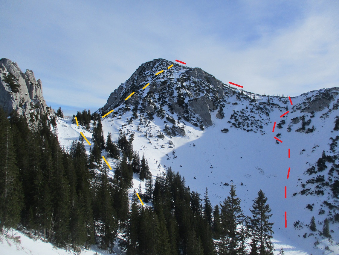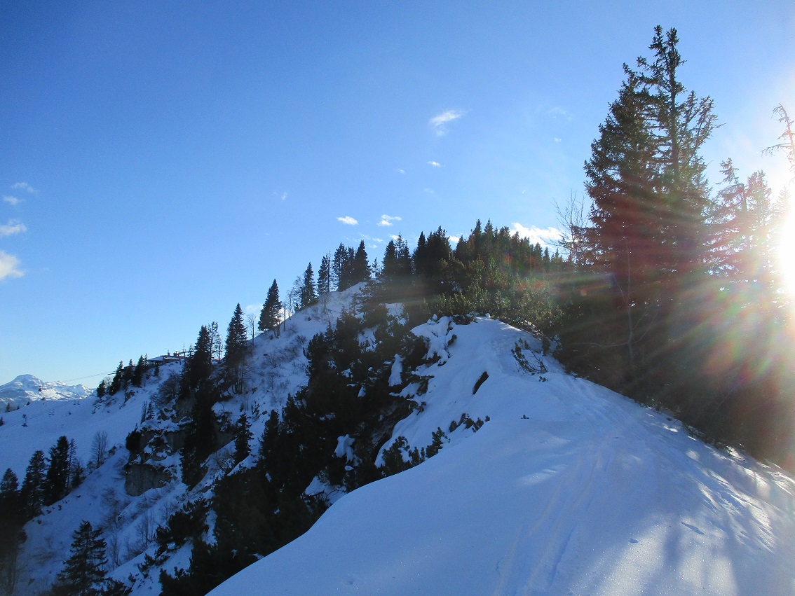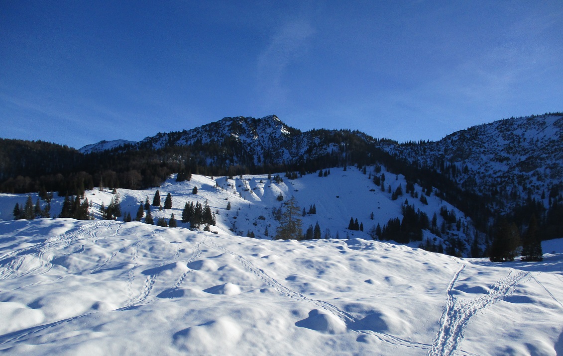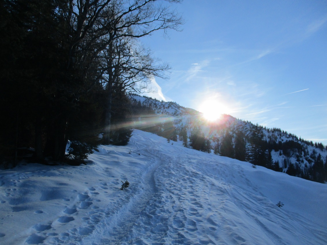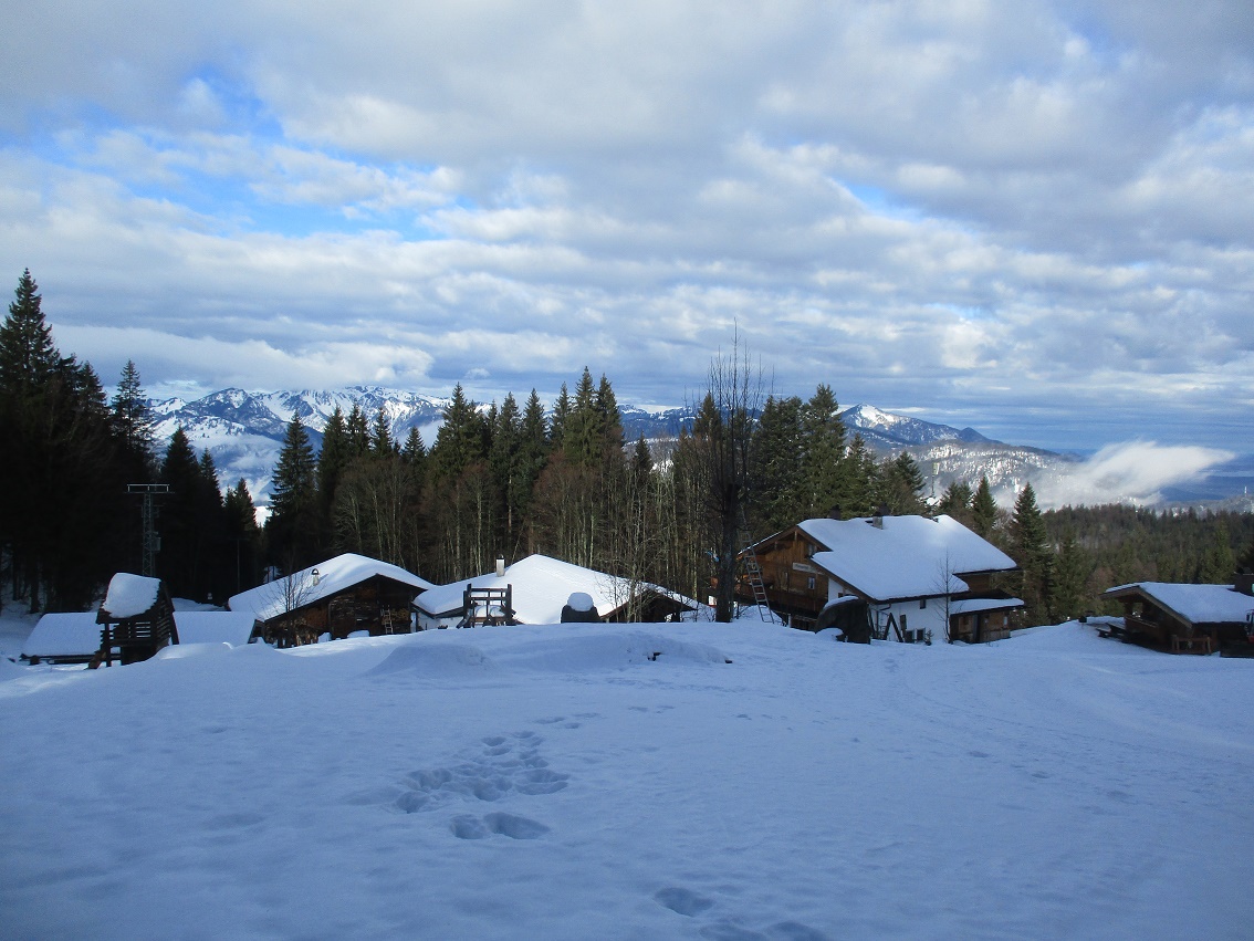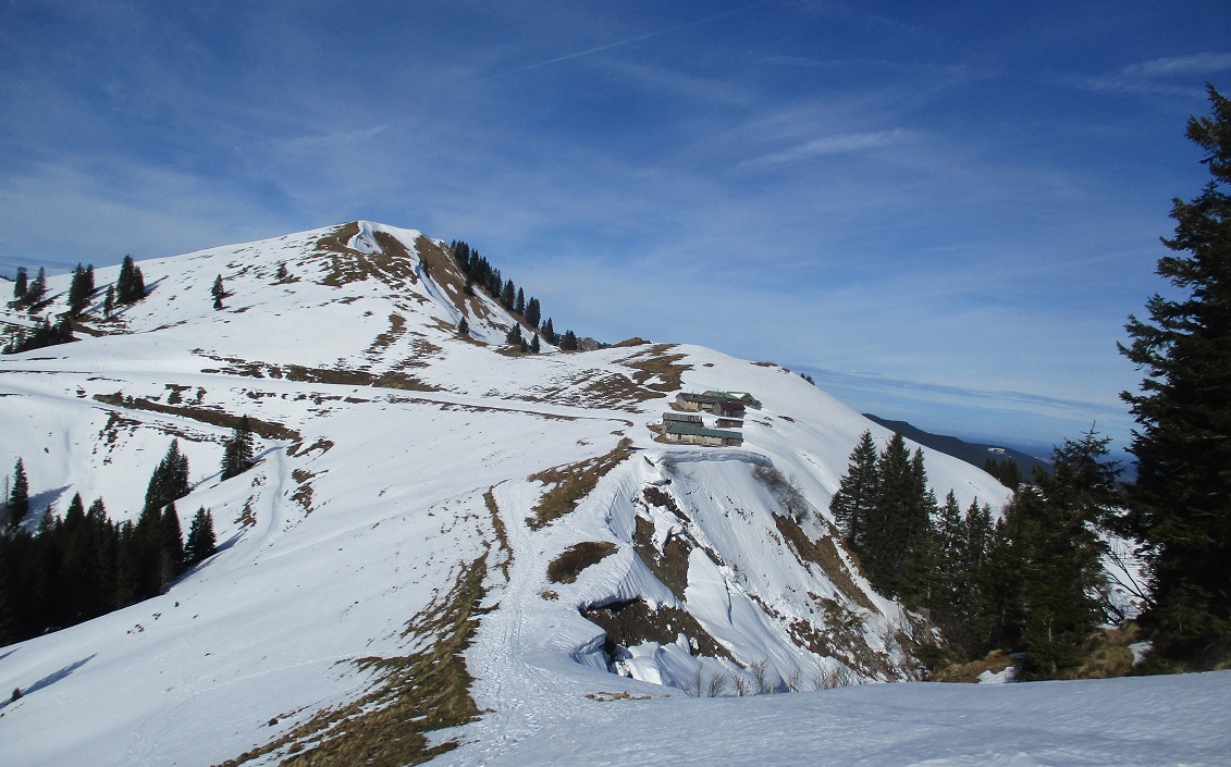 Tourenverhältnisse: Na ja , der Aufstieg war das schönste / Schnee vom P. weg / Rodelbahn hart und eisig aber fahrbar / statt einer Skispur gab es heute eine breite, feste Trittspur / nur oberhalb der Königsalm in den Schattenhängen noch Pulverschnee / sonst harter Altschnee - in der Sonne Sulz - auch teilweise Bruchharsch war geboten