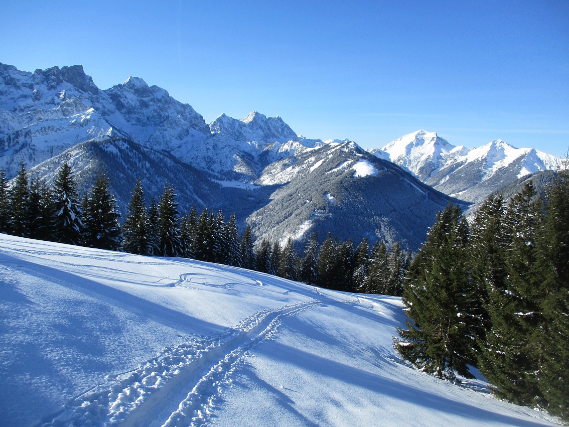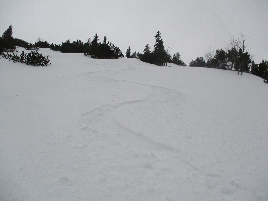 Tourenverhältnisse: Sehr gut / Spur bis kurz vor die Ludernalm / danach Spurarbeit / über die Wildalm zum Kletterberg des Abendstein / über den Ostkamm/grat hinauf zur Rotwand und hinüber zum Schneidjoch : alles Pulverschnee - gut 20 cm + / Abfahrt durch die östliche Nordflanke zur Ludernalm / Runde mit Einsamkeitsgarantie weil : es zieht sich !