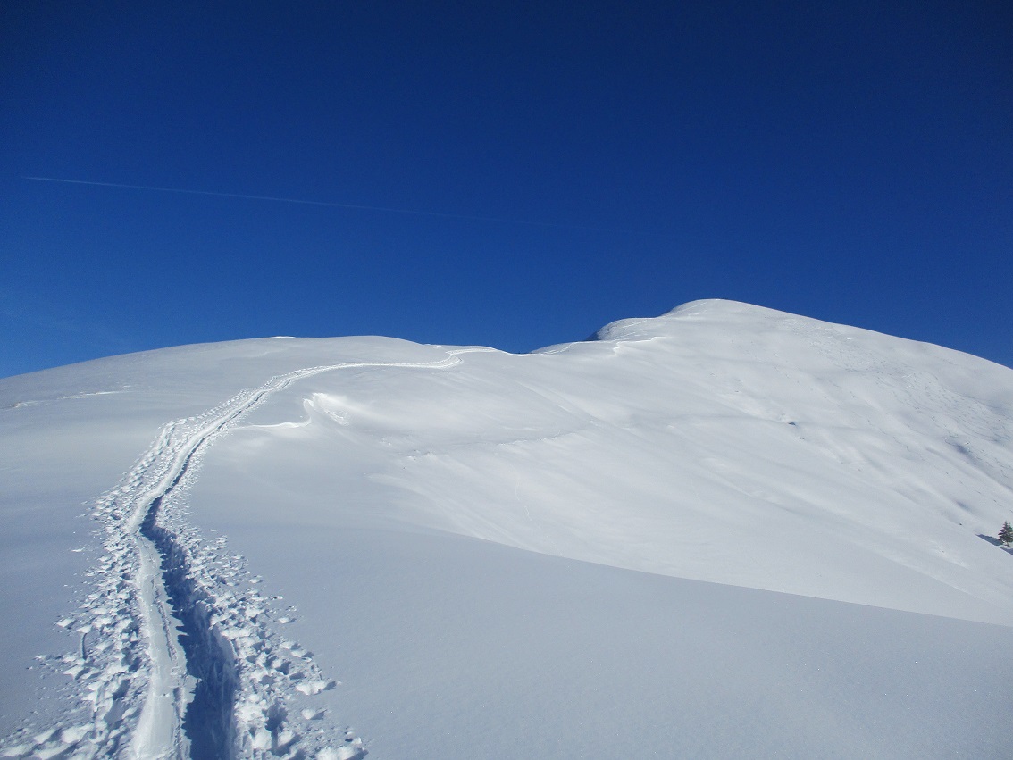 Tourenverhältnisse: Sehr gut / Geht eigentlich nicht besser ! / nur Pulverschnee / 20 bis 40 cm Neuschnee auf tragendem Altschnee / keine Harscheisen nötig / der Gipfelanstieg ist nun frisch angespurt !