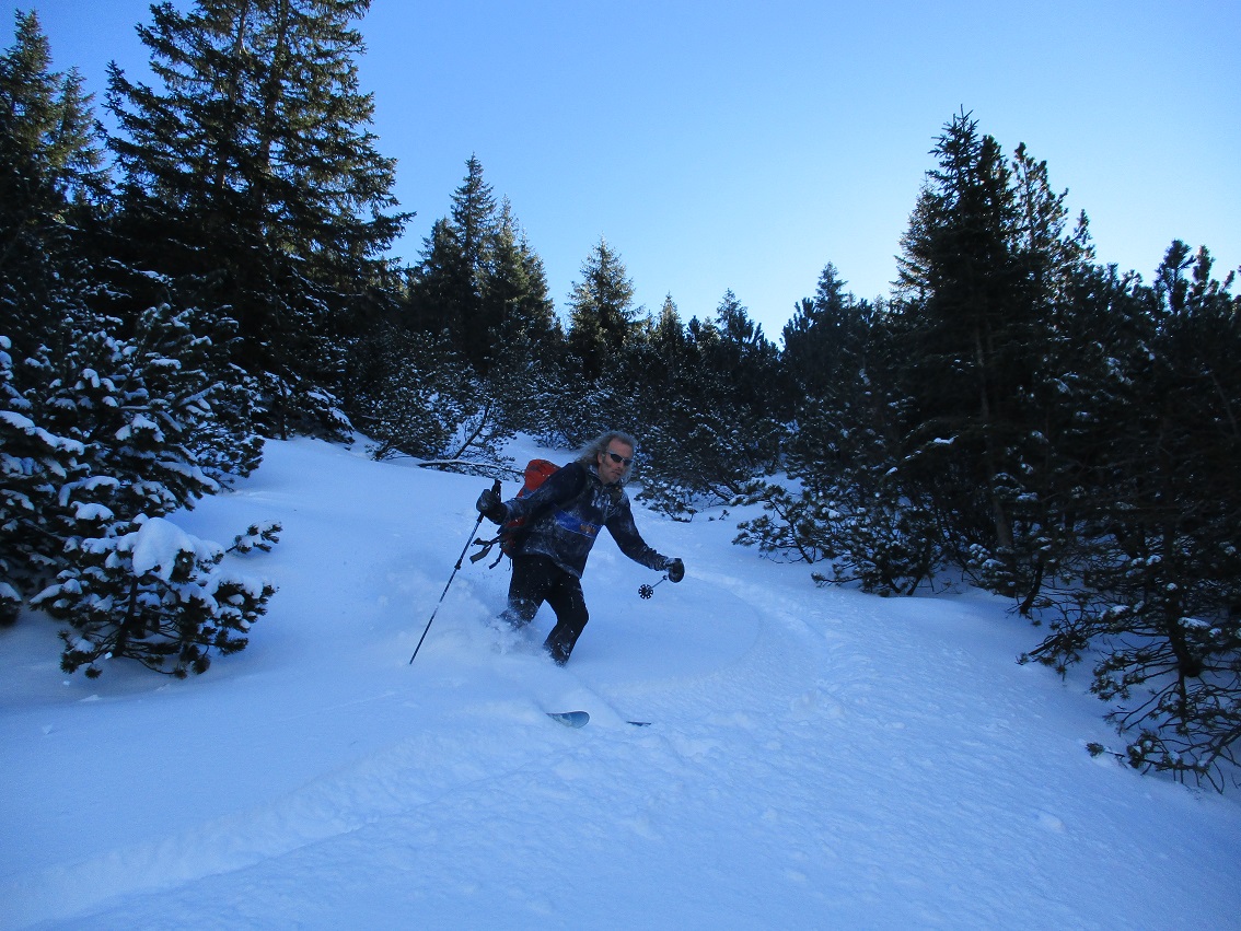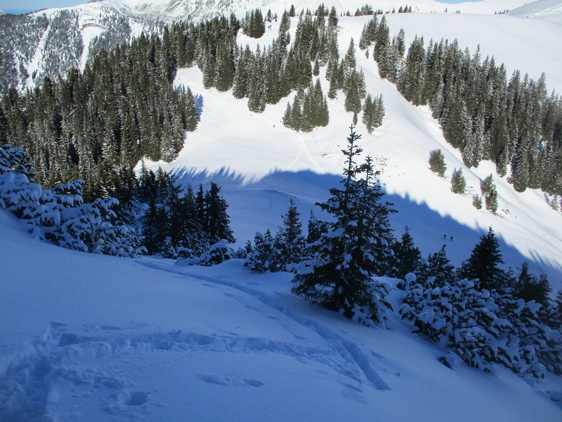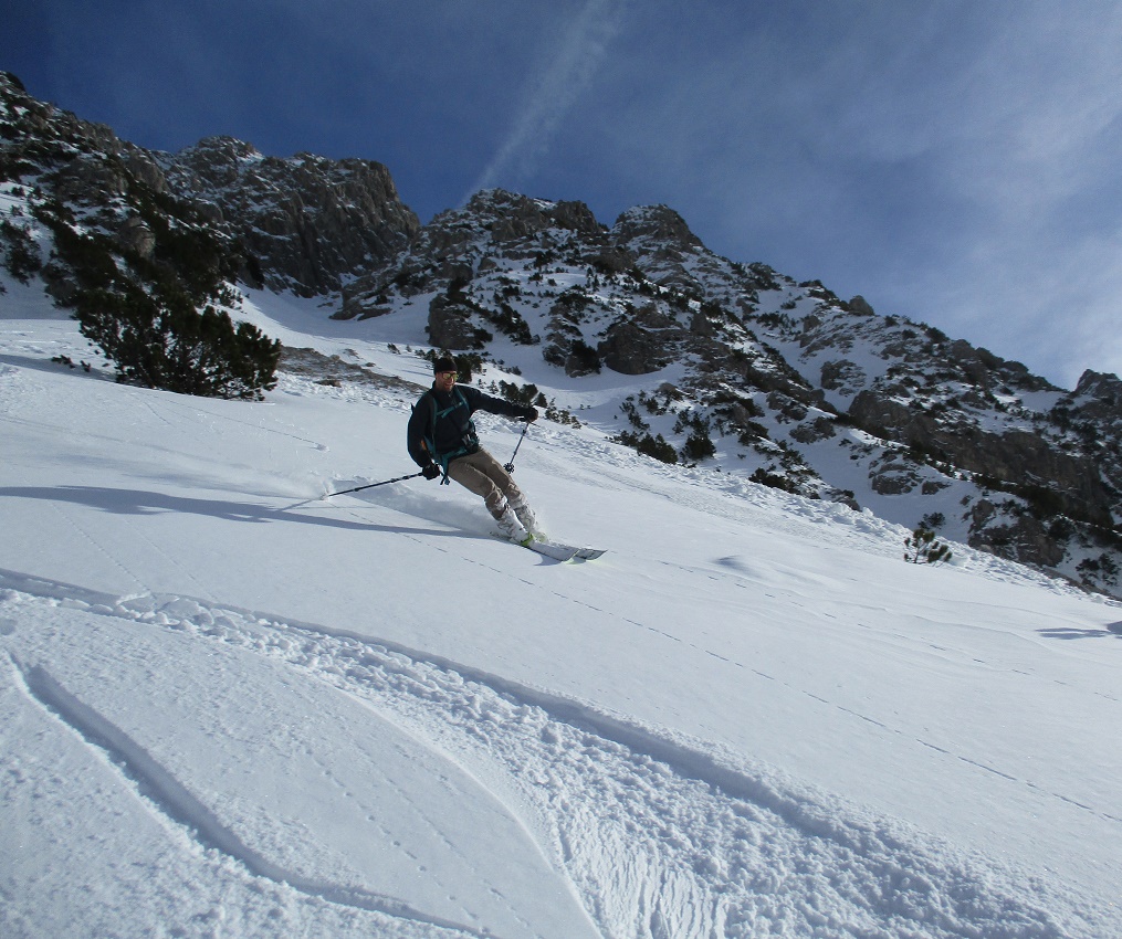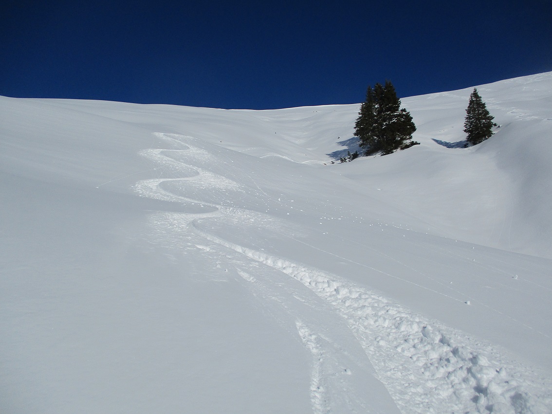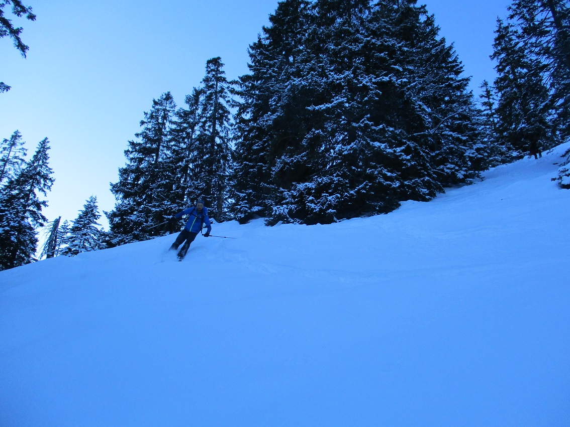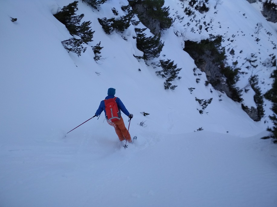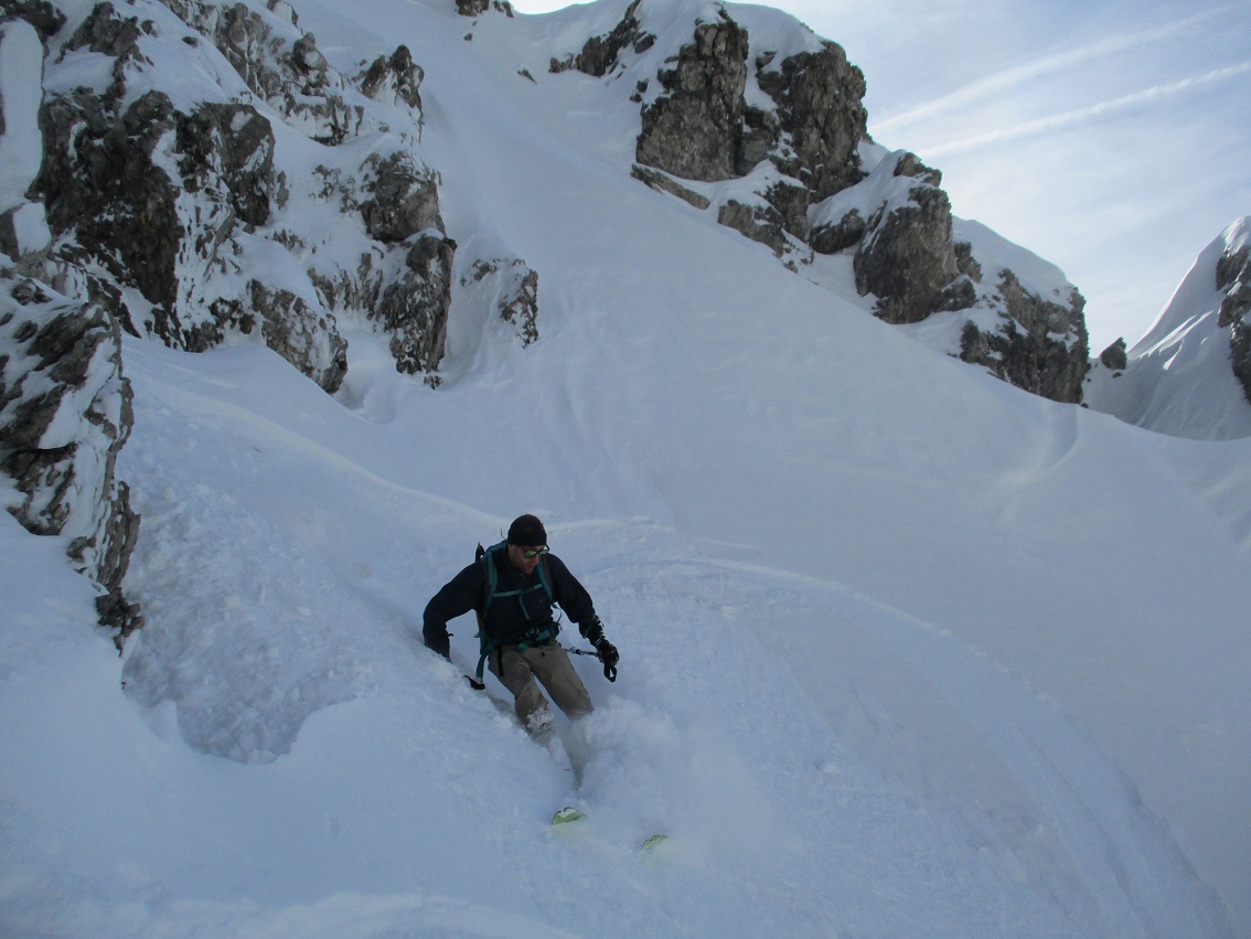 Tourenverhältnisse: Sehr gut / von 10 bis 20 cm schöner Pulverschnee auf tragendem Altschnee / die Sonne zeigte sich sogar kurzzeitig