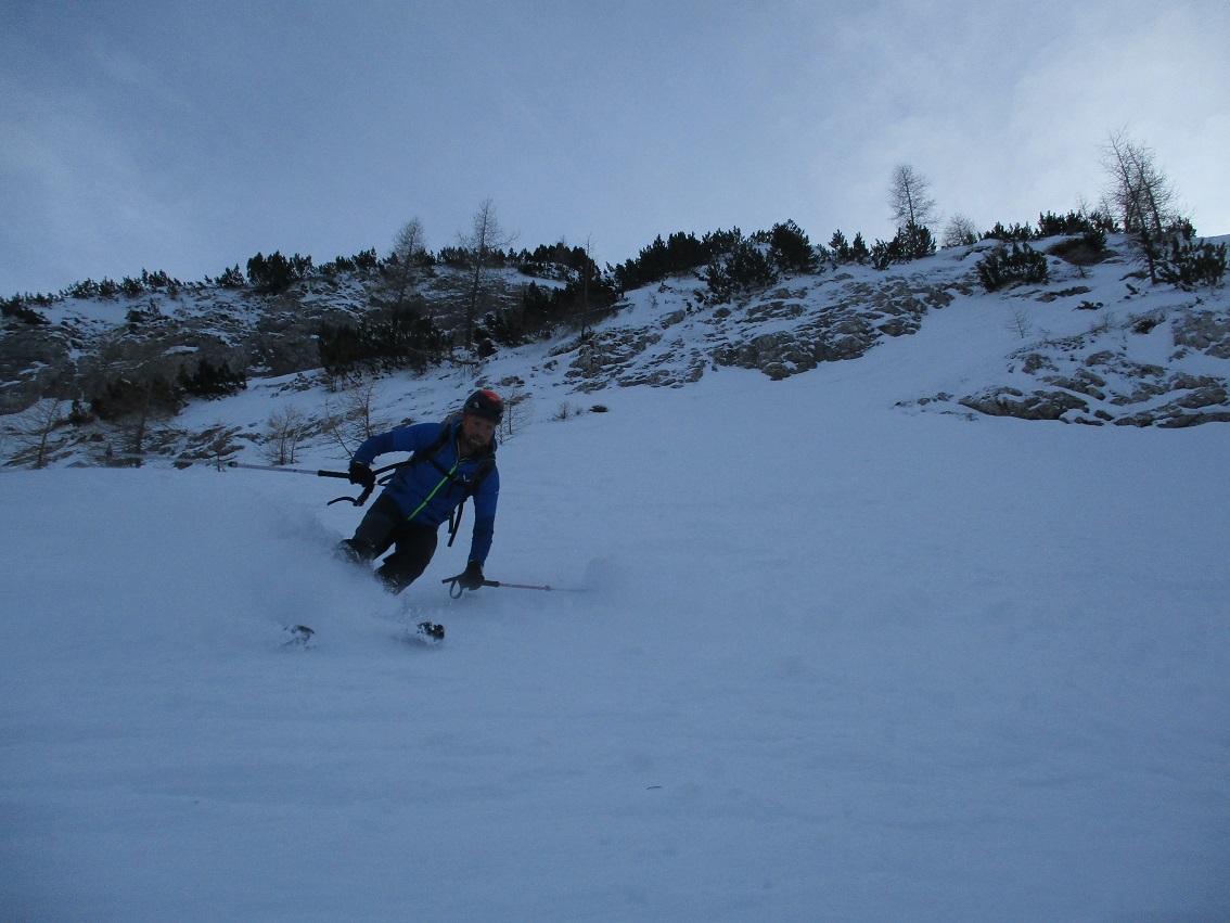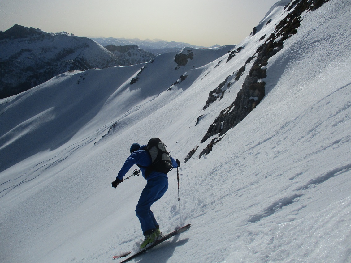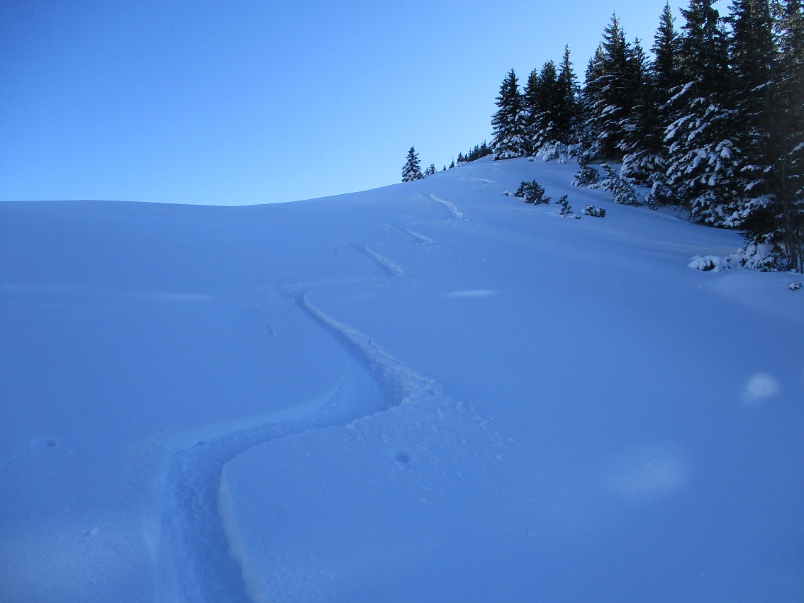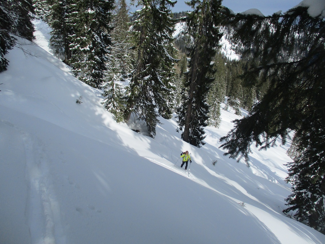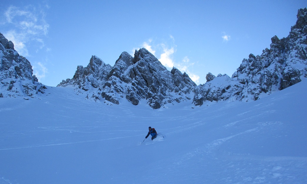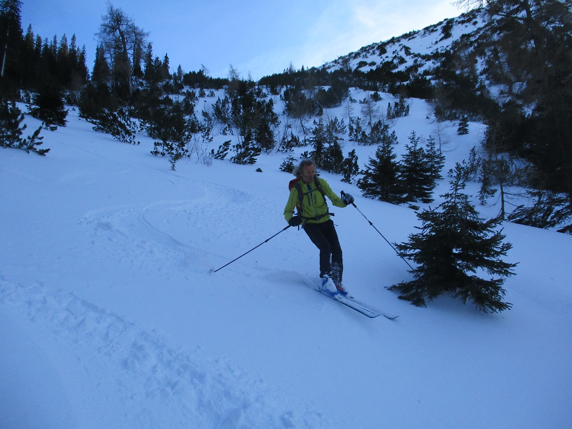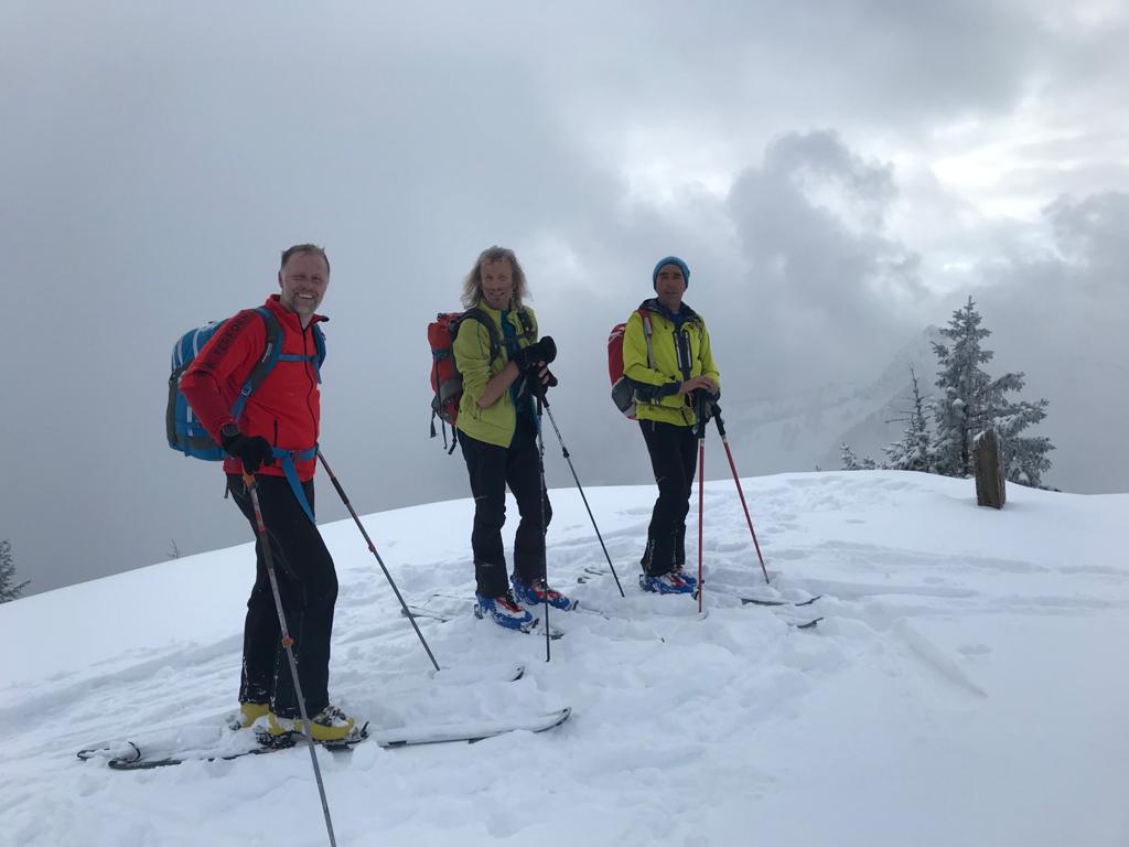 Tourenverhältnisse: Sehr gut / von 10 bis 20 cm schöner Pulverschnee auf tragendem Altschnee / die Sonne zeigte sich sogar kurzzeitig