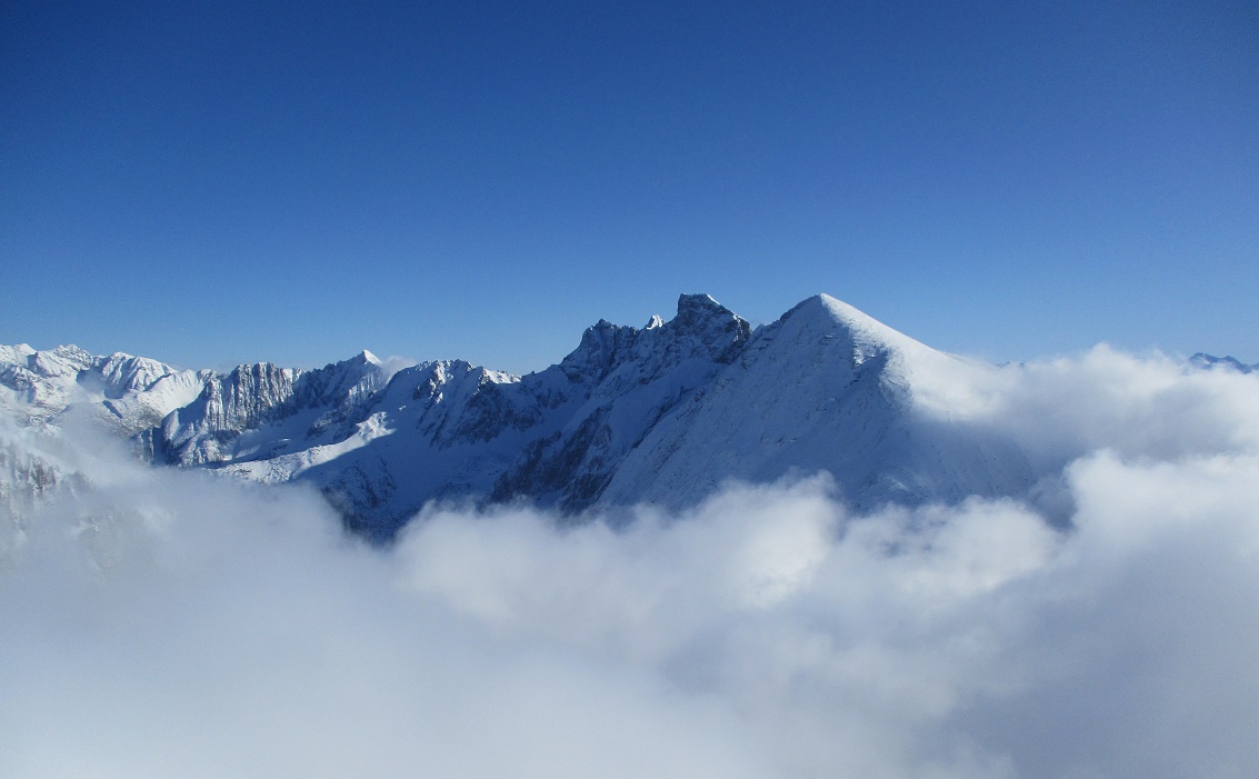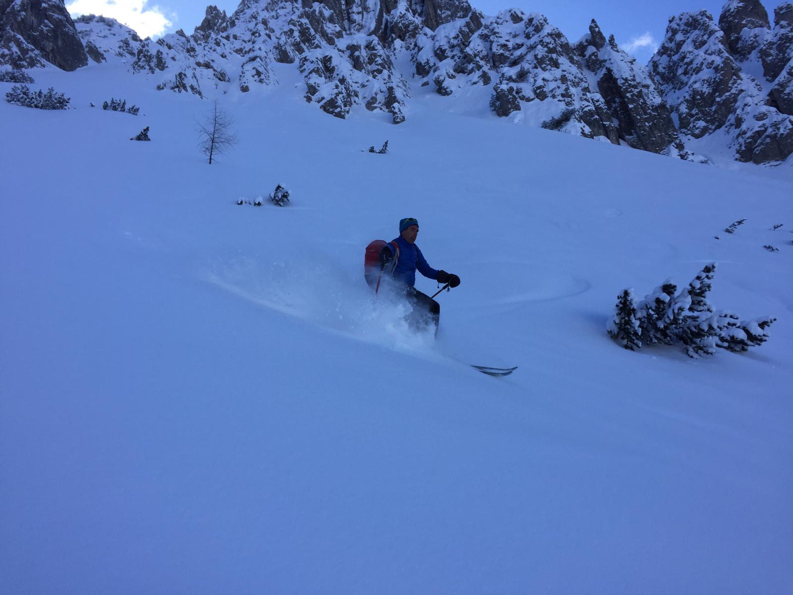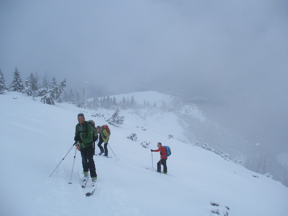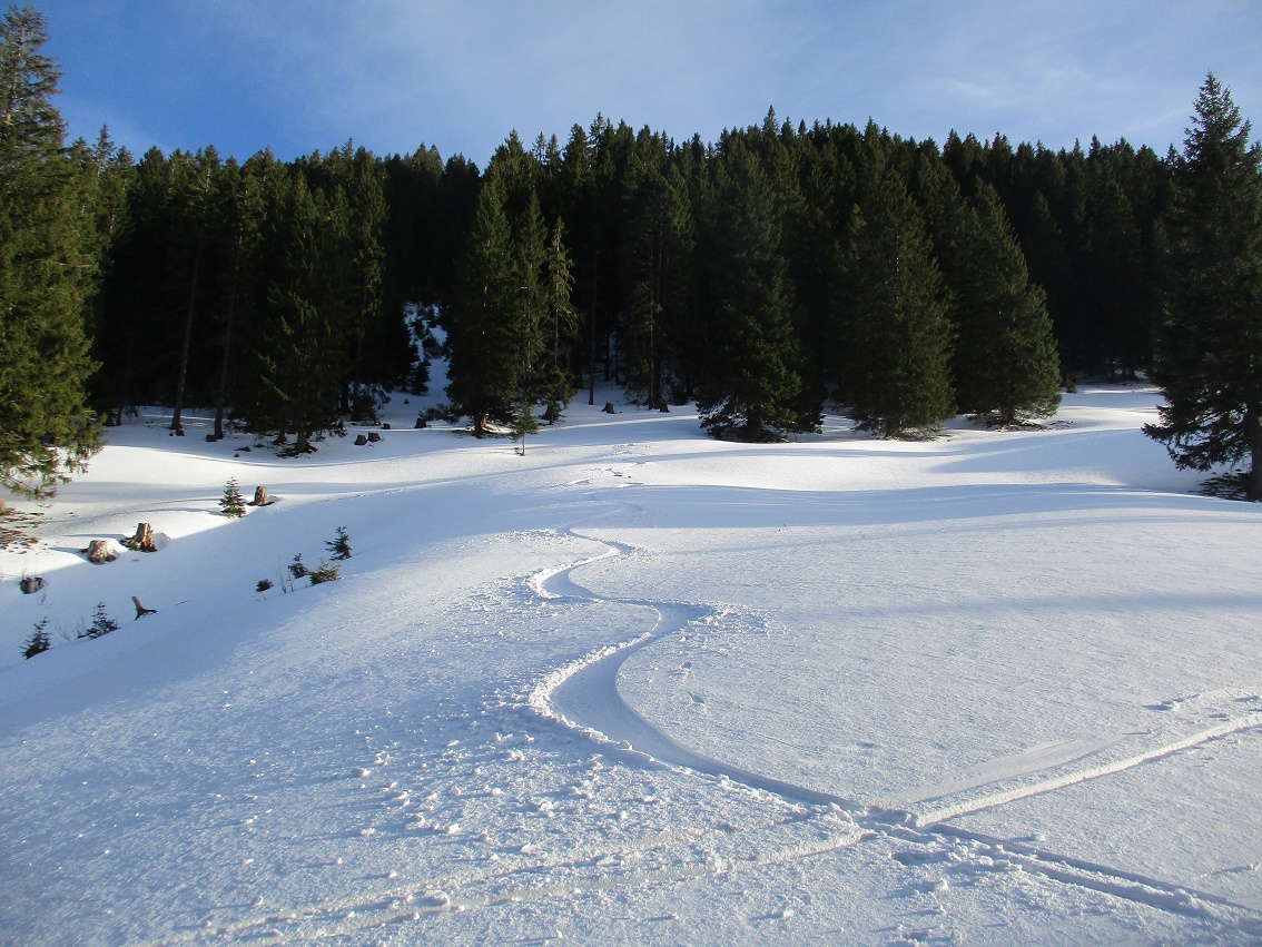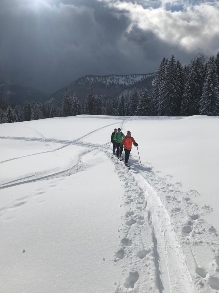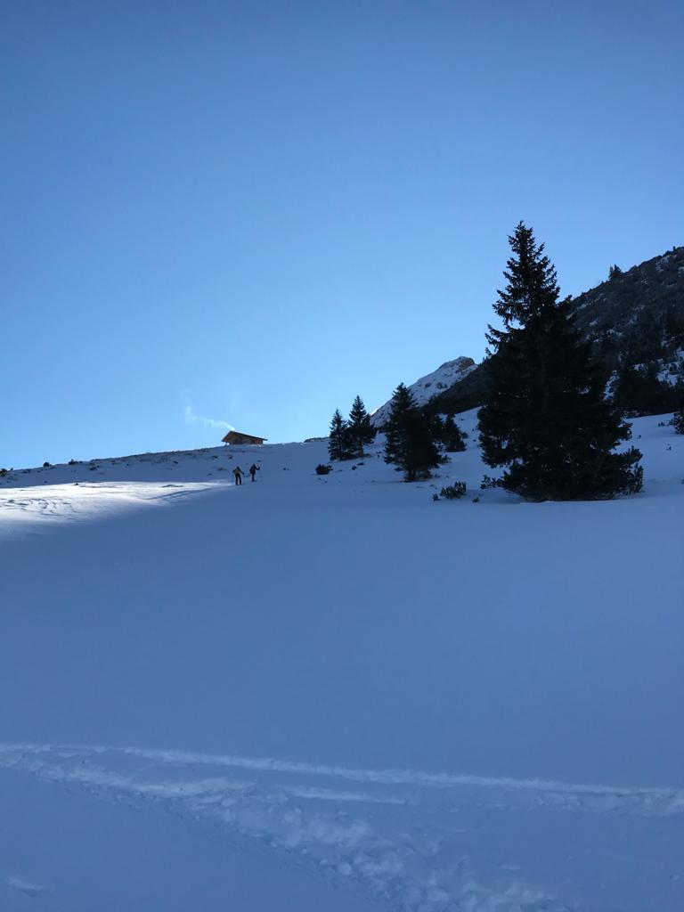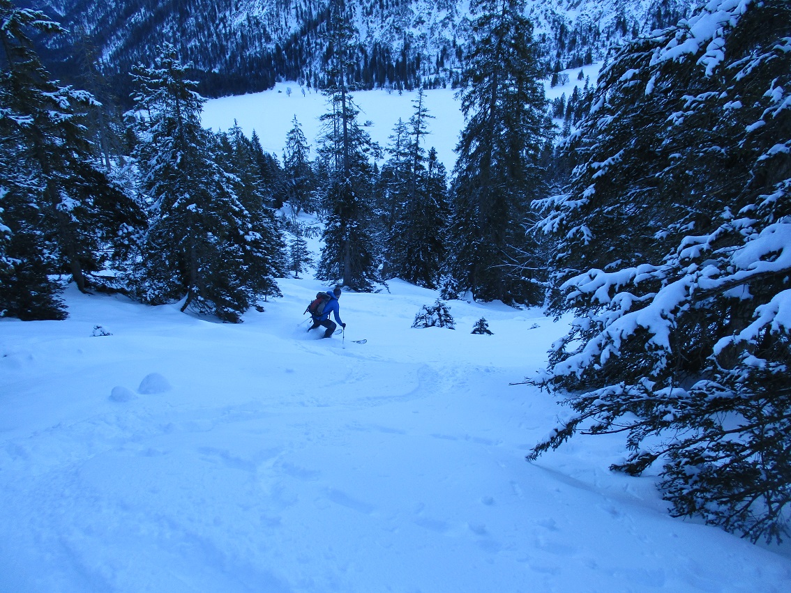 Tourenverhältnisse: Sehr gut / von 10 bis 20 cm schöner Pulverschnee auf tragendem Altschnee / die Sonne zeigte sich sogar kurzzeitig
