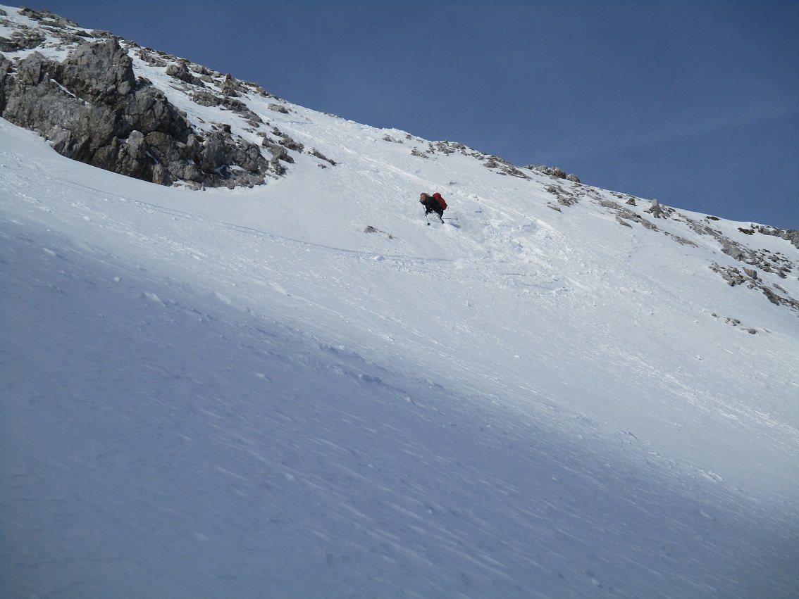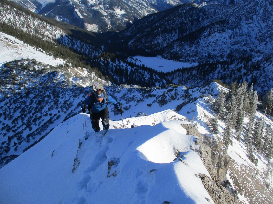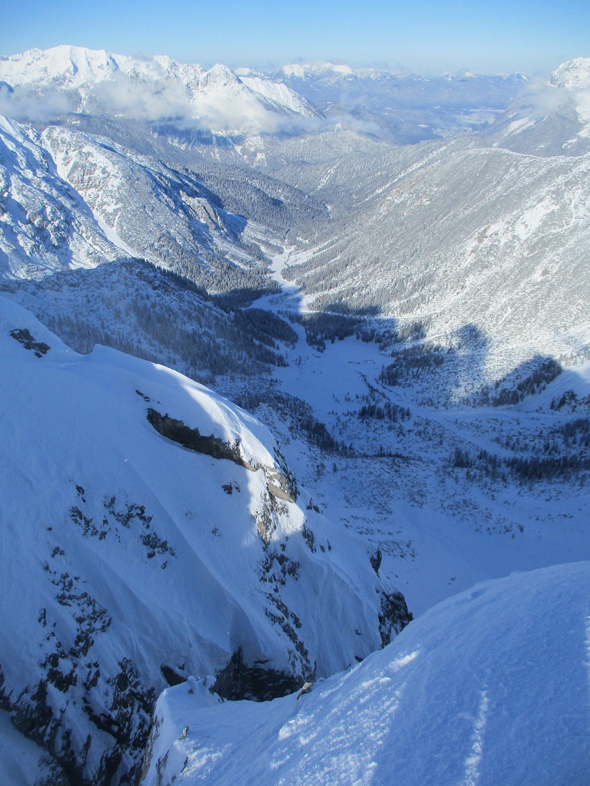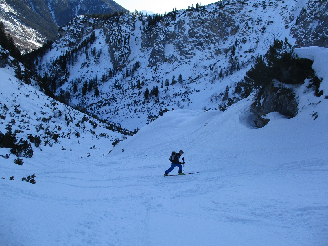 Tourenverhältnisse: Sehr gut / Pulverschnee 90% / Klettersteig nun komplett gespurt / Abfahrt von der ersten ( südlichsten ) Scharte durch die Wankreise zur Zeit sehr lohnend
