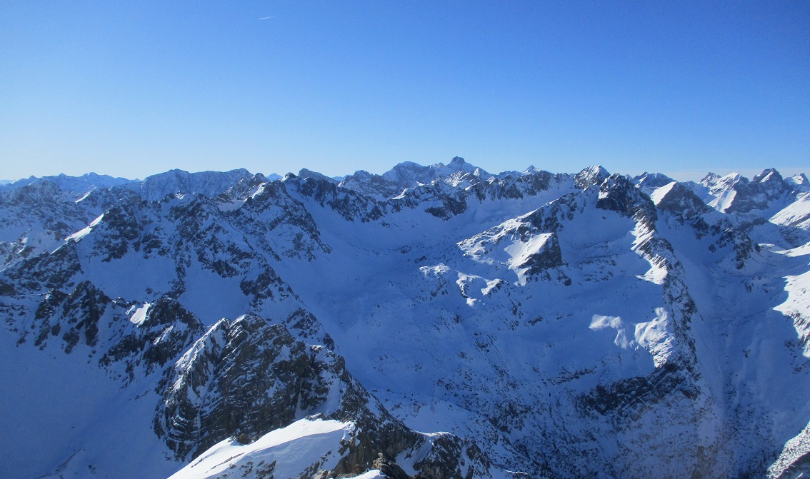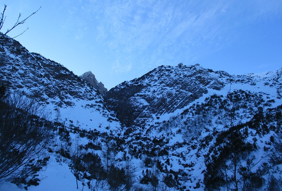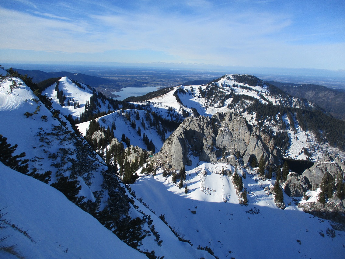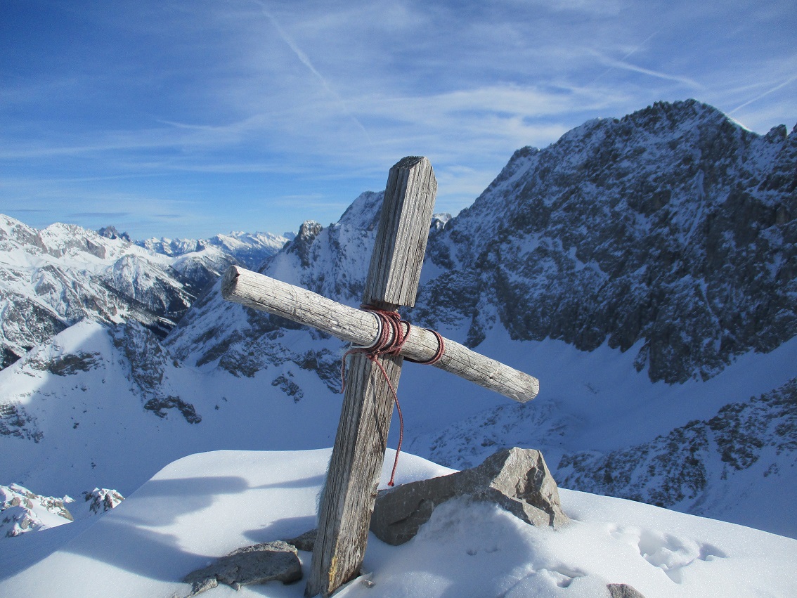 Tourenverhältnisse: Sehr gut / Pulverschnee 90% / Klettersteig nun komplett gespurt / Abfahrt von der ersten ( südlichsten ) Scharte durch die Wankreise zur Zeit sehr lohnend