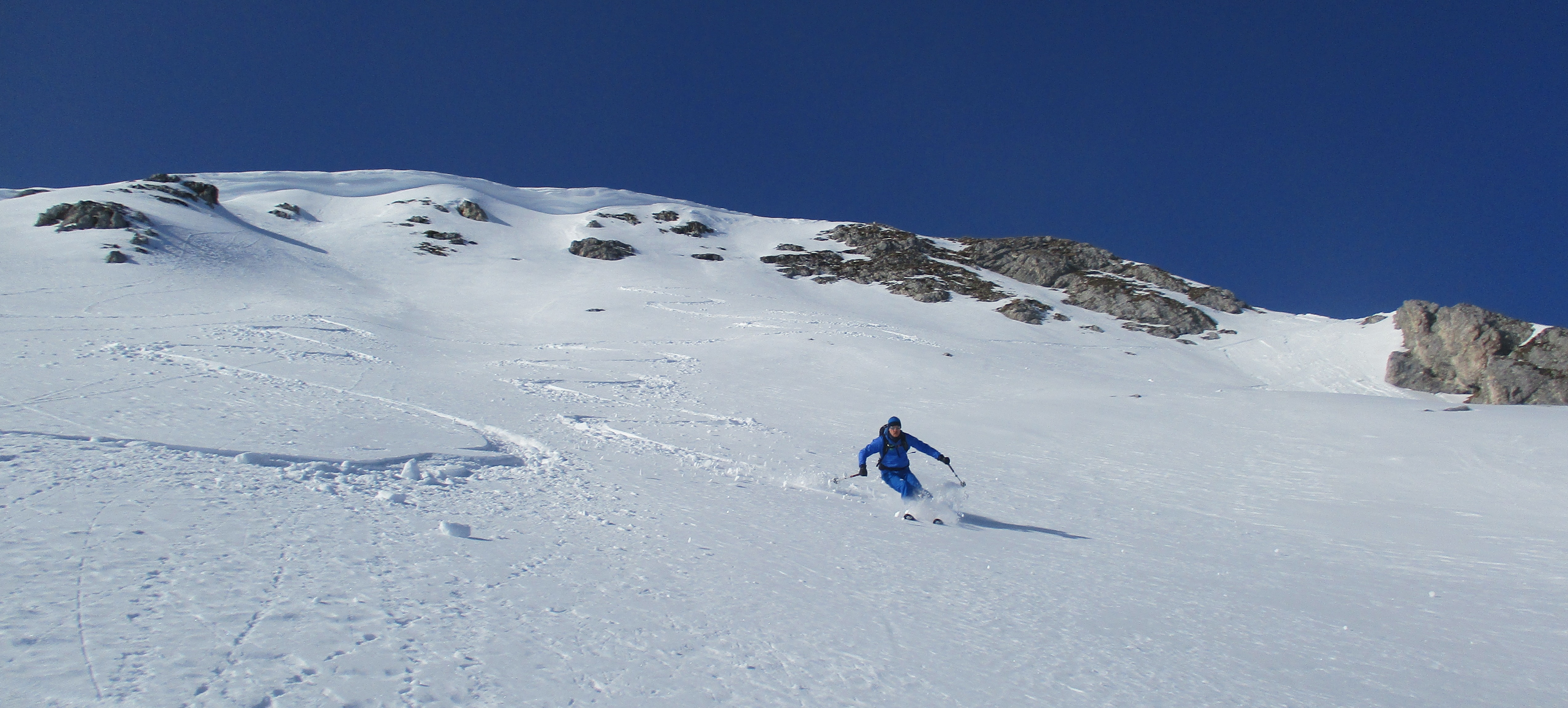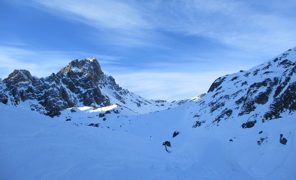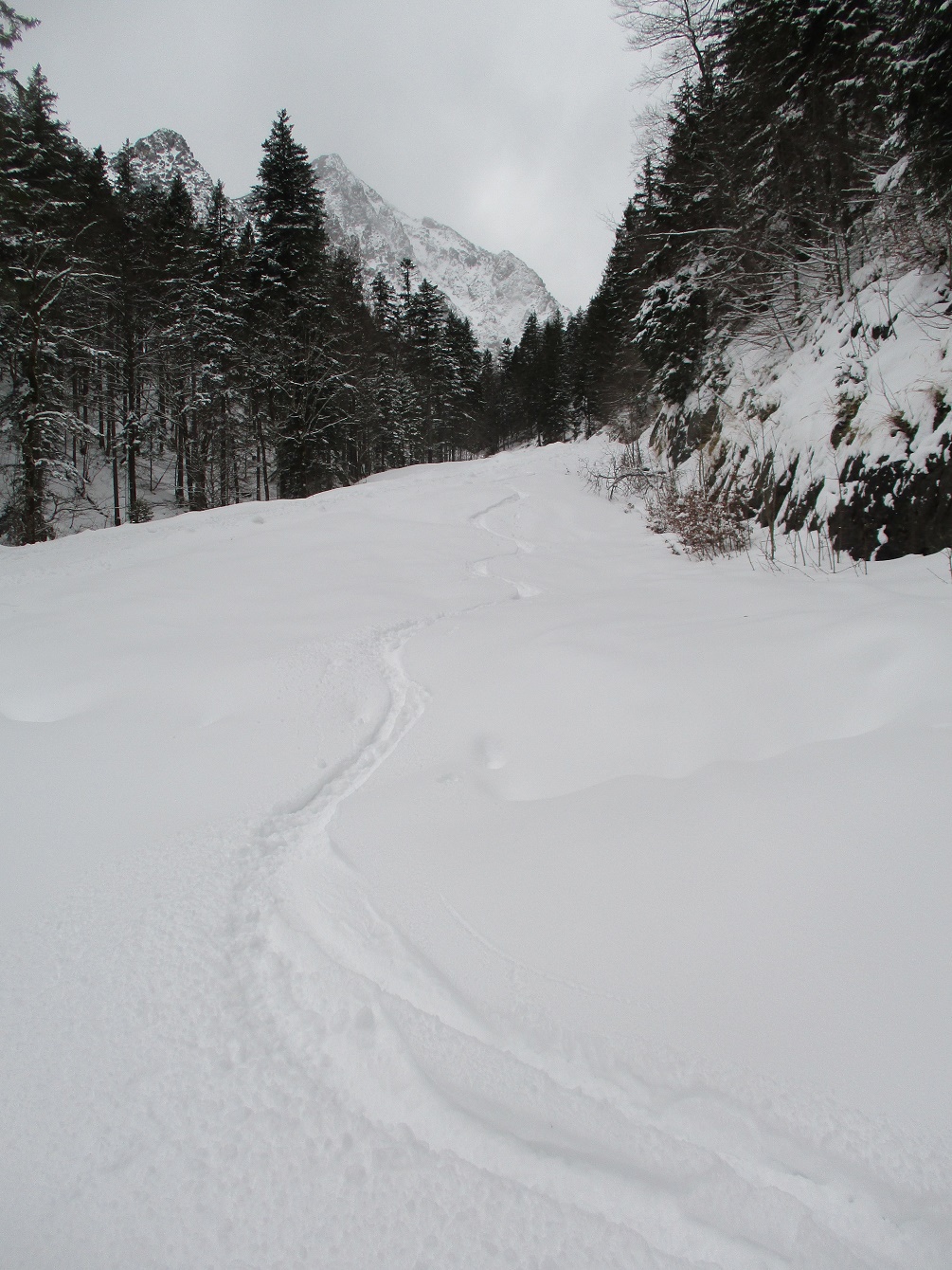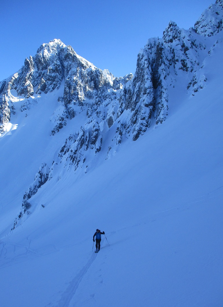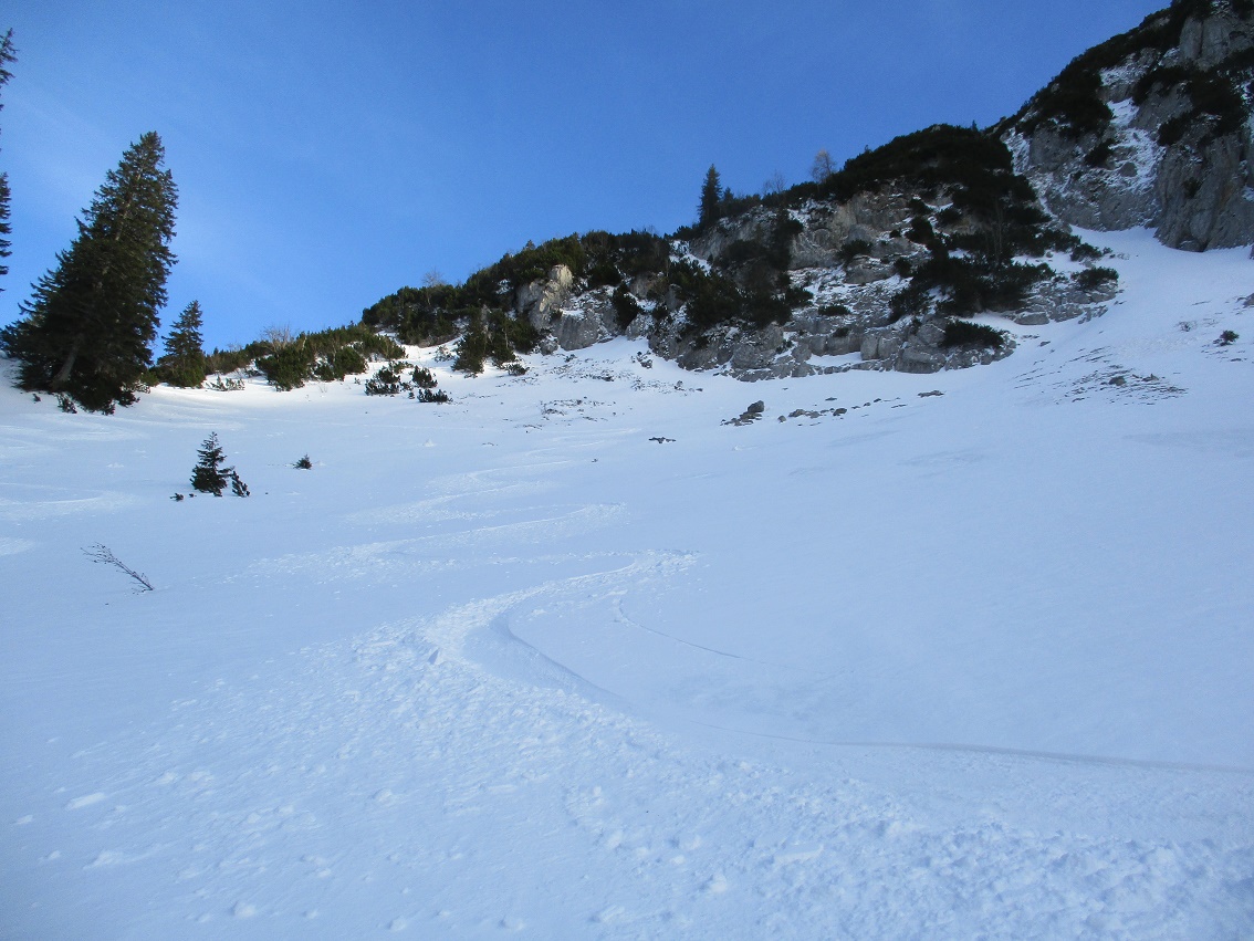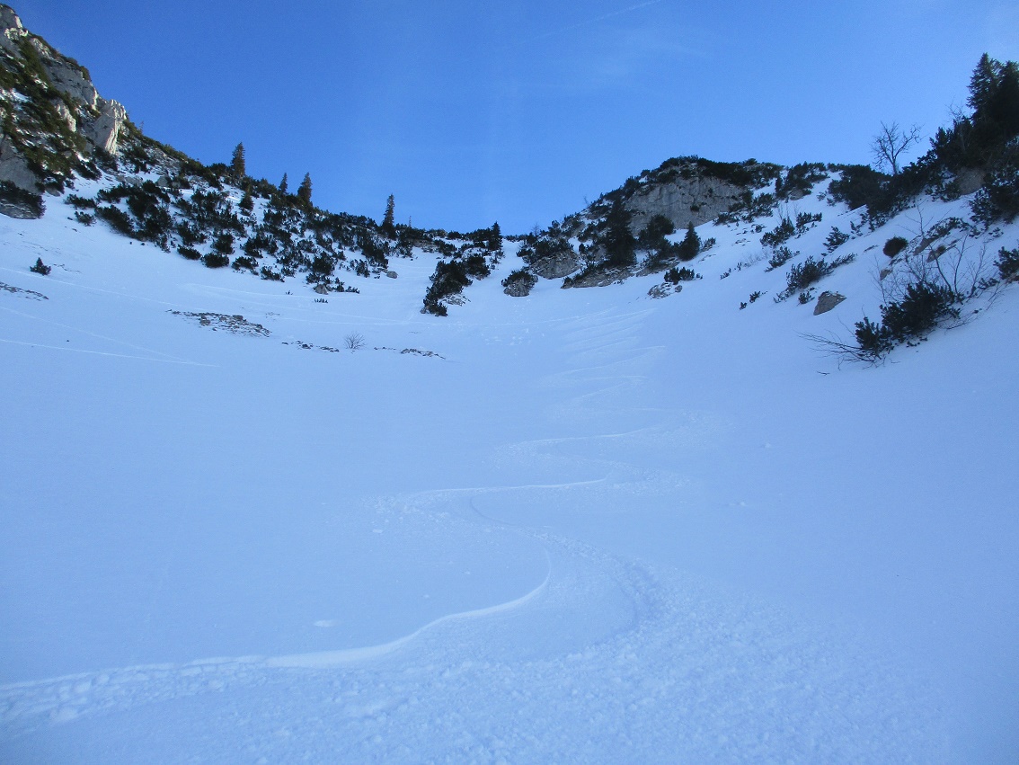 Tourenverhältnisse: Bis zur Wasserfallstufe etwas haklig danach sehr gut / meist Pulverschnee / Aufstiegsvariante über den linken Osthang / Abfahrtsvariante direkt vom Gipfel / angenehme Temperaturen - kaum Wind