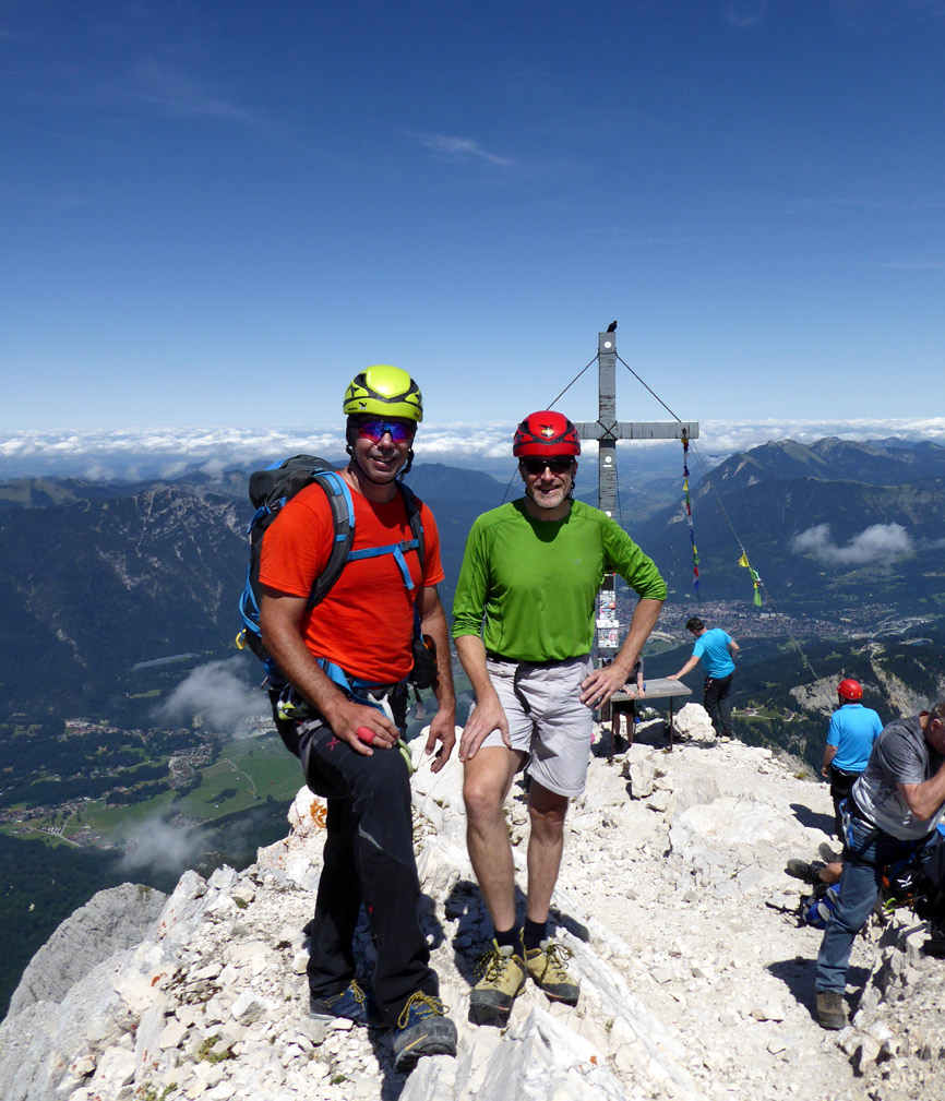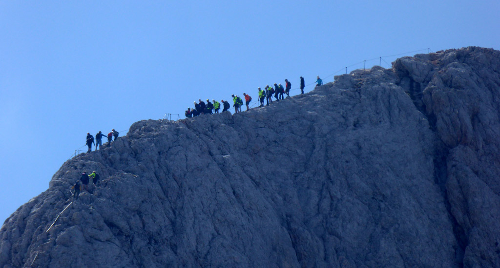 Tourenverhältnisse: Der höchste Berg Sloweniens stand schon lange auf der Tourenliste, jetzt hat es endlich geklappt. Anfahrt am Vorabend, Übernachtung im Aljažev Dom (Halbpension 28,50 Euro, super Zimmer, sehr nettes Wirtinnen-Team), morgens um 6.20 Uhr Start mit Wanderung zum Luknja-Pass. Dort Einstieg in den Bamberg-Weg (den schwierigsten der Triglav-Normalwege, Klettersteig C/D, ausgesetzte Kletterei immer wieder bis II), Schlüsselstelle mit einer fast senkrechten 40-Meter-Wand gleich zu Beginn. Gipfel nach 6 Stunden erreicht, Abstieg zum Triglavski-Dom und weiter über den Tominsek-Steig (I bis II, Klettersteig bis C) zurück Ausgangspunkt (den wir genau 12 Stunden nach dem Aufbruch wieder erreichten). Mit den Gegenanstiegen summieren sich laut GPS auf dieser eindrucksvollen Rundtour 2065 Höhenmeter. In den schwierigen Stellen sind Drahtseile, ansonsten sind die Routen teils mit Metallstiften ergänzt, es muss aber auch viel frei und ausgesetzt geklettert werden. Die Routen sind bestens markiert, Verhauer ausgeschlossen. Bei Nebel oder Nässe wird`s allerdings gefährlich (wir hatten schönes Wetter). Hält man sich metergenau an die Route, ist das Gestein in der Regel auch fest.