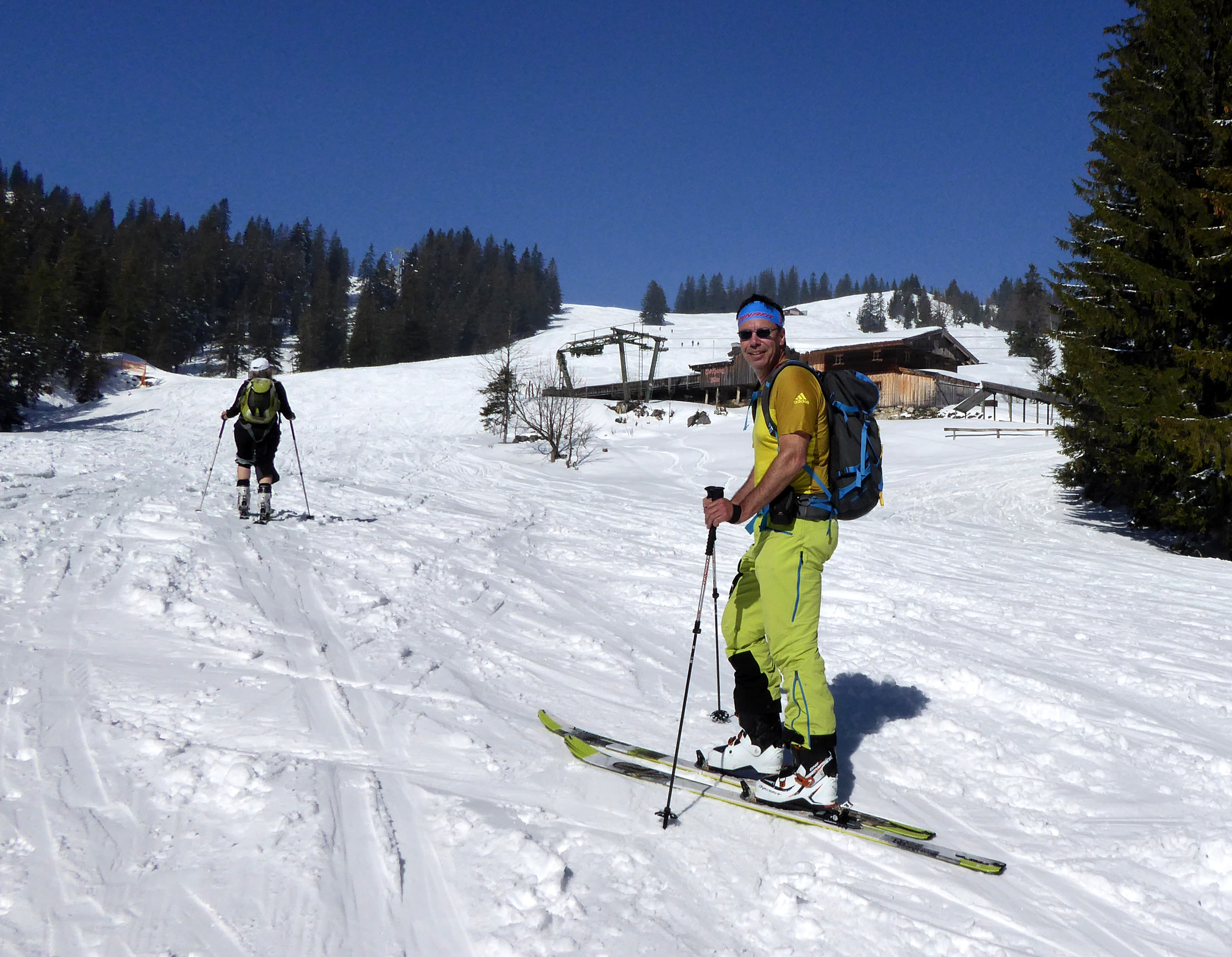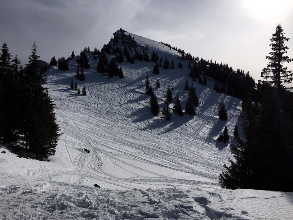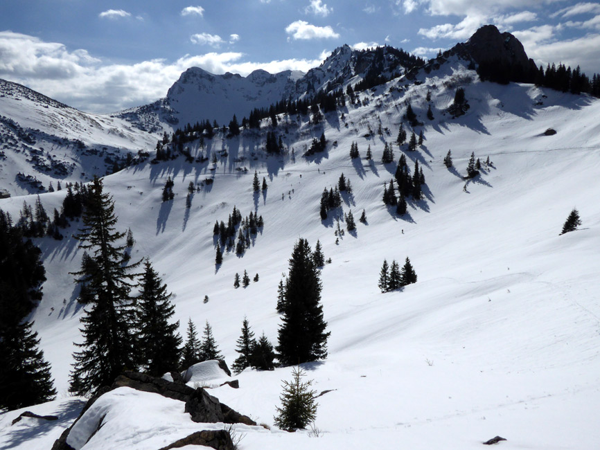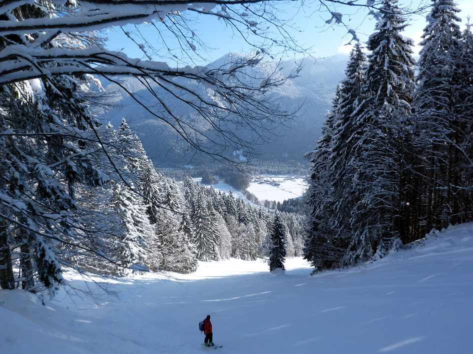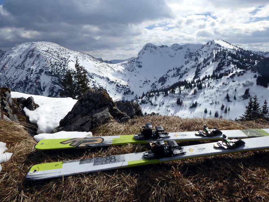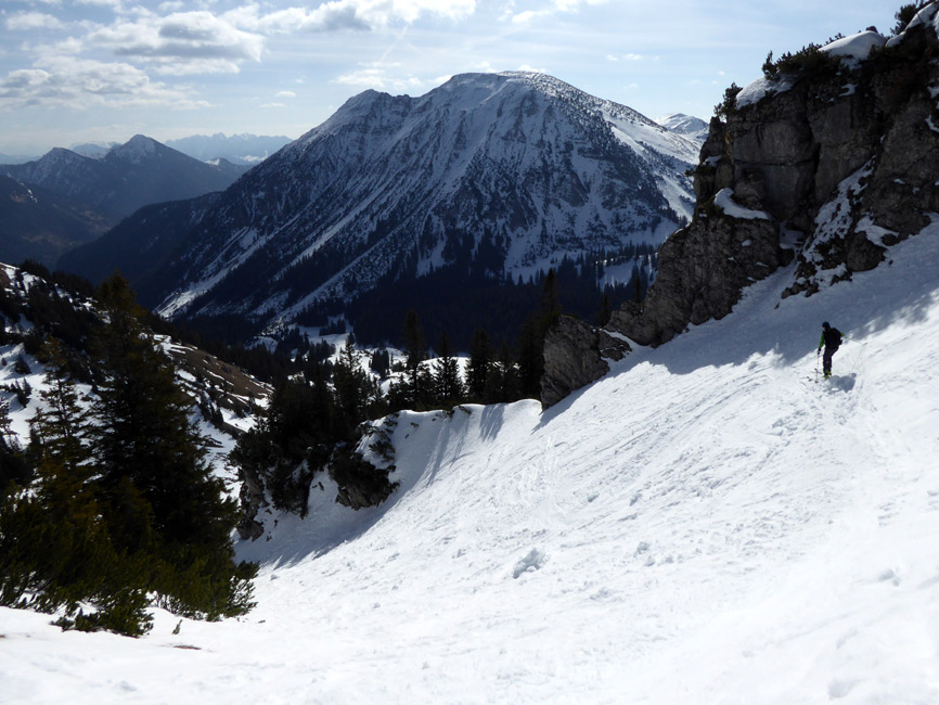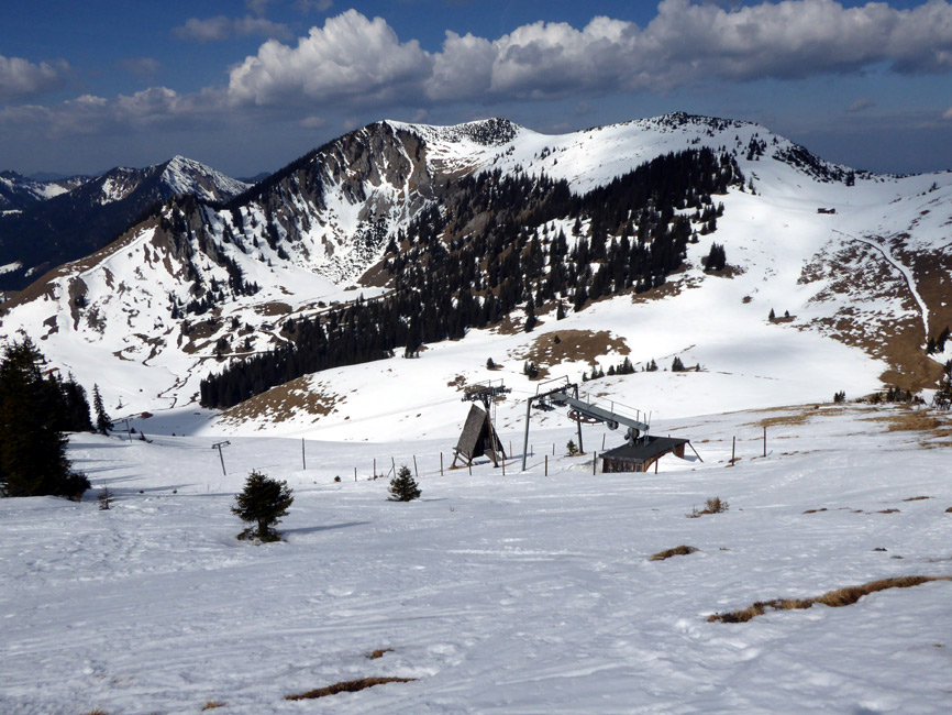 Tourenverhältnisse: Von der Brauneck-Bergstation Querfahrt zur Strasser-Alm, dort angefellt, via Idealhang zum Sattel zwischen Latschenkopf und Achselköpfen. Abfahrt in den Probstenkessel, Aufstieg zum Rothörlsattel und weiter zum Skigipfel.Abfahrt wieder in Probstenkessel, Aufstieg zum Sattel, Abfahrt bis zum Florilift, Aufstieg zum Brauneck, Abfahrt via Garland. Gut 1200 Hm im Aufstiegm 1900 in der Abfahrt. In schattseitigen Lagen noch Pulverschnee (Probstenkessel), sonnseitig schon gut gesetzter und sehr kompakter (fast firniger) Schnee. Auf den Brauneck-Pisten gute Bedingungen am Idealhang und auf der Garlandabfahrt, die Passage zwischen Strasser-Alm und Finstermünzkessel braucht drigend Neuschnee.