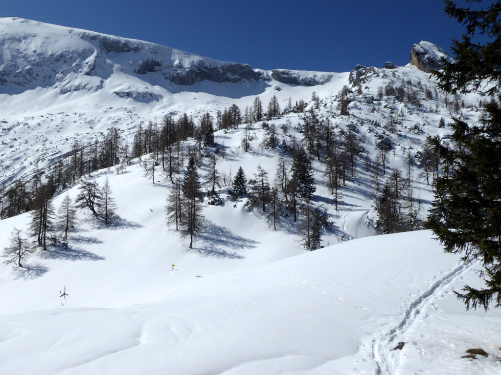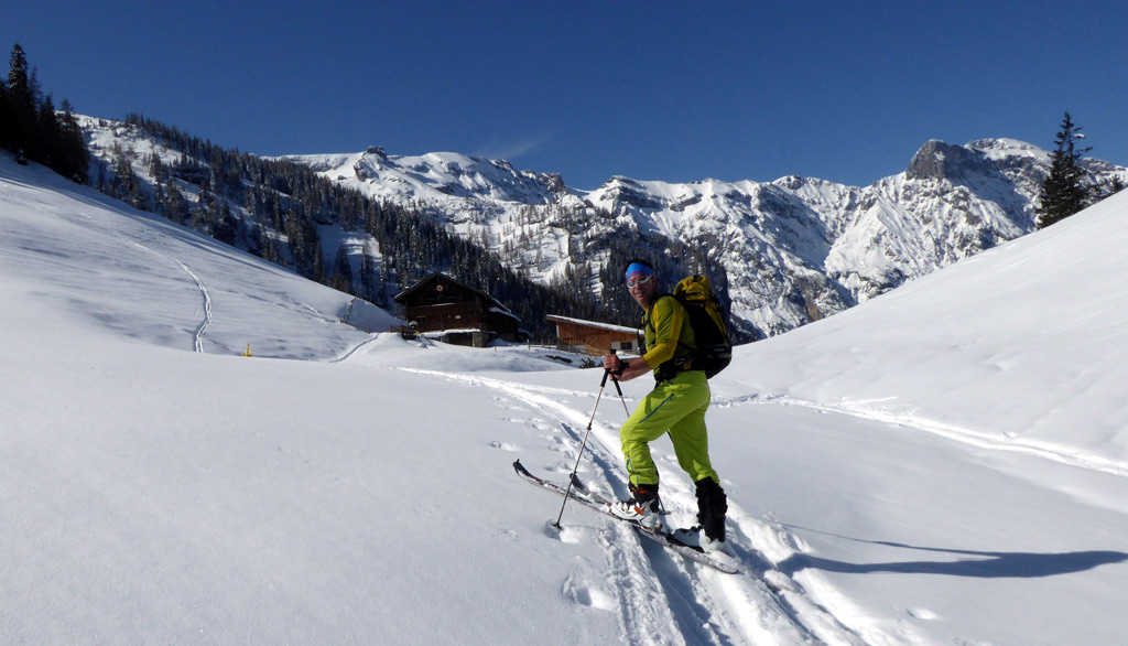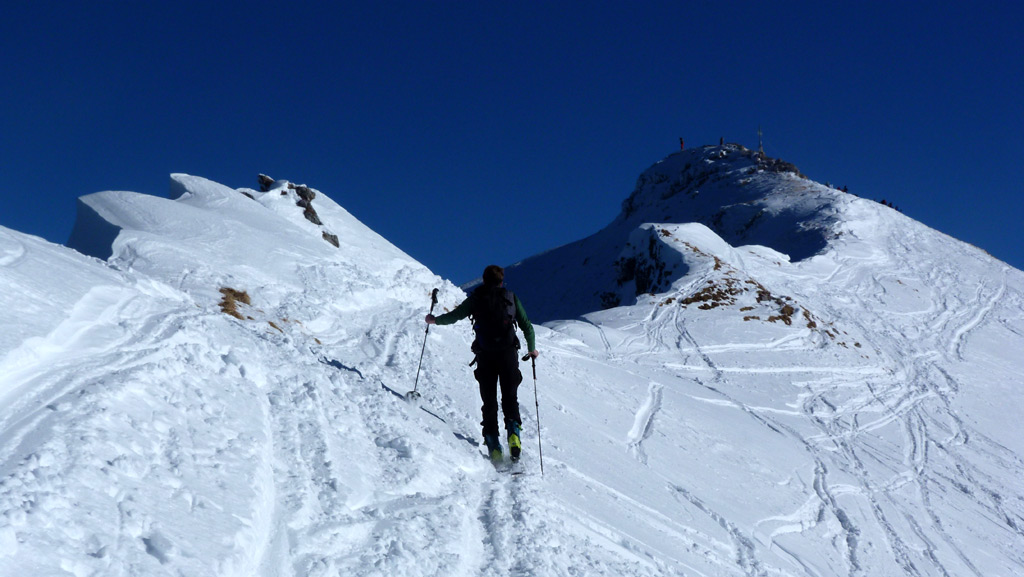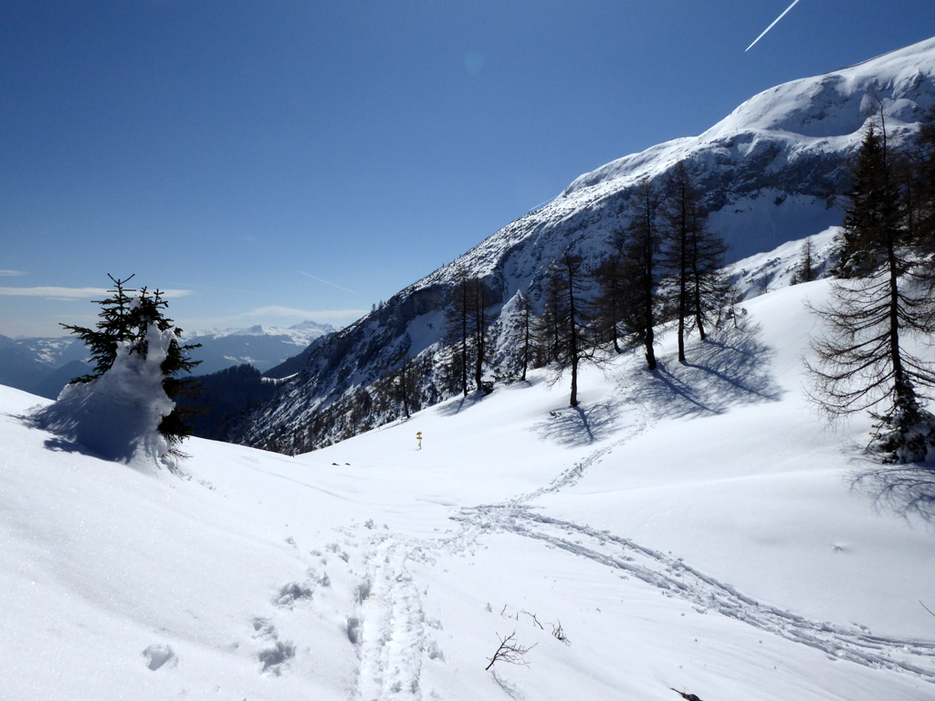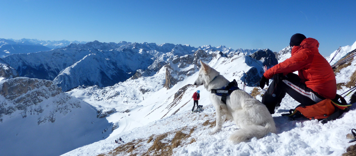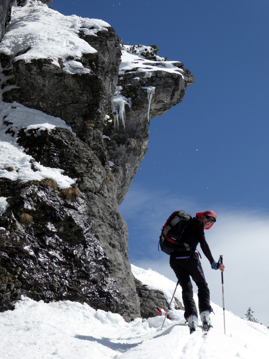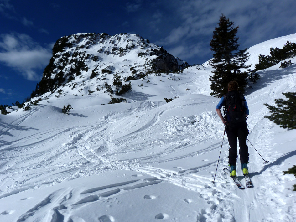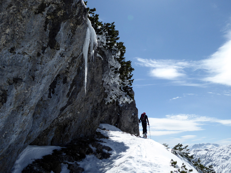 Gefahreneinschätzung: LWS 1, Lawinengefahr weitgehend gering. In den Steilpassagen oberhalb vom Rothörlsattel (wir haben den Klettersteig links umgangen) ist der Neuschnee nur mäßig mit der festen Altschneeunterlage verbunden - dadurch vor allem im Aufstieg Abrutschgefahr in der Nähe von Felsabbrüchen, mehrmals haben wir sicherheitshalber die Skier auf die Rucksäcke geschnallt.