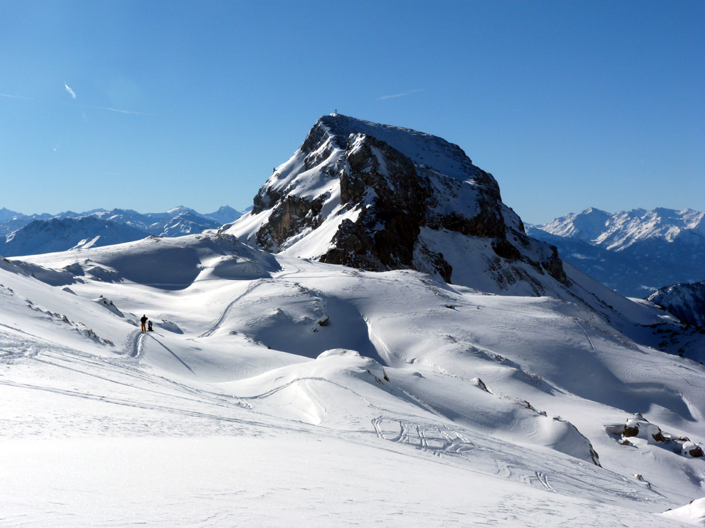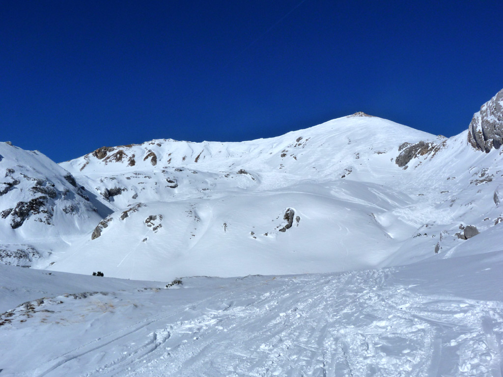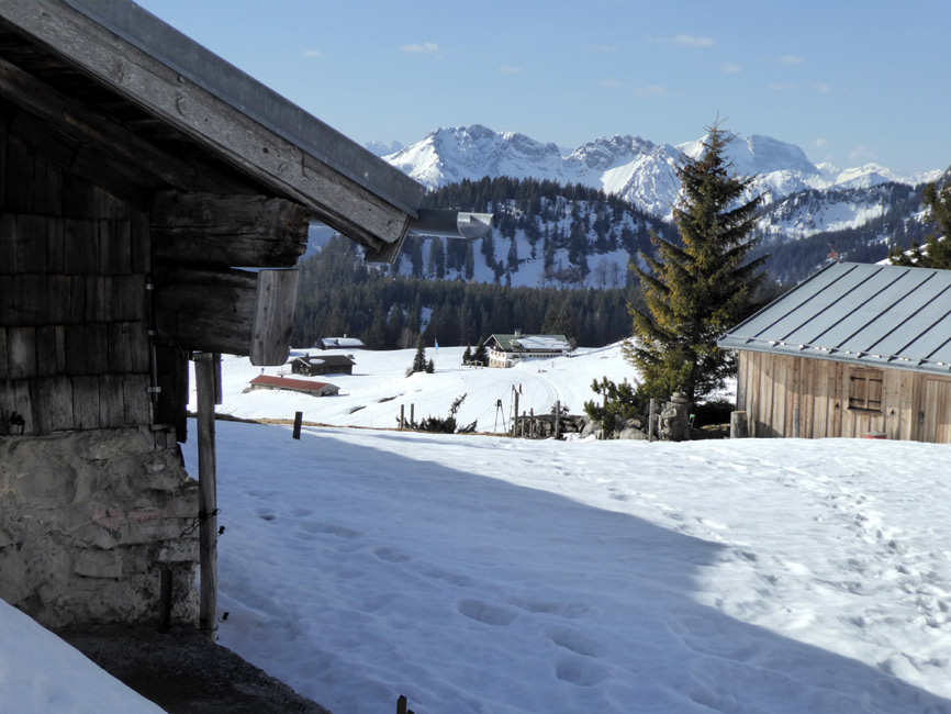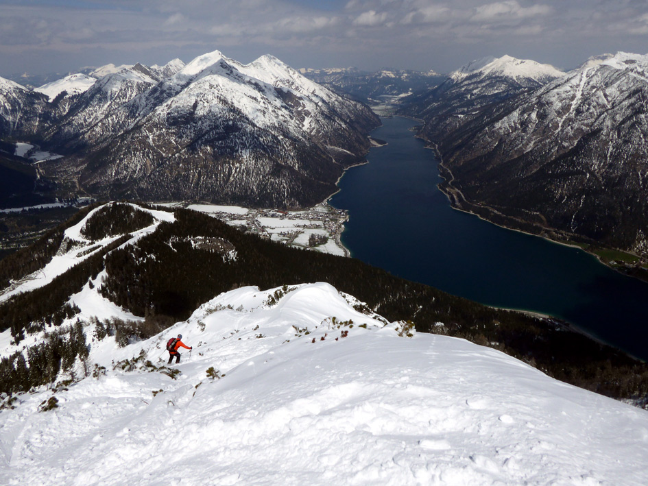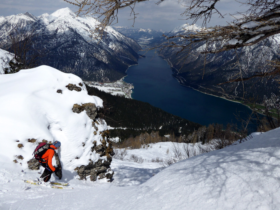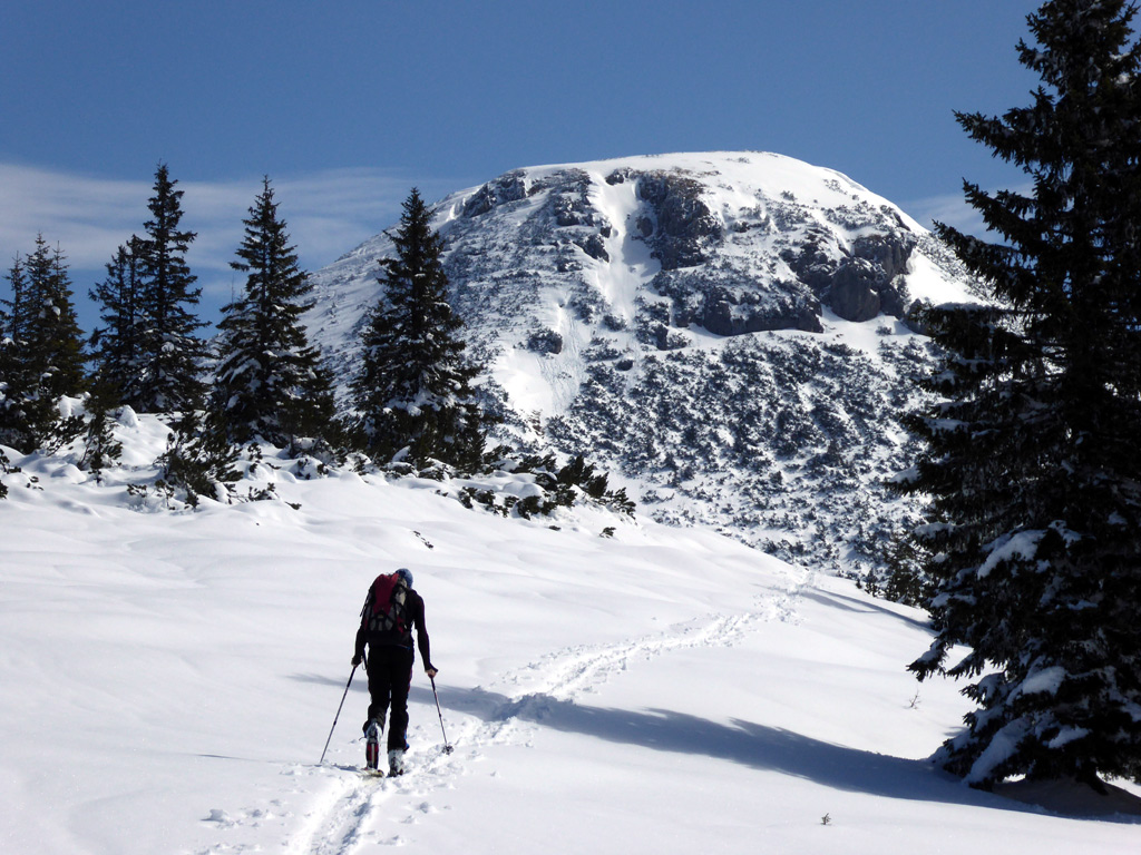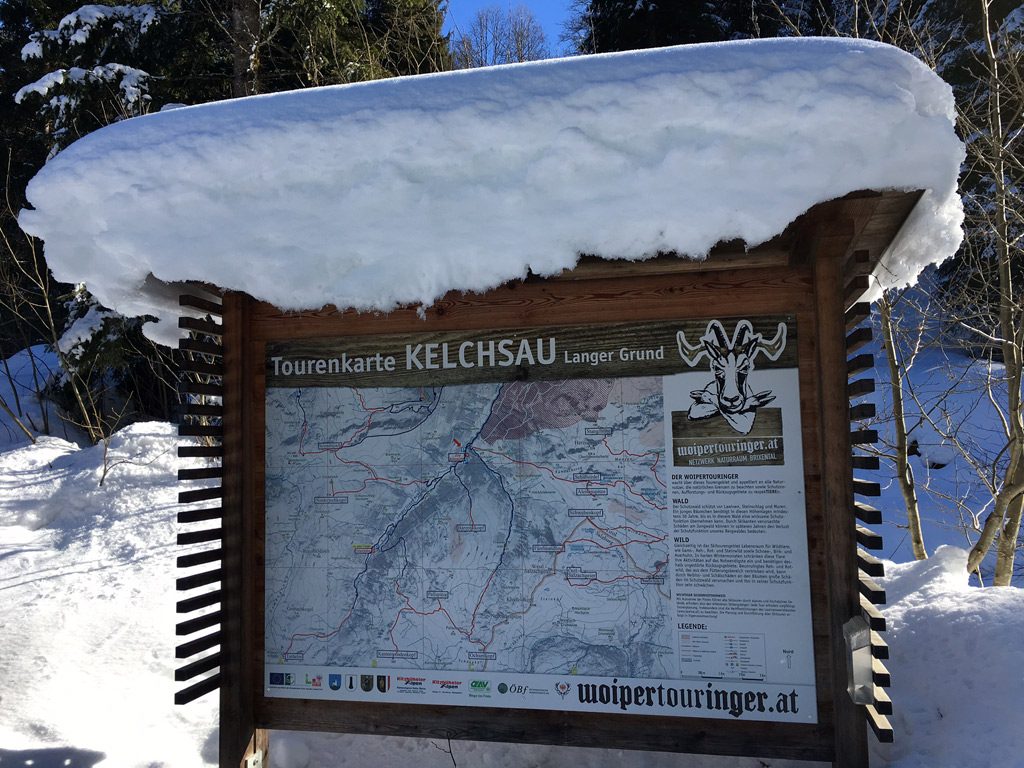 Gefahreneinschätzung: LWS 1, Lawinengefahr weitgehend gering. In den Steilpassagen oberhalb vom Rothörlsattel (wir haben den Klettersteig links umgangen) ist der Neuschnee nur mäßig mit der festen Altschneeunterlage verbunden - dadurch vor allem im Aufstieg Abrutschgefahr in der Nähe von Felsabbrüchen, mehrmals haben wir sicherheitshalber die Skier auf die Rucksäcke geschnallt.