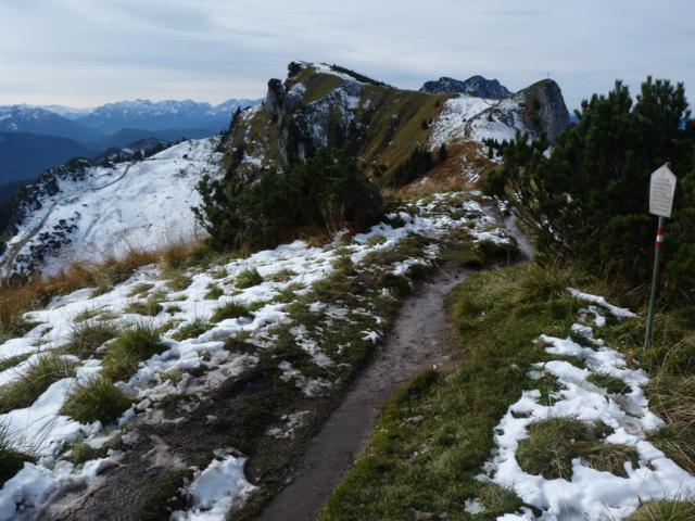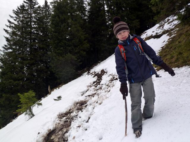 Tourenverhältnisse: Die Schneereste vom Montag tauen sekündlich weg. Der Höhenweg vom Brauneck zum Latschenkopf ist problemlos begehbar, ebenso der Steig hinunter zur Stie-Alm. Gute Verhältnisse auch im Klettergarten oberhalb der Stie-Alm: Felsen und Zustiege sind dank Süd-Exposition trocken. Ich hatte heute extra Bergschuhe angezogen, aber es wäre auch locker mit Halbschuhen gegangen.