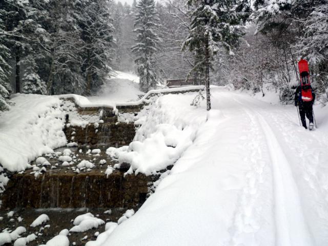 Gefahreneinschätzung: Lawinengefahr im Bereich der Aufstiegsspur gering; Sturzrisiko bei unerwartetem Steinkontakt im mittleren und unteren Teil der Forststraße.